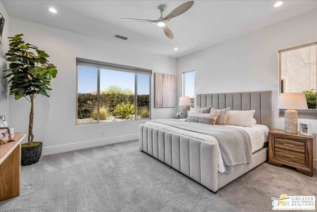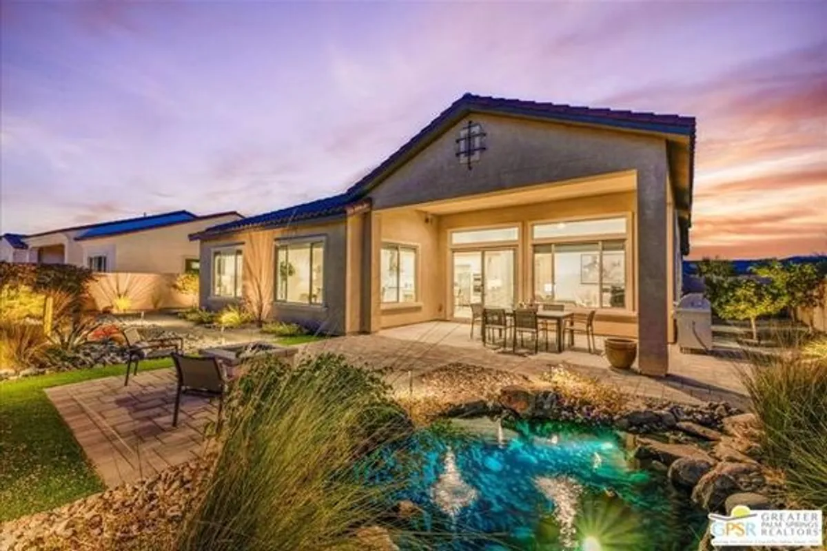 Discover a fresh opportunity to enjoy resort-style living in the heart of Del Webb Rancho Mirage, the desert's premier 55+ community. This beautifully reintroduced Tuscan-style Phase 5, Plan 8 Serenity home captures sweeping mountain views and blends timeless elegance with modern comfort - all enhanced by OWNED SOLAR and thoughtful upgrades throughout. Inside, the open-concept layout features three bedrooms, a versatile den/office/media room, and two baths - designed to balance relaxation and entertaining with ease. Rich porcelain wood-look tile flooring, elegant 7" baseboards, custom window treatments, and designer ceiling fans bring warmth and sophistication to every space. The chef's kitchen takes center stage with an upgraded KitchenAid appliance suite - including a built-in refrigerator - 42" upper cabinets with crown molding, and a grand executive island offering extra storage, power outlets, and luxurious double-thick quartz countertops. Wake up to breathtaking mountain vistas from the light-filled primary suite, featuring a spa-inspired bath with quartz dual vanities, sleek fixtures, and a custom-tiled walk-in shower. A generous walk-in closet completes this serene retreat. The guest wing and den are ideally separated, providing comfort and privacy for visiting friends and family. Step outside to a stunning, fully landscaped backyard oasisperfect for year-round desert living. Enjoy panoramic mountain views, gather around the built-in firepit, or unwind beside the tranquil custom pond and water feature. Additional highlights include a central vacuum system, air-conditioned oversized garage with overhead storage, EV charging outlet, and more. Within the exclusive gates of Del Webb Rancho Mirage, you'll have access to an impressive array of amenities -from the resort-style pool and spa to tennis, pickleball, bocce ball, fitness facilities, and a vibrant social calendar. Experience a new chapter of luxury, lifestyle, and community living - right here at Del Webb Rancho Mirage.