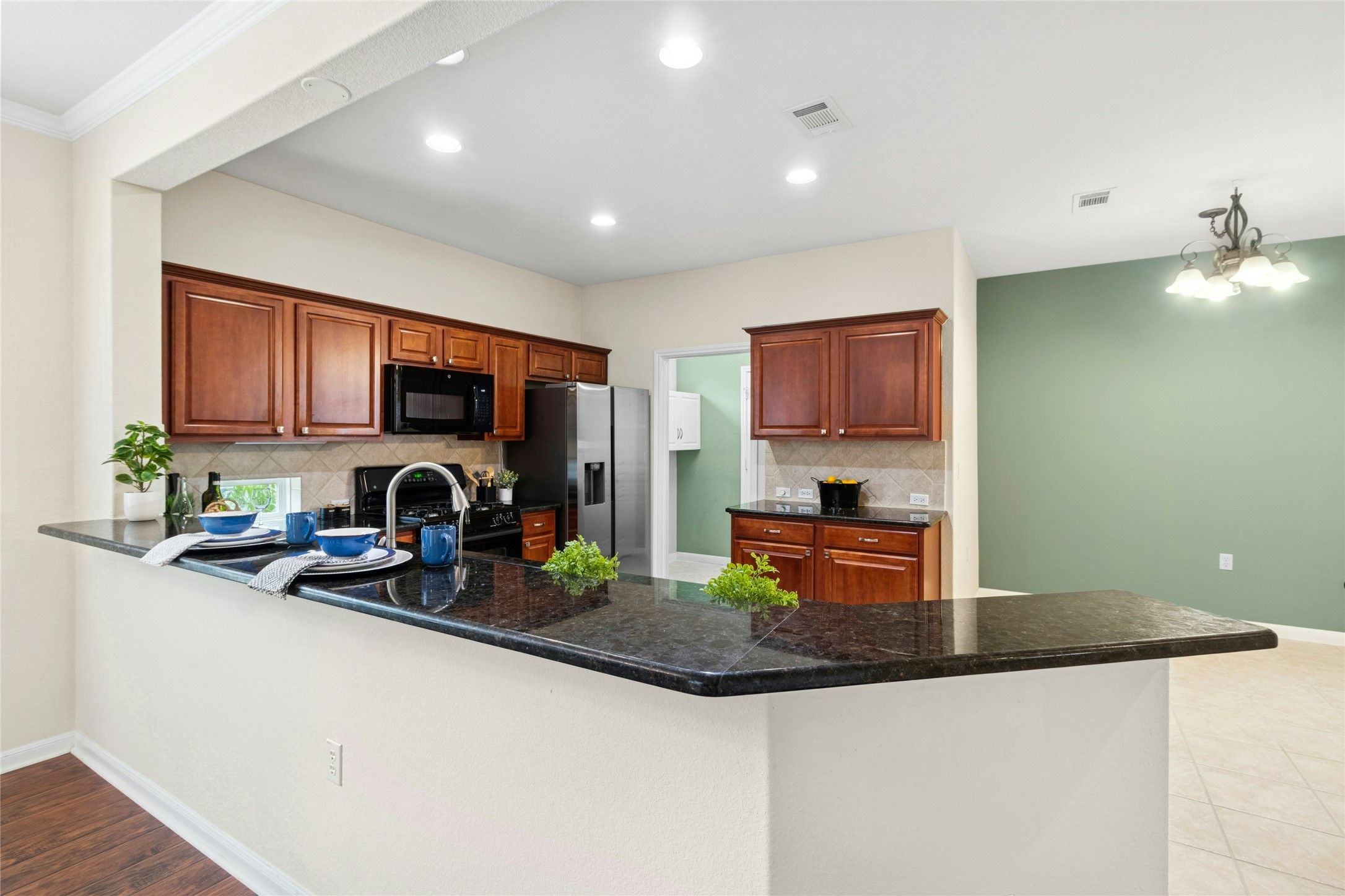 - Breakfast Bar, Bookcases, Built-in Features, Ceiling Fan(s), Crown Molding, Separate/Formal Dining Room, Double Vanity, Entrance Foyer, Granite Counters, Multiple Dining Areas, Main Level Primary, NoInteriorSteps, Open Floorplan, Pantry, Recessed Lighting, Soaking Tub, Walk-In Closet(s)