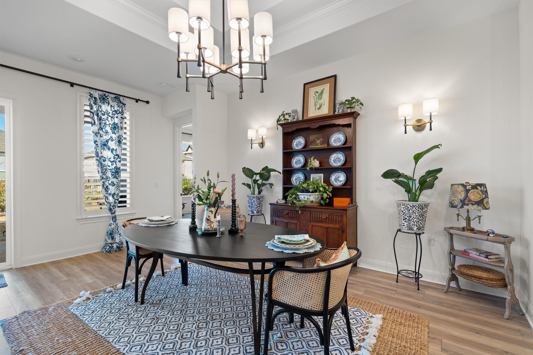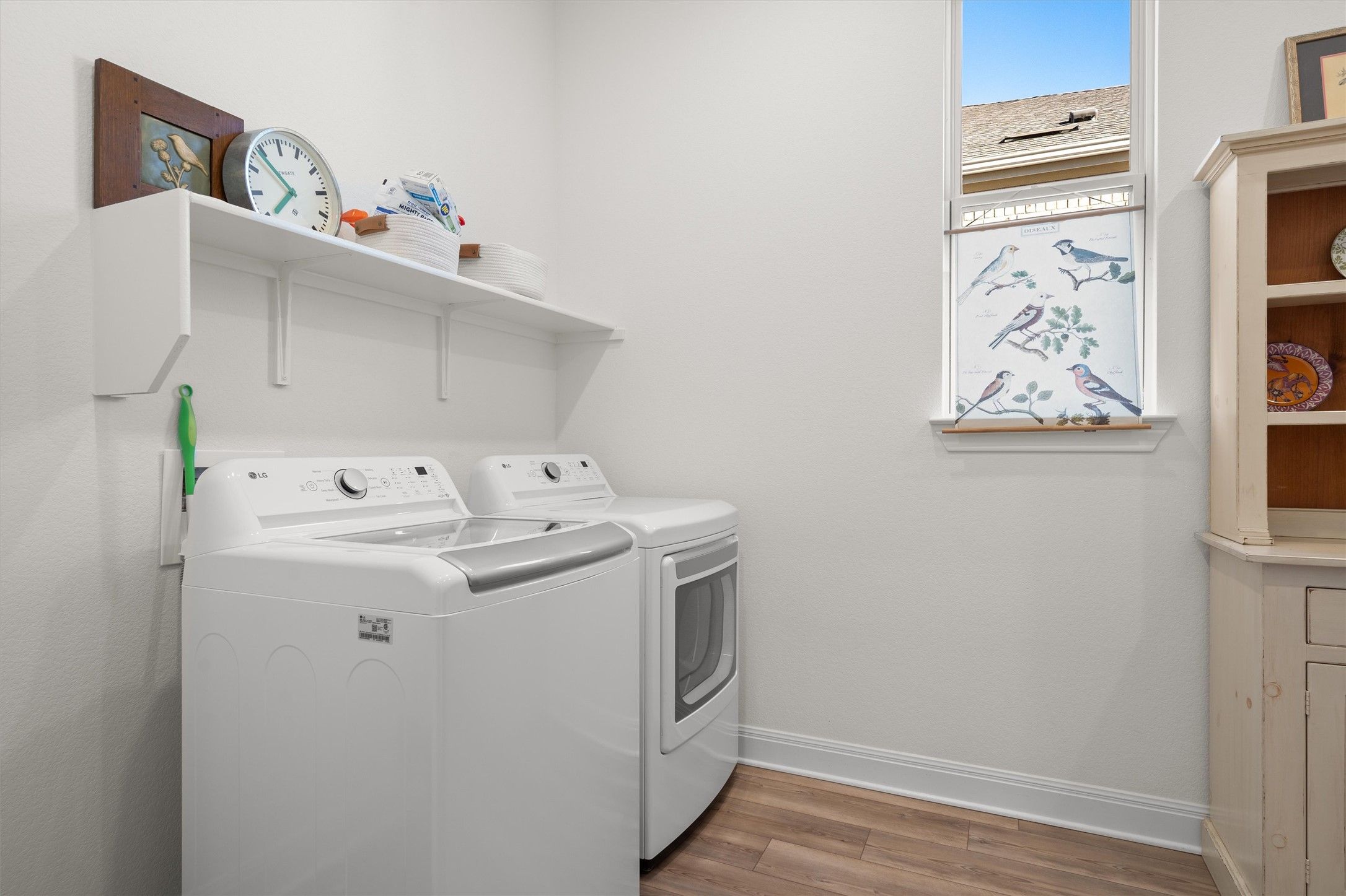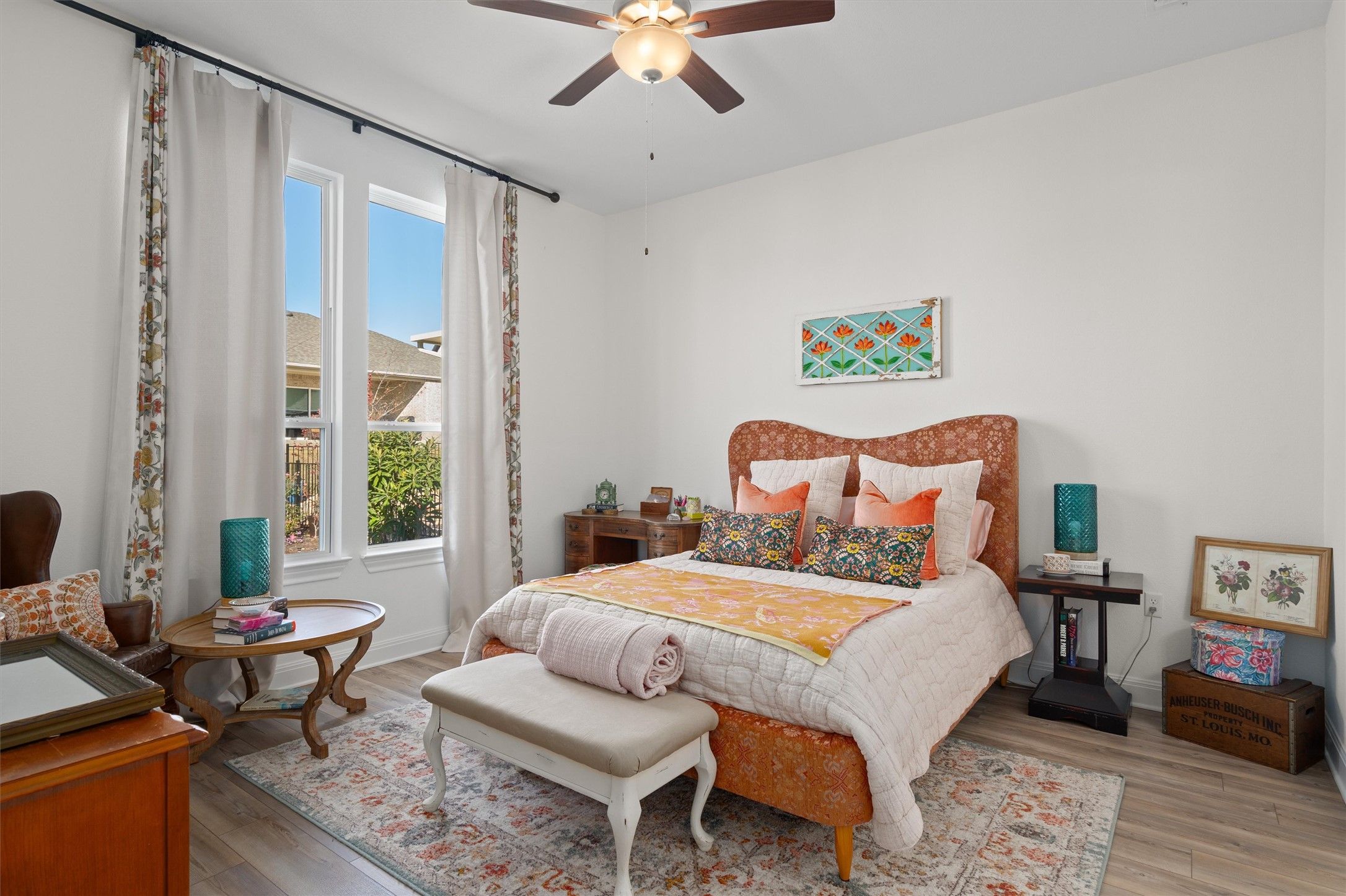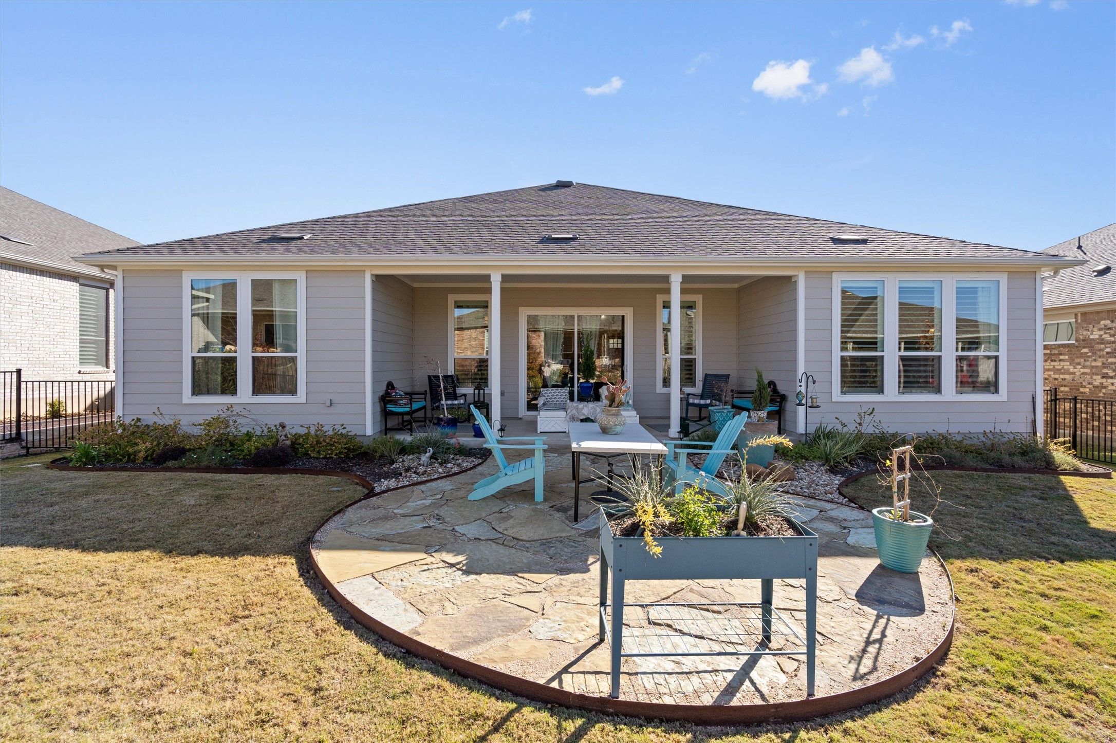 Come home to this delightful Stardom home. Tastefully decorated with luxury vinyl floors throughout and tile in the bathrooms-No Carpet. White cabinets makes this kitchen so modern with Quartz counters, SS appliances, classy backsplash and glass pendent lights over the large island. Large oversized pantry in the kitchen is a dream. Exciting kitchen beverage center that can be for your favorite spirits, with a small refrigerator or can be coffee bar. Plantation Shutters added throughout. Living Room has Tray Ceiling with crown molding with upgraded light fixtures and fans. Custom Bookshelves added to living room for extra storage. The Stardom is a great dual primary bedroom home with both bedrooms having large bathrooms and closets. Primary Bedroom has tray ceiling with fan already installed. Main bathroom is upgraded to a tile walk-in shower and framed mirrors. There are 2 bedrooms plus the Study/Office that makes for 3 rooms. The laundry room is more than just laundry, it is an oversized storage/flex/craft room. There is a powder bath for guest. Large oversized covered patio overlooking the lush landscaped yard that is fenced for your favorite furry friend. There is an extended stone patio to relax in the afternoon. Such a cute front porch to decorate. Built and ready for you to call home.