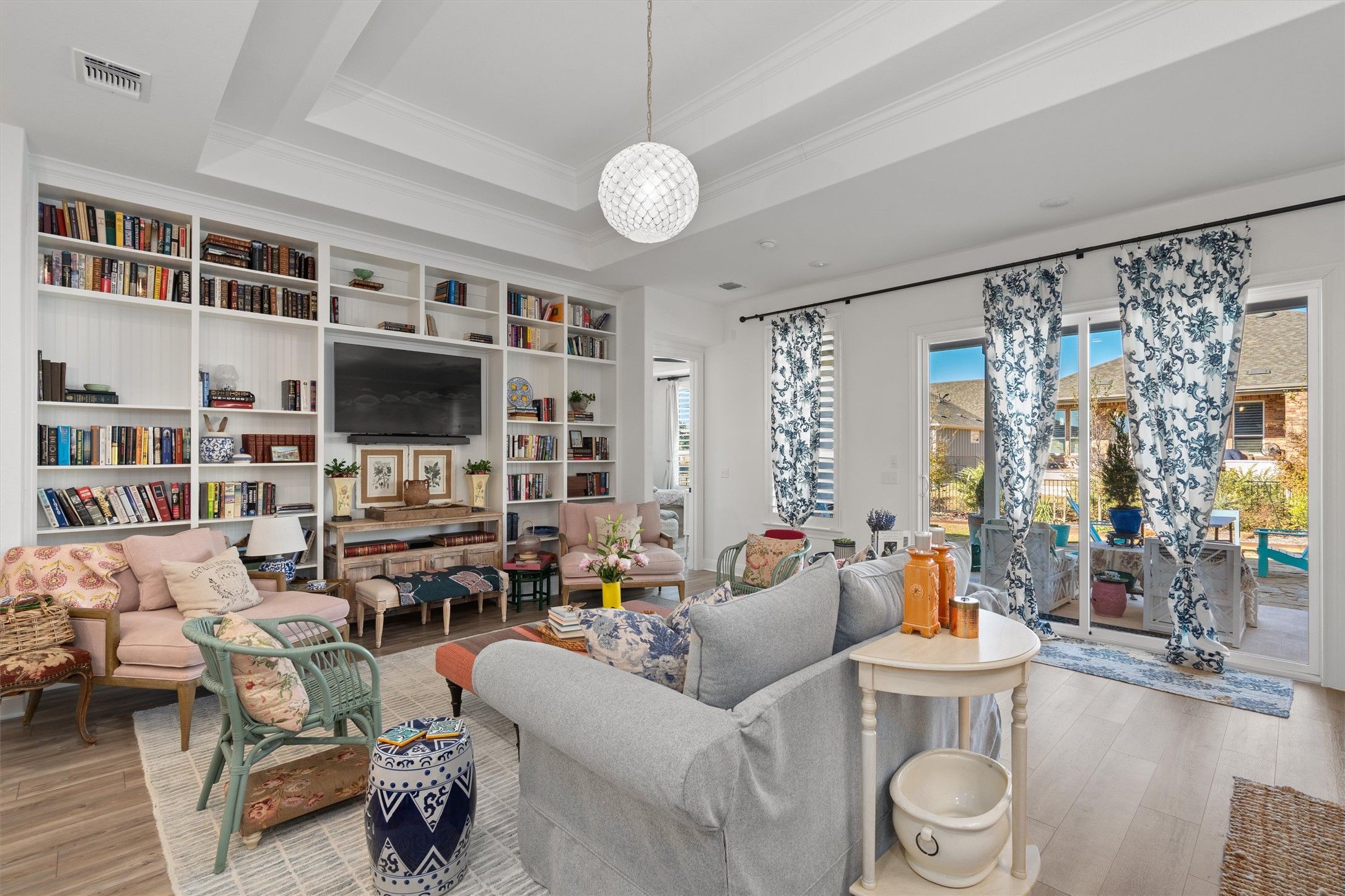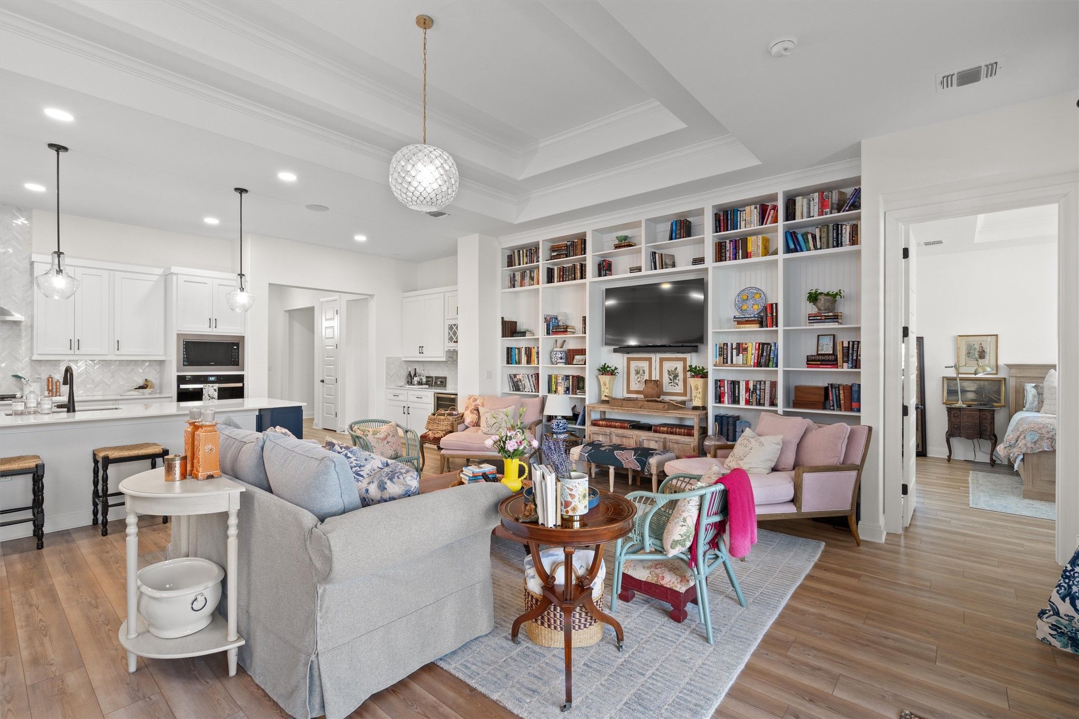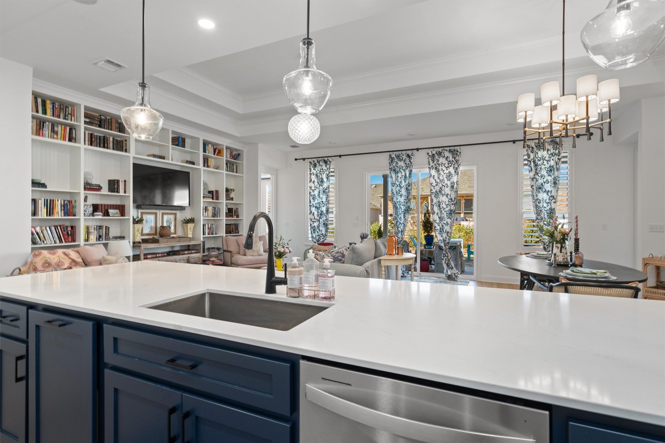 - Breakfast Bar, Bookcases, Built-in Features, Tray Ceiling(s), Ceiling Fan(s), Crown Molding, Double Vanity, In-Law Floorplan, Kitchen Island, Main Level Primary, NoInteriorSteps, Open Floorplan, Pantry, Quartz Countertops, Recessed Lighting, Study, Walk-In Closet(s)