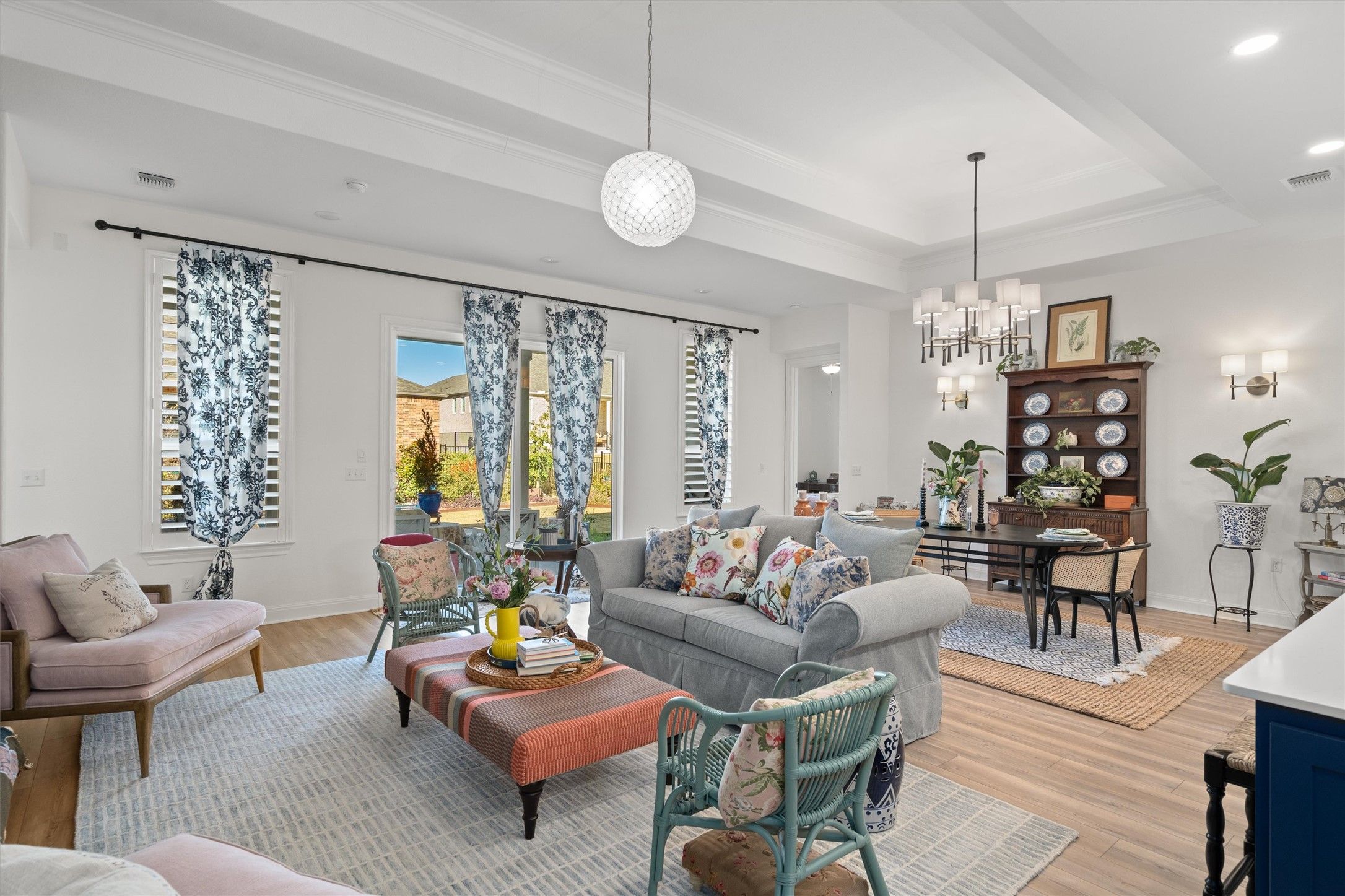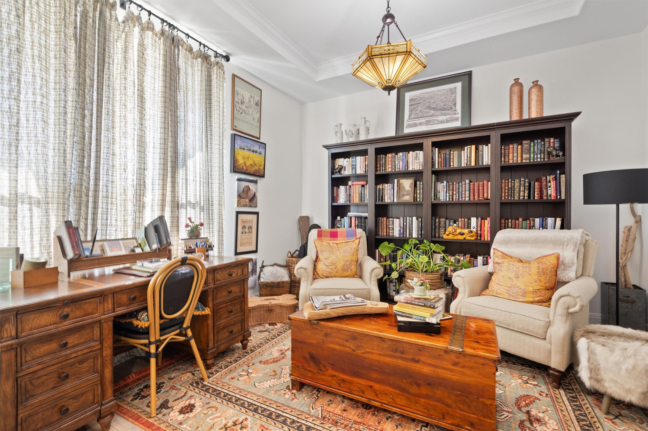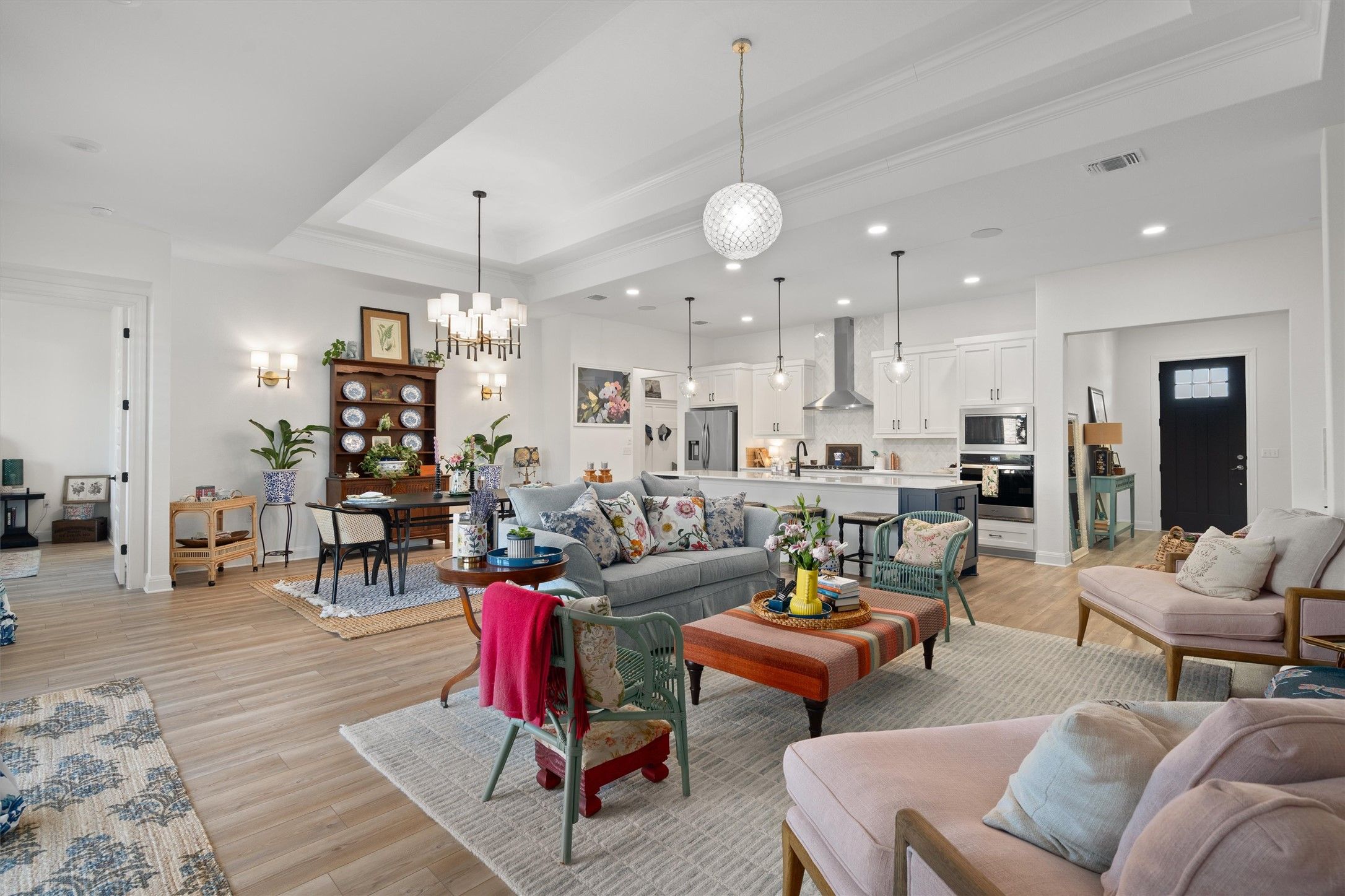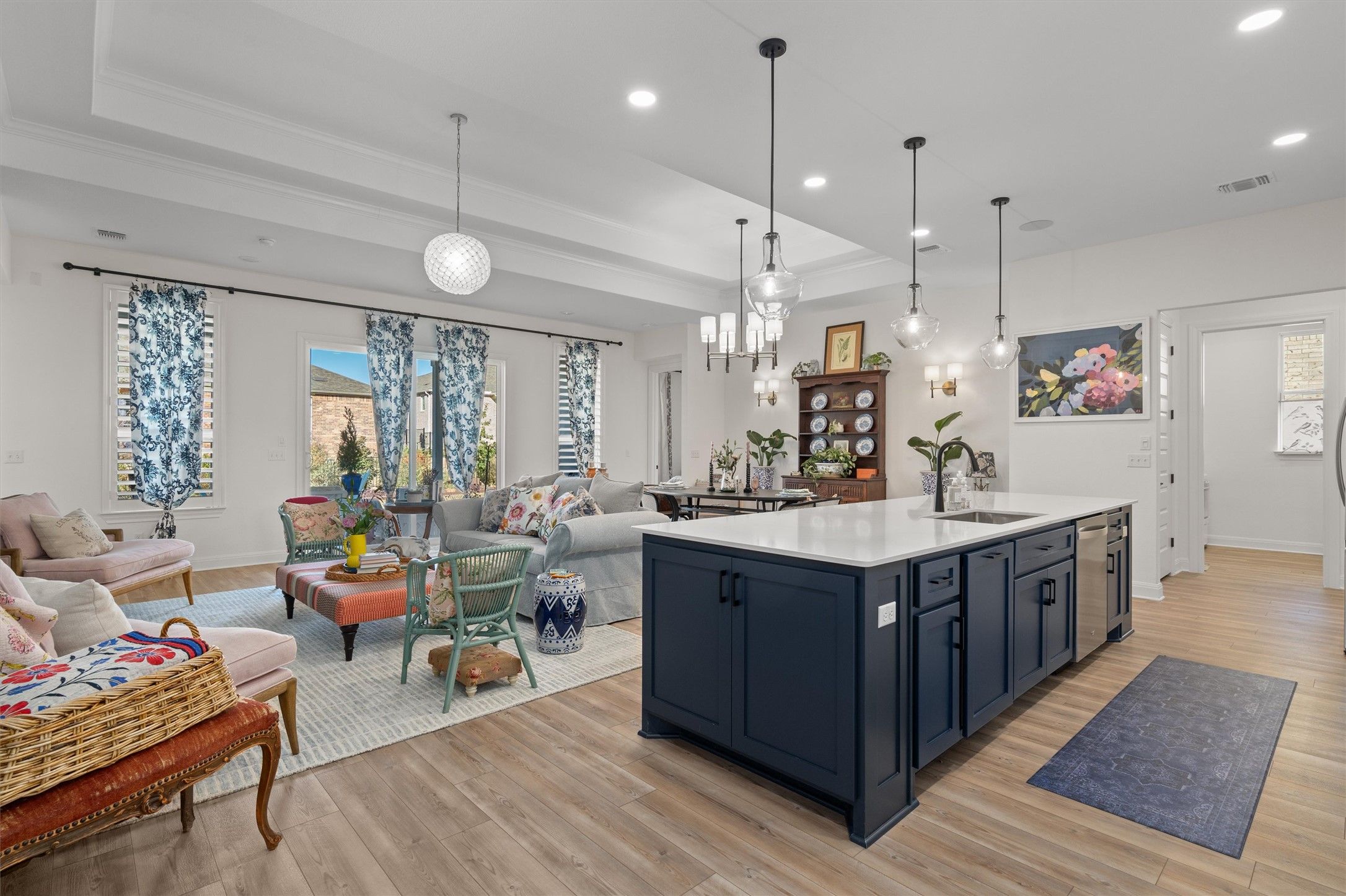 - Breakfast Bar, Bookcases, Built-in Features, Tray Ceiling(s), Ceiling Fan(s), Crown Molding, Double Vanity, In-Law Floorplan, Kitchen Island, Main Level Primary, NoInteriorSteps, Open Floorplan, Pantry, Quartz Countertops, Recessed Lighting, Study, Walk-In Closet(s)