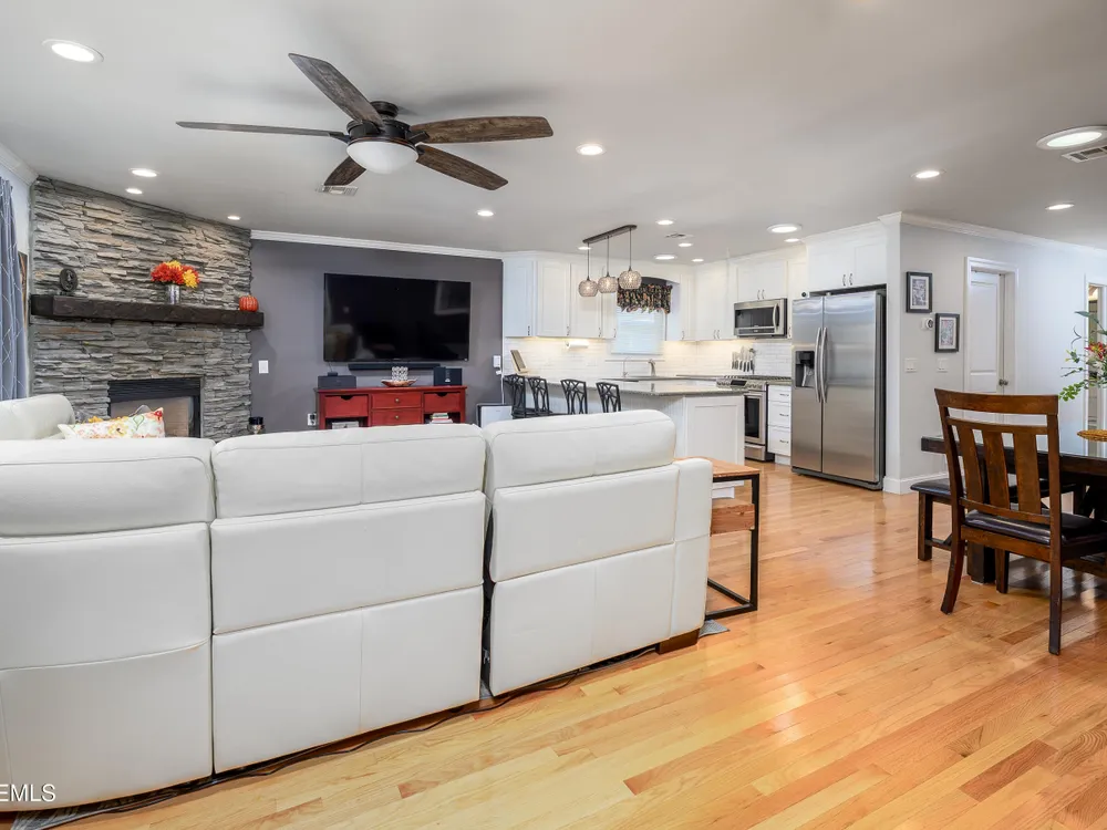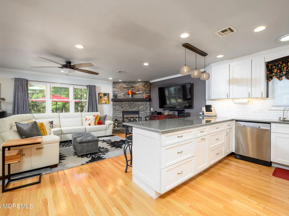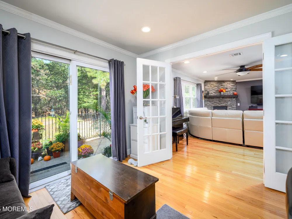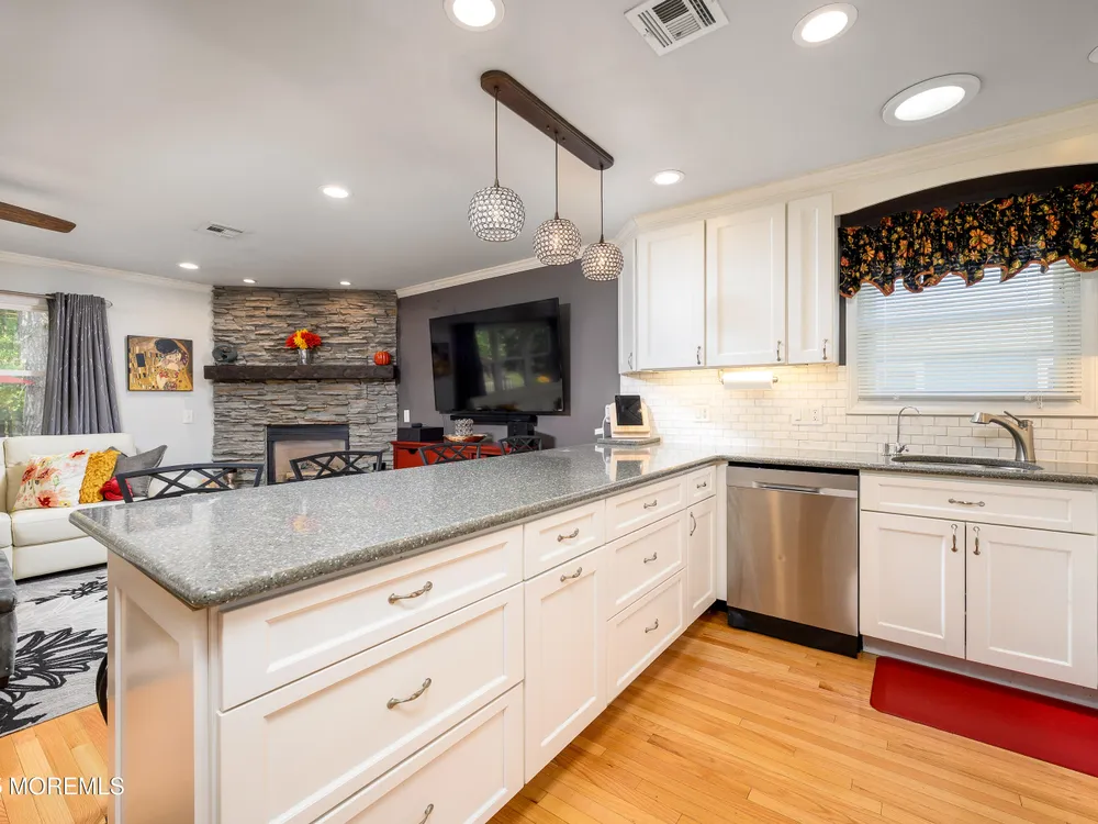Stunning with a touch of elegance. Different from all the flips these days, this home is custom designed by the owner with many special upgrades. Starting with the entry, note it is wider than others making for a spacious entry. Hardwood floors greet you and carry throughout the main living areas as do recessed lighting and crown mouldings. The gorgeous kitchen has been upgraded with beautiful, soft close cabinetry and gleaming quartz counters, a slide in stove and a reverse osmosis water filter and is open to the living and dining rooms for easy conversing. The floor to ceiling stone fireplace adds character to the living room and a lit fire adds warmth and ambiance in the cooler months. Off the living area are French doors leading to a private room that is currently used as an office but can be a hobby room, sleeping quarters or den. There is a door to the garage and sliders to the rear yard. -Bedrooms have quality custom closets for organization and ceiling fans. Both bathrooms are tastefully upgraded with appealing finishes. The exterior has pleasing updates including replaced windows, vinyl siding, new garage door and a double wide driveway. Roof and all upgrades within the last 8 years. To complete this extra special property, there is a large rear patio area for dining outdoors and a place to relax and appreciate the tranquil, scenic woods that change with the seasons. Patio is fenced, which is great if you have a pet and to keep the wildlife from approaching. A must see for discriminating buyers.