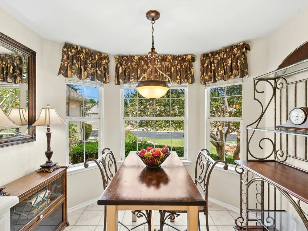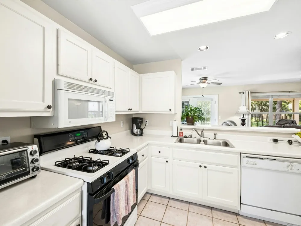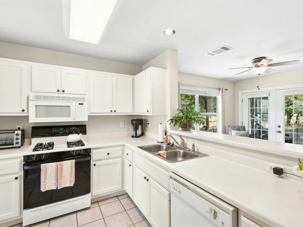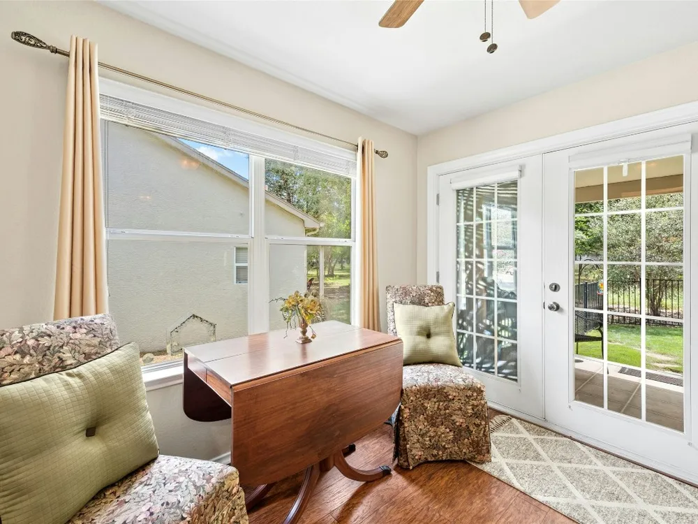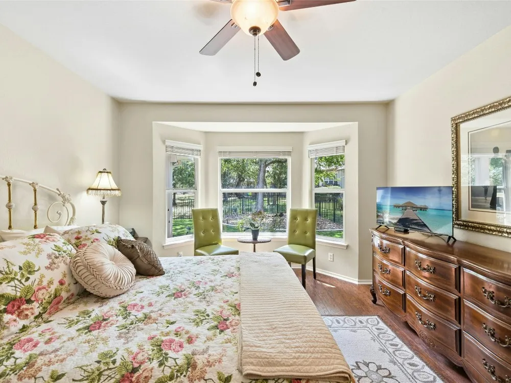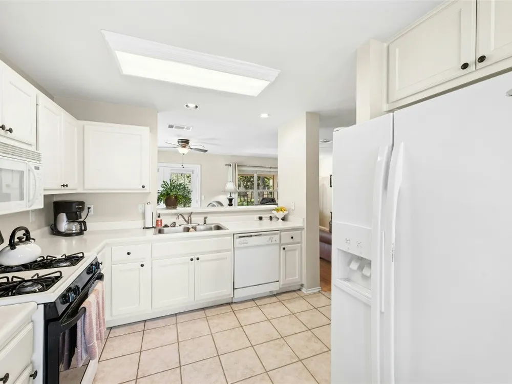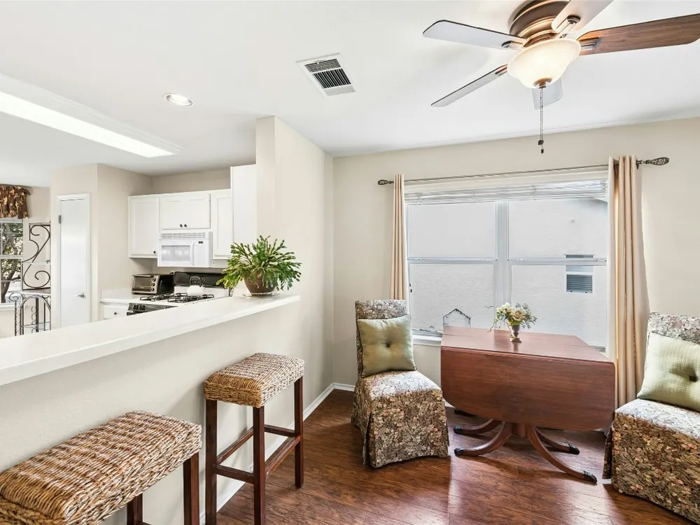 A cozy “Berry” floor plan by Del Webb set on an oversized lot backing to a peaceful Sun City pocket park greenbelt. The cheerful kitchen features a bay-window breakfast nook, gas range, built-in cabinets, and a handy breakfast bar—perfect for morning coffee or casual meals. French doors open to a charming covered back porch overlooking the south-facing, fully fenced backyard. The main bedroom offers its own bay window with private greenbelt views. Easy-care living with no carpet—wood-look Shaw brand vinyl and hard tile flow throughout. A kitchen-level garage (no steps) includes floor-to-ceiling storage, plus a decked attic for even more space. Recent updates include a 2022 roof and 2018 water heater for peace of mind.