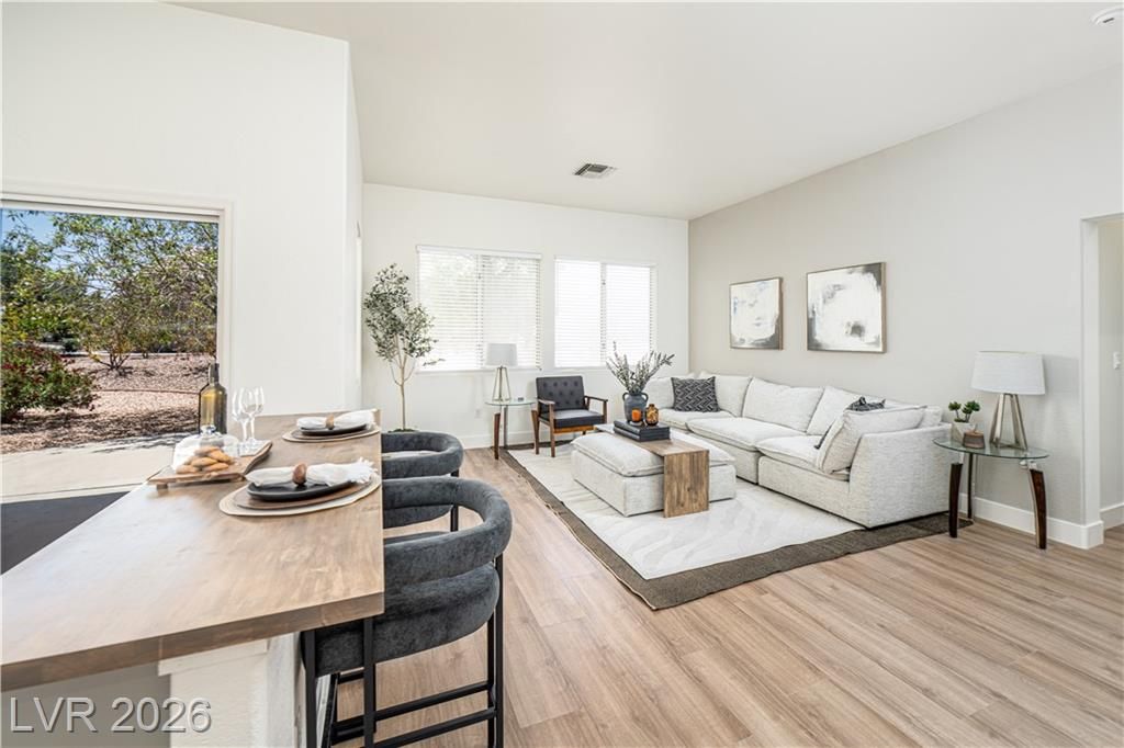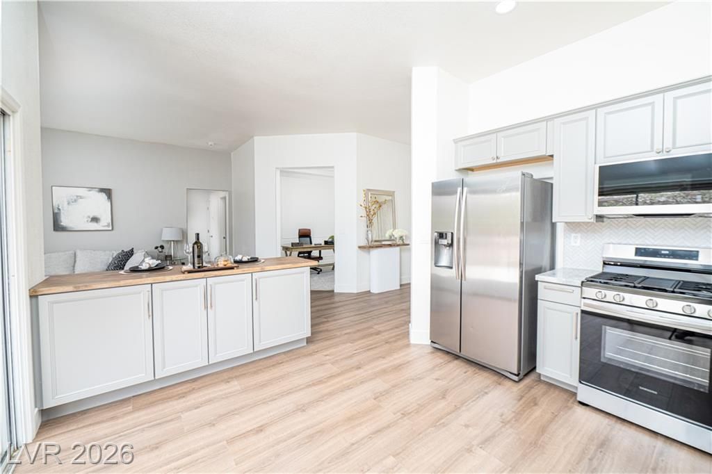 This renovated Sun City Summerlin home feels warm, modern, and instantly welcoming. Sitting on a quiet corner lot, this 2-bedroom home with a den was reimagined to create an open, easy flow the moment you walk in. Fresh neutral paint and oak-style vinyl flooring give the space a calm, updated feel. The kitchen is a true highlight—sleek taupe cabinets, marble countertops, herringbone backsplash, and a full stainless steel appliance package. The butcher-block island opens to the living area, making it a natural gathering spot for cooking, conversation, and everyday life. The primary suite is tucked away for privacy and feels like a personal retreat with its spacious walk-in closet and spa-inspired bath featuring a custom tile shower, LED-lit mirror, and double vanity. Effortlessly stylish and thoughtfully updated, this home is ready for its next chapter.
