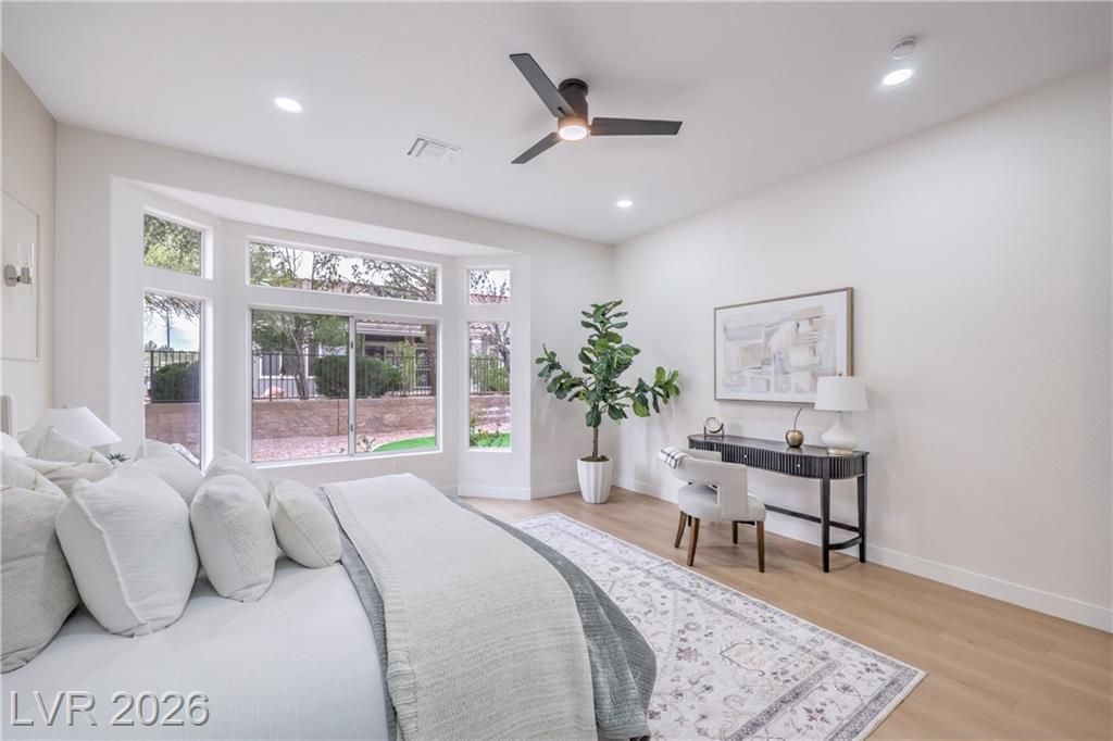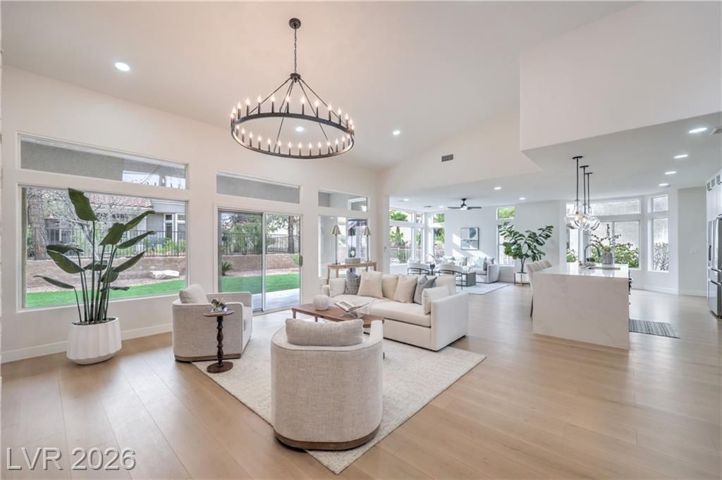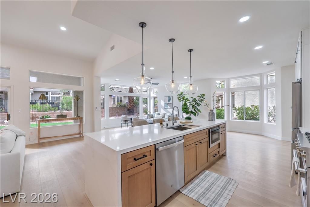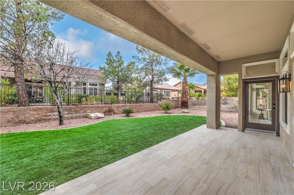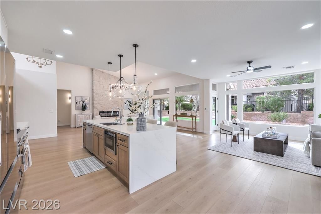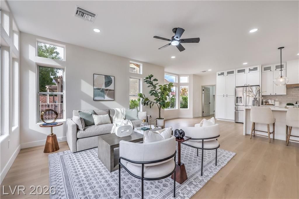 Located in the sought-after 55+ Sun City Summerlin community, this move-in ready residence is minutes from Boca Park and Downtown Summerlin’s premier shopping, dining, and entertainment. Residents enjoy access to golf, pool and spa, clubhouse, racquetball and handball courts, and established CC&Rs. This stylish 3-bedroom corner-lot home offers a covered backyard patio and an open, light-filled floor plan with high ceilings, laminate wood flooring throughout, modern lighting, ceiling fans, and a dramatic floor-to-ceiling tiled fireplace. The chef-inspired kitchen features white shaker cabinetry, custom countertops with black hardware, a contemporary tile backsplash, recessed lighting, stainless steel appliances, and a waterfall-edge island with seating. Spa-like bathrooms include dual vanities with framed mirrors, designer lighting, and spacious walk-in showers with rainfall showerheads and built-in niches. Designed for comfort and style, and ready for immediate enjoyment!