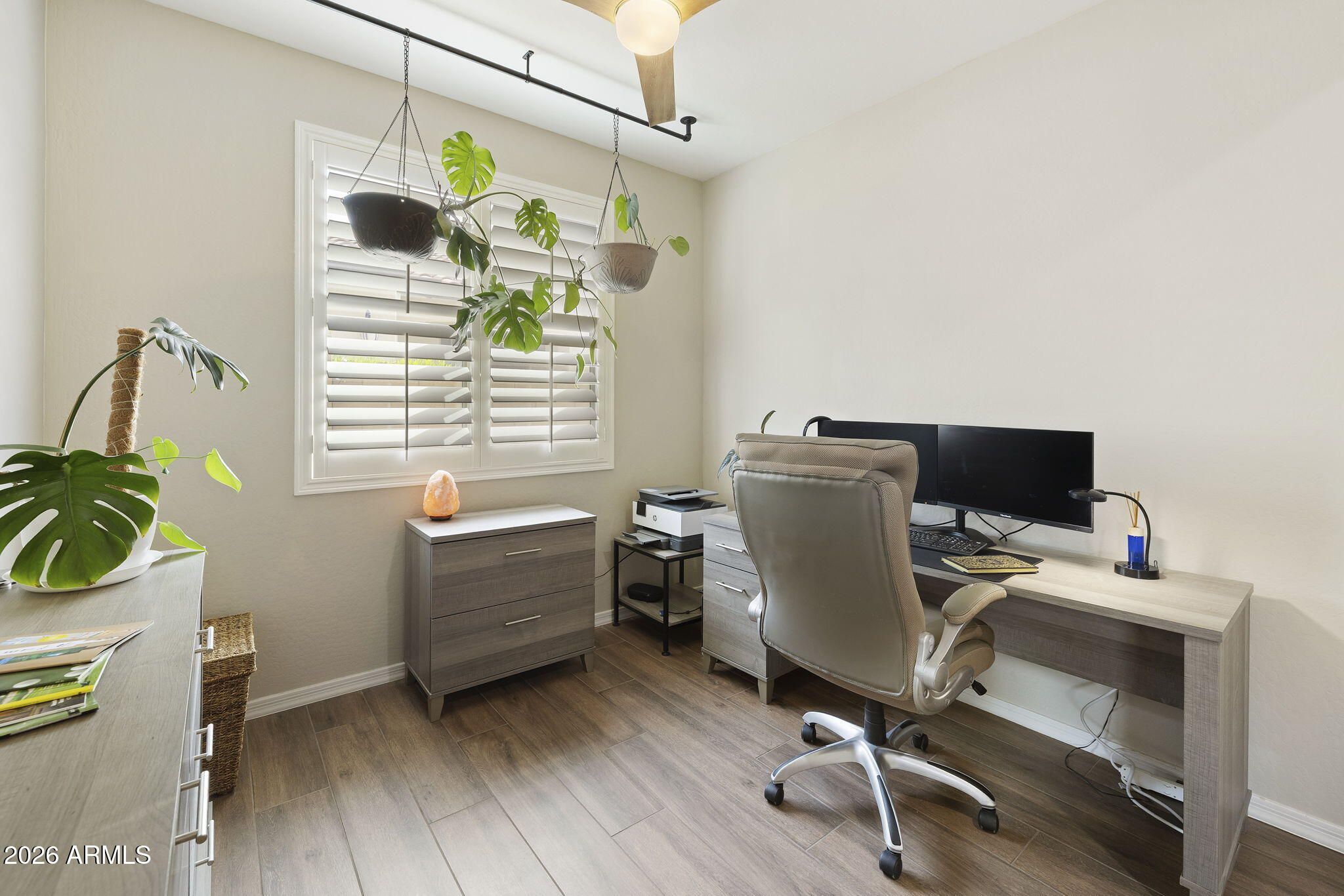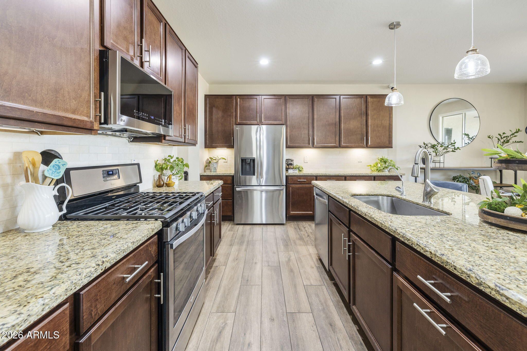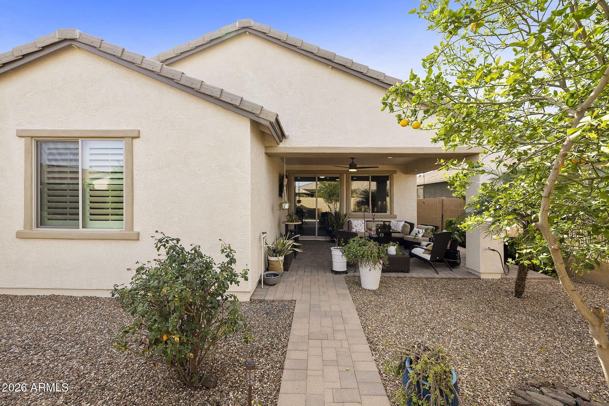 The Charleston floor plan features a well-designed split layout with 2 bdrms, a den & a great rm. As you enter you will appreciate all the light from the upgraded bevel front door & the solar tube at the entry. The welcoming great rm offers a ship-lap wall with electric fireplace & sound bar, adding a stylish touch. The primary suite boasts a barn door at en-suite bath with a W-I shower + bench, a W-I closet, a raised vanity with dble sinks, & a private water closet, providing a luxurious retreat. The 2nd bath features an insulated tub with a tile surround & a reconfigured W-I closet at the bdrm. The kitchen is equipped with 42'' maple cabinets, a solar tube over a lg island, granite countertops, a gas stove, SS single sink & goose neck faucet along with W-I pantry making it a functional efficient space. The home also includes shutters on most windows & upgraded wood looking tile except in bdrms. The yard was professionally landscaped, offering an extended covered patio along with an extended paver patio in the backyard. A paver driveway, & paver walkway leads to the front porch with a paver overlay. This home is ideal for those seeking a well-appointed & versatile living space with a range of desirable features. The award-winning Encore 55+ community center offers a wealth of amenities, including a workout facility, a meeting rm, a card rm, ping-pong rm , craft rm with 2 kilns, a billiard rm, & the Proving Ground Café. Encore also features pickle ball, tennis, bocci ball & lots of green space with walking trails. Encore has something for everyone with its many year-round clubs & activities.