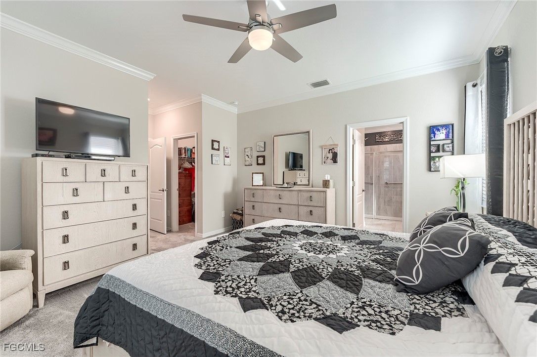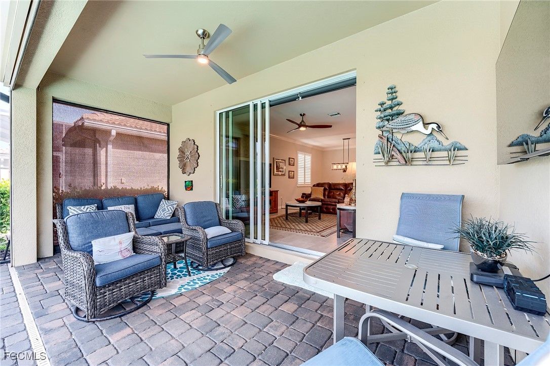 Welcome to your next dream home in paradise! Discover the popular Trevi model built by Lennar Homes, a perfect blend of luxury, comfort, and Florida living in the nationally recognized 55+ resort casual gated community of Pelican Preserve in Fort Myers. This exquisite home is a showcase of modern elegance, offering a lifestyle of relaxation and sophistication. Step inside to experience a spacious open floor plan with refined living spaces designed to flow seamlessly for entertaining and everyday comfort. The gourmet kitchen is a chef’s dream, featuring brand-new high-end appliances, granite countertops, a walk-in pantry, and abundant storage space. The serene master suite serves as a private retreat with a luxurious en-suite bathroom and a spacious walk-in closets. Thoughtful custom details elevate the home’s style and functionality, including an oversized laundry room with ample storage and workspace, three spacious bedrooms, three full bathrooms, and a versatile den with beautifully crafted built-in workspaces. Outside, an oversized heated pool, spacious paver deck with reinforced screen cage overlooks enhanced tropical landscaping and a large tranquil lake, providing the perfect setting for entertaining guests or relaxing in peaceful solitude. Additional highlights include a whole-house solar system to keep the utility bills low, extended paver driveway for extra parking, a full home water system for pristine water quality, and an exterior generator plug, easy to use Storm Smart accordion window shutters and roll down lanai hurricane screens for added convenience and peace of mind. The home also boasts new upgraded appliances with a transferrable warranty through 2028 and a meticulously landscaped yard that enhances its charm and curb appeal. Living in Pelican Preserve means access to unmatched resort-style amenities. Enjoy a robust tennis and pickleball program with teaching pros with an onsite popshop, a state-of-the-art fitness center with movement studios, a full-service spa, indoor and outdoor pools, scenic nature trails, and two on-site dining options, just to name a few of the many activities the award-winning town center has to offer. For those who enjoy hitting the links optional golf memberships are available. Conveniently located near Gulf Coast Town Center for premier shopping and dining, Southwest Florida International Airport, and the stunning Gulf Coast beaches of Sanibel, Captiva, and Fort Myers Beach, this home offers both accessibility and an unparalleled lifestyle. Don’t miss this opportunity to make 10304 Livorno Drive your new address in paradise. Schedule your private tour today and experience the luxury, comfort, and vibrant lifestyle that Pelican Preserve has to offer. Your dream home is ready let it be yours!