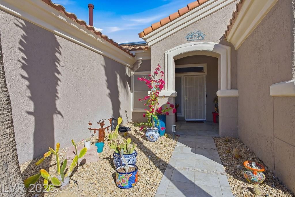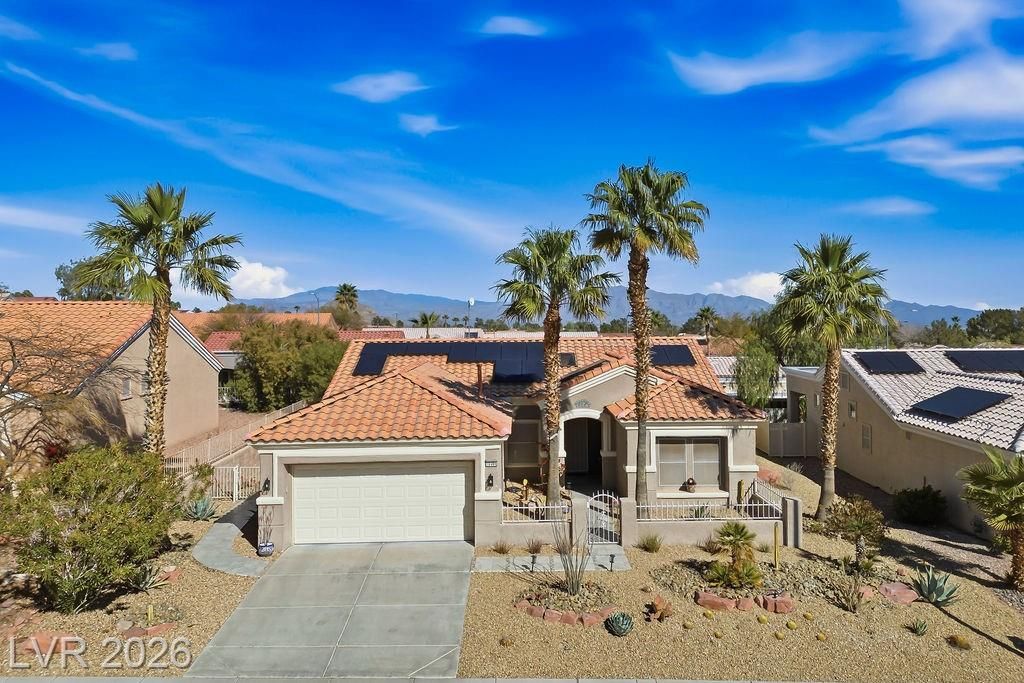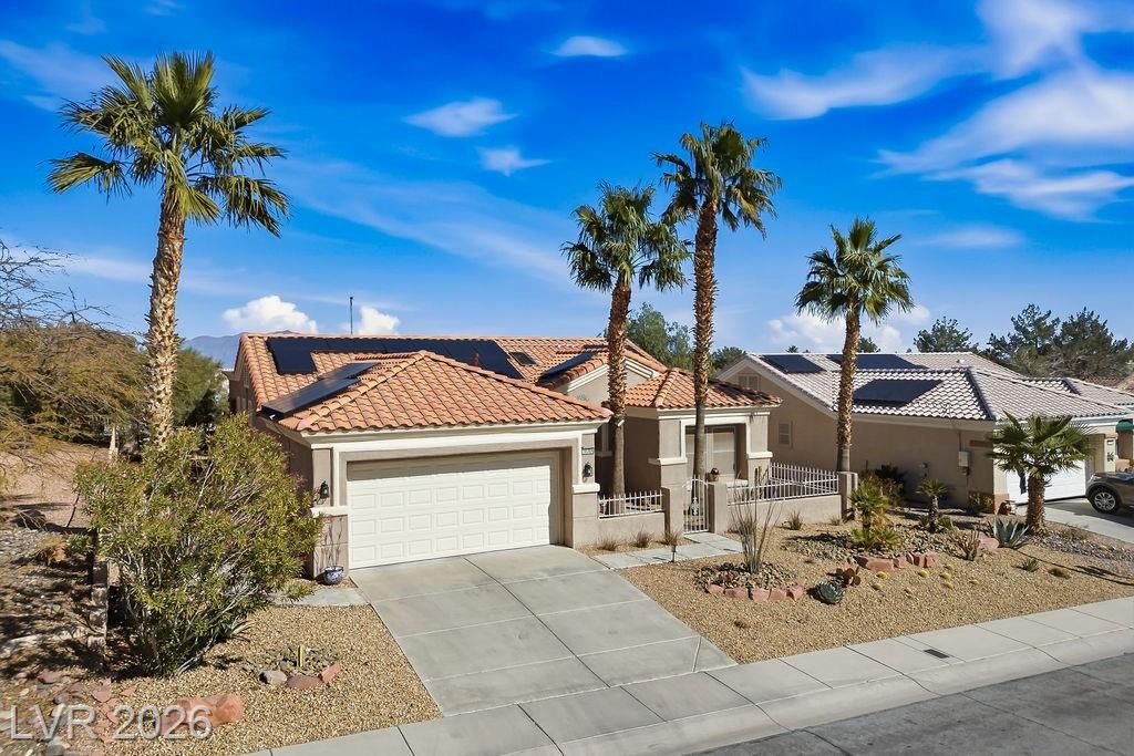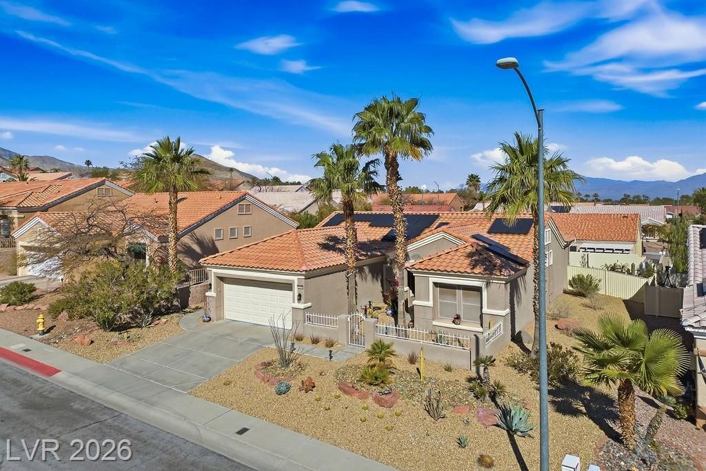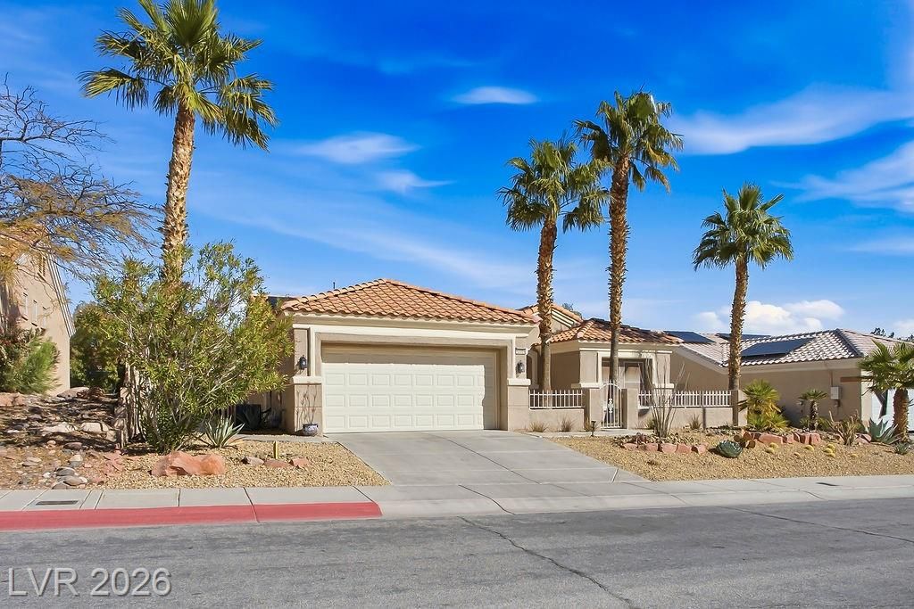 Bright and inviting 1,520 sq. ft. Royale model featuring 2 beds, 2 baths, a sparkling pool & owned solar panels. Enter through a gated courtyard into an open floor plan with designer paint, tile flooring, modern lighting & a open kitchen offering stainless steel appliances, granite counters, breakfast bar and refinished cabinetry. The primary suite has bay windows, dual vanities, walk-in shower & generous closet space. The 2nd bedroom is conveniently located near a customized full bath. Plantation shutters throughout provide soft, natural light. New HVAC System 2025! Enjoy your resort like backyard oasis with an extended covered patio, Kool-Deck–style surface, privacy screens, and well-maintained pool—perfect for year-round outdoor living. Oversized 2-car garage has golf cart parking & storage cabinets. Located in the premier 55+ community of Sun City Summerlin with 3 golf courses, 4 club houses, sports courts, many clubs and near Downtown Summerlin shopping, dining & entertainment