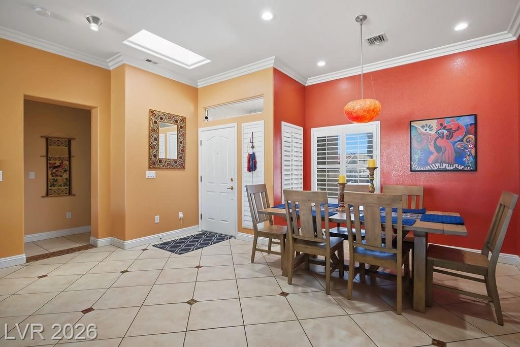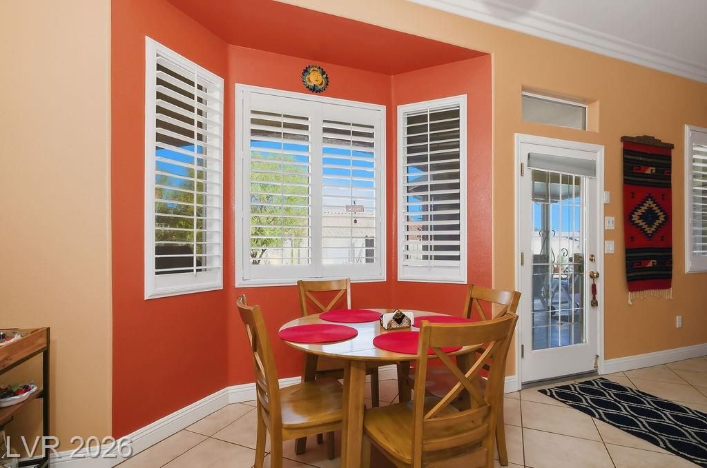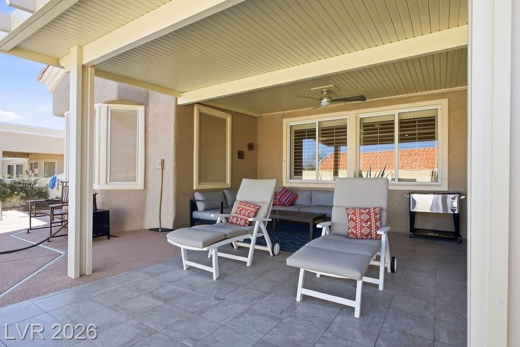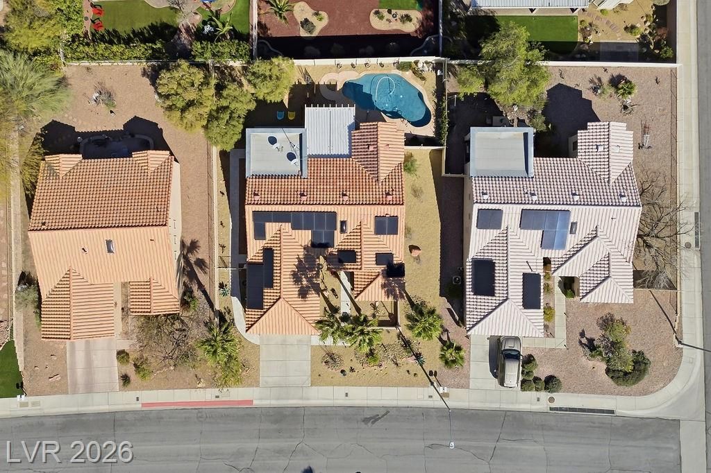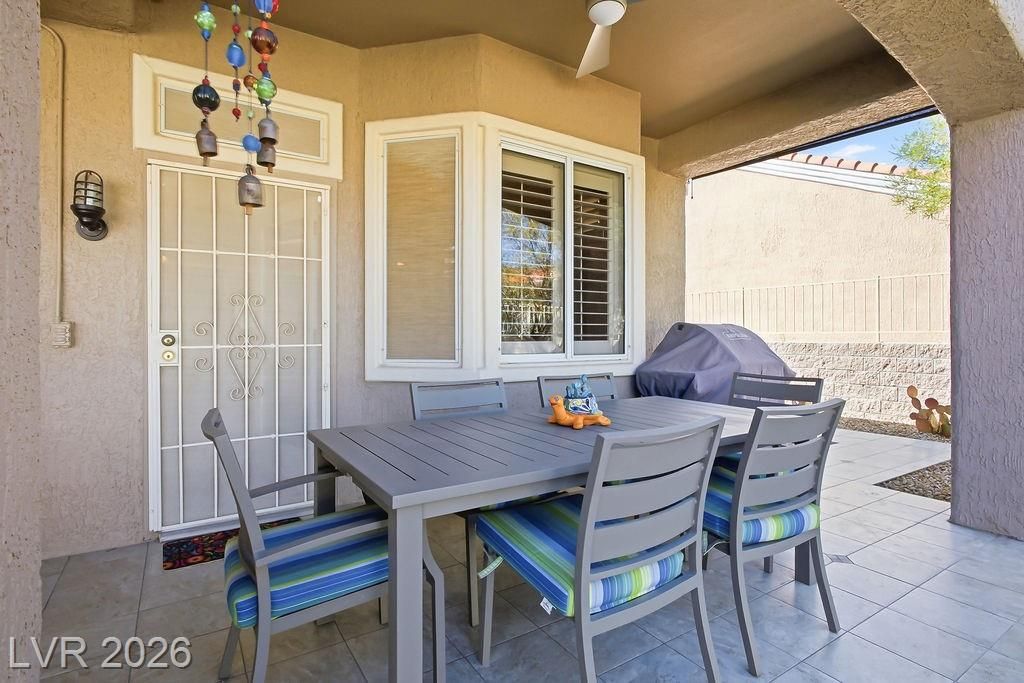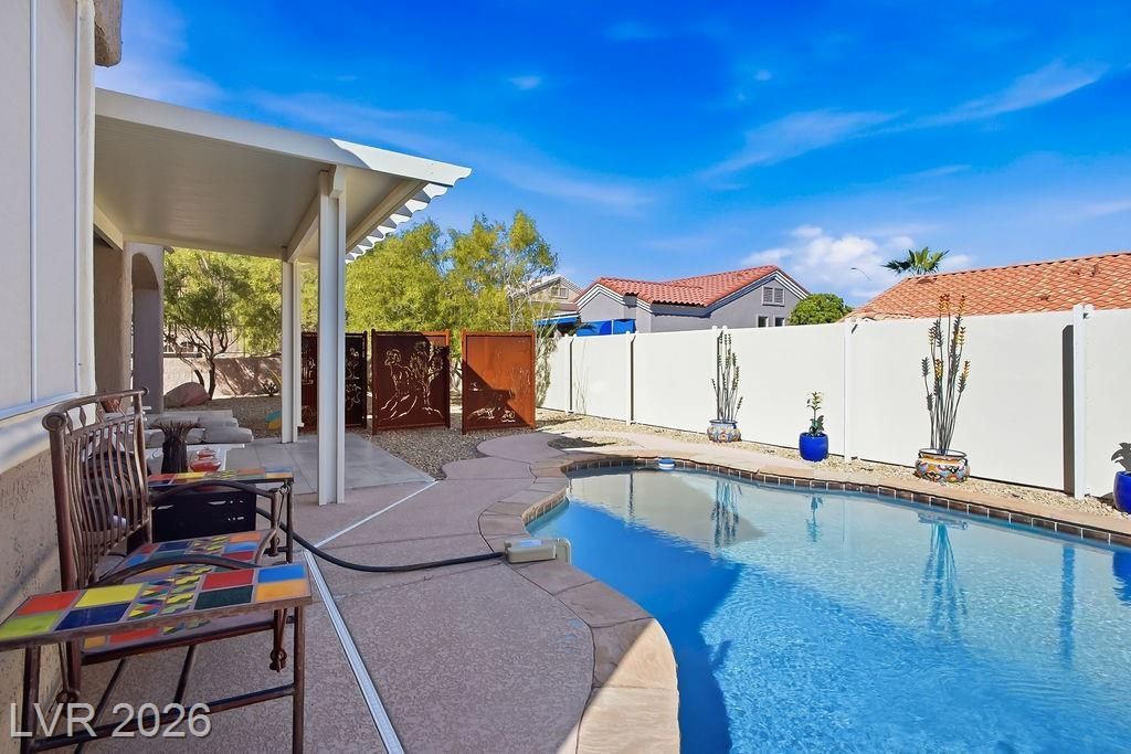 Bright and inviting 1,520 sq. ft. Royale model featuring 2 beds, 2 baths, a sparkling pool & owned solar panels. Enter through a gated courtyard into an open floor plan with designer paint, tile flooring, modern lighting & a open kitchen offering stainless steel appliances, granite counters, breakfast bar and refinished cabinetry. The primary suite has bay windows, dual vanities, walk-in shower & generous closet space. The 2nd bedroom is conveniently located near a customized full bath. Plantation shutters throughout provide soft, natural light. New HVAC System 2025! Enjoy your resort like backyard oasis with an extended covered patio, Kool-Deck–style surface, privacy screens, and well-maintained pool—perfect for year-round outdoor living. Oversized 2-car garage has golf cart parking & storage cabinets. Located in the premier 55+ community of Sun City Summerlin with 3 golf courses, 4 club houses, sports courts, many clubs and near Downtown Summerlin shopping, dining & entertainment