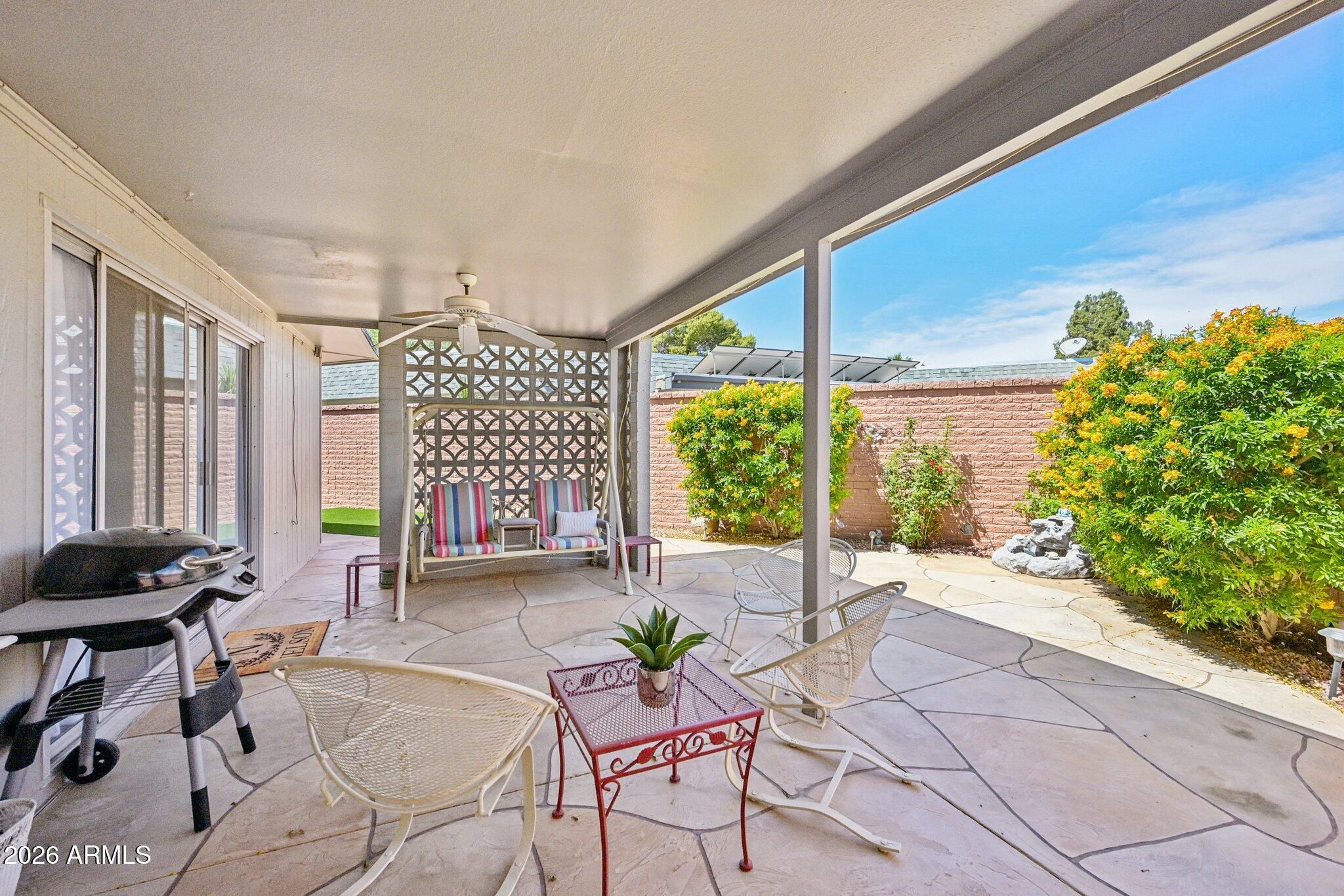 Nestled in one of Sun City's most coveted 55+ patio home communities, this beautifully maintained 2-bed 2-bath residence offers approximately 1,700 square feet of comfortable, low-maintenance living -- without sacrificing space, style, or convenience. The home delivers an updated interior & a layout designed for easy everyday living. New Interior paint March 2026, Exterior painted 2023, Roof (2022); Kitchen features granite countertops, eat in kitchen nook & direct access to the 2-car garage. Split floorplan with updated bathrooms & a generous primary suite with a walk in closet, jetted tub & sliding glass door to the Covered patio with stamped concrete, astro turf & just the perfect amount of low maintenance landscaping to enjoy your outdoor patio space & a shared seating area with a .... fire-pit between the 2 patio homes in the front yard. 2 car garage with a spacious indoor laundry room that doubles as the perfect space for a workshop or craft area. Sun City isn't just a neighborhood -- it's a resort-style community built around connection & recreation. Residents enjoy access to 8 golf courses, multiple recreation centers, indoor and outdoor pools and spas, fitness centers, tennis, pickleball, lawn bowling, chartered clubs & activities. Conveniently located near shopping, dining, Banner Boswell Medical Center & easy freeway access to downtown Phoenix & the West Valley. Homes like this -- in a true 55+ community with this footprint & these amenities -- don't stay available long.
