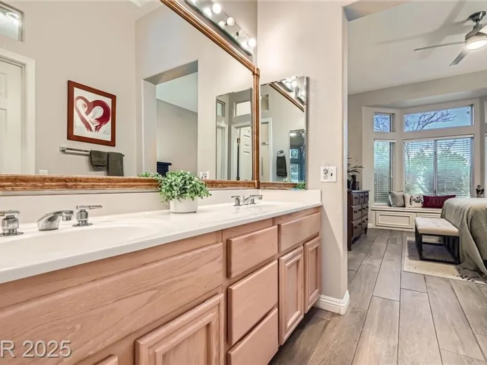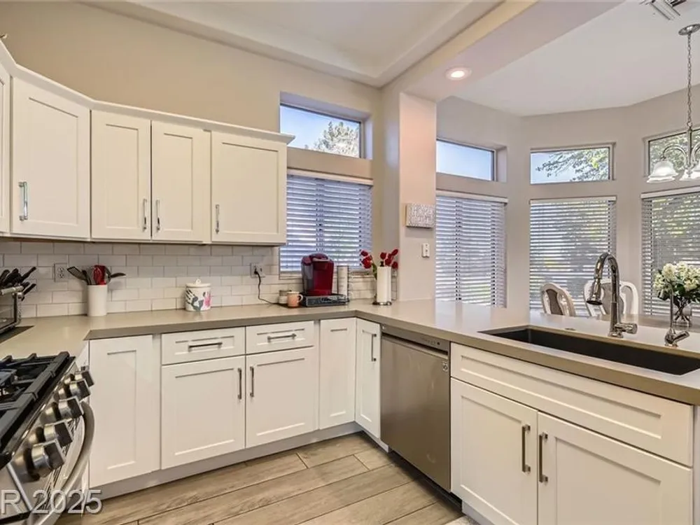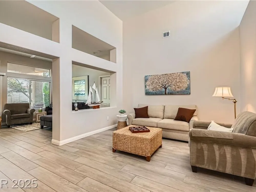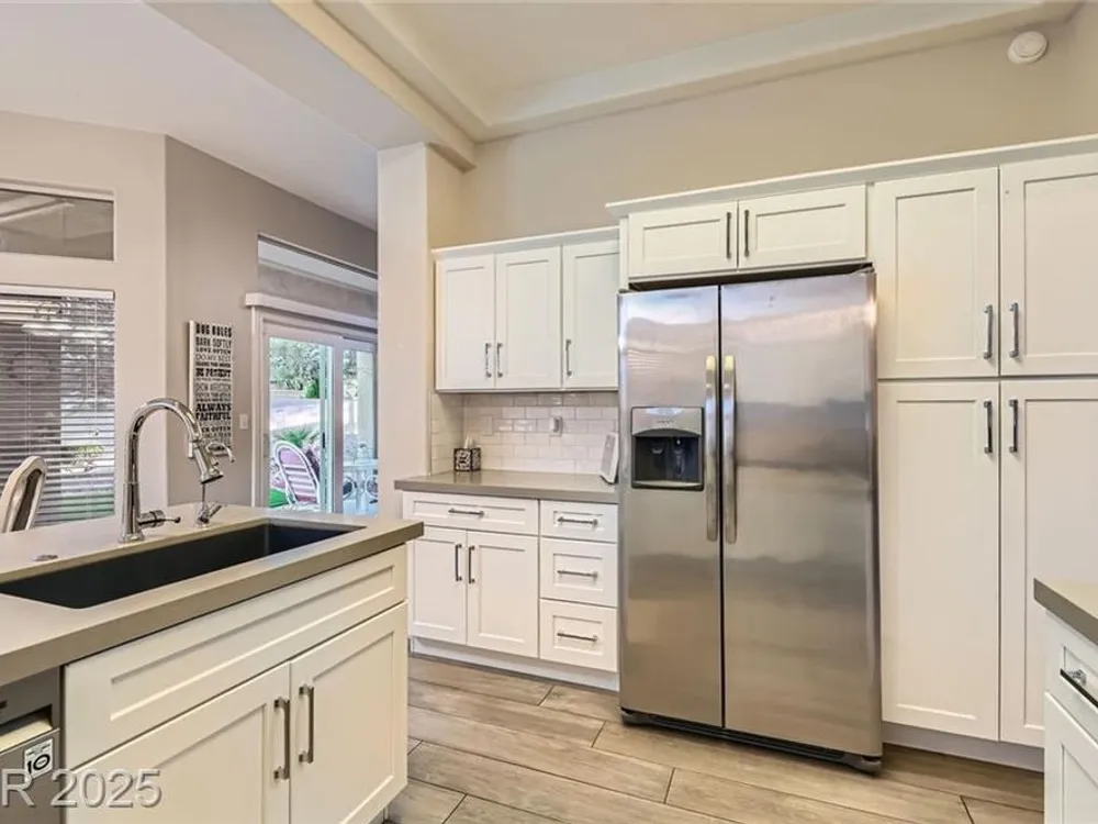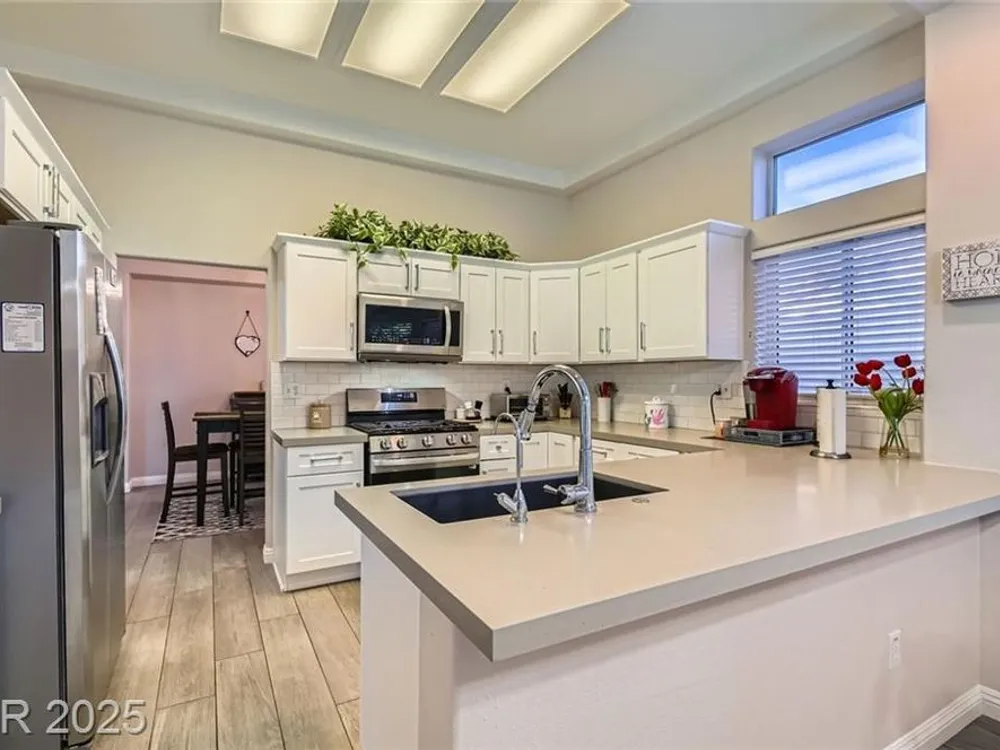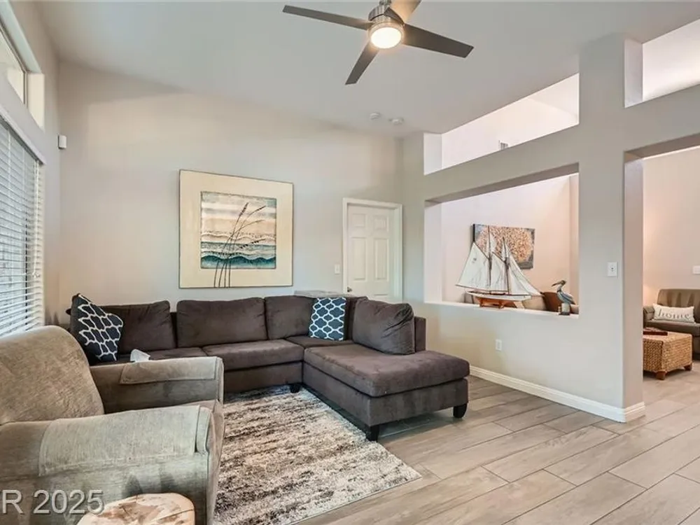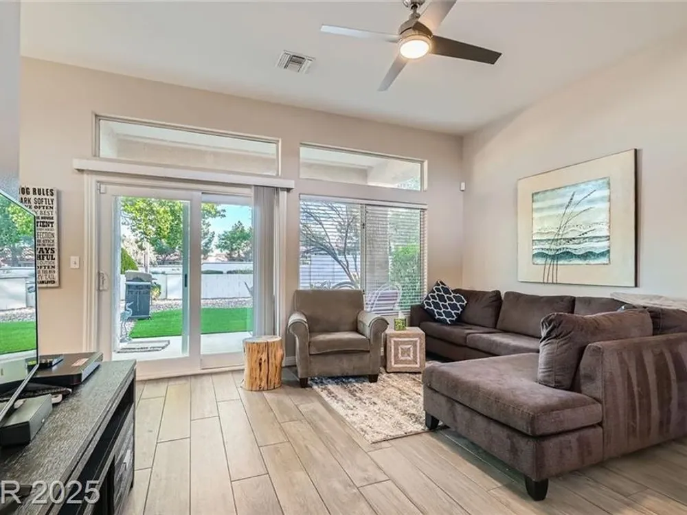 Beautiful Remodeled Home in Sun City Summerlin! This stunning 55+ community home offers timeless style and modern comfort. Step into a private front courtyard that sets the tone for the warm, welcoming interior. Inside, vaulted ceilings and abundant natural light create an open, airy feel. The fully remodeled kitchen is a showpiece, featuring quartz countertops, white cabinetry, and stainless steel appliances, blending modern design with everyday functionality. Stylish tile flooring flows throughout the main living areas, while ceiling fans with light add comfort in every room. The spacious primary suite includes a dual-sink vanity, walk-in shower, and generous storage. Outside, enjoy a large backyard with a covered patio, perfect for both relaxing and entertaining. The recently installed HVAC unit costs $11,000, added for peace of mind. Sun City Summerlin has world-class amenities: 3 golf courses, 4 rec centers, pool, tennis and pickleball courts, and a social calendar.