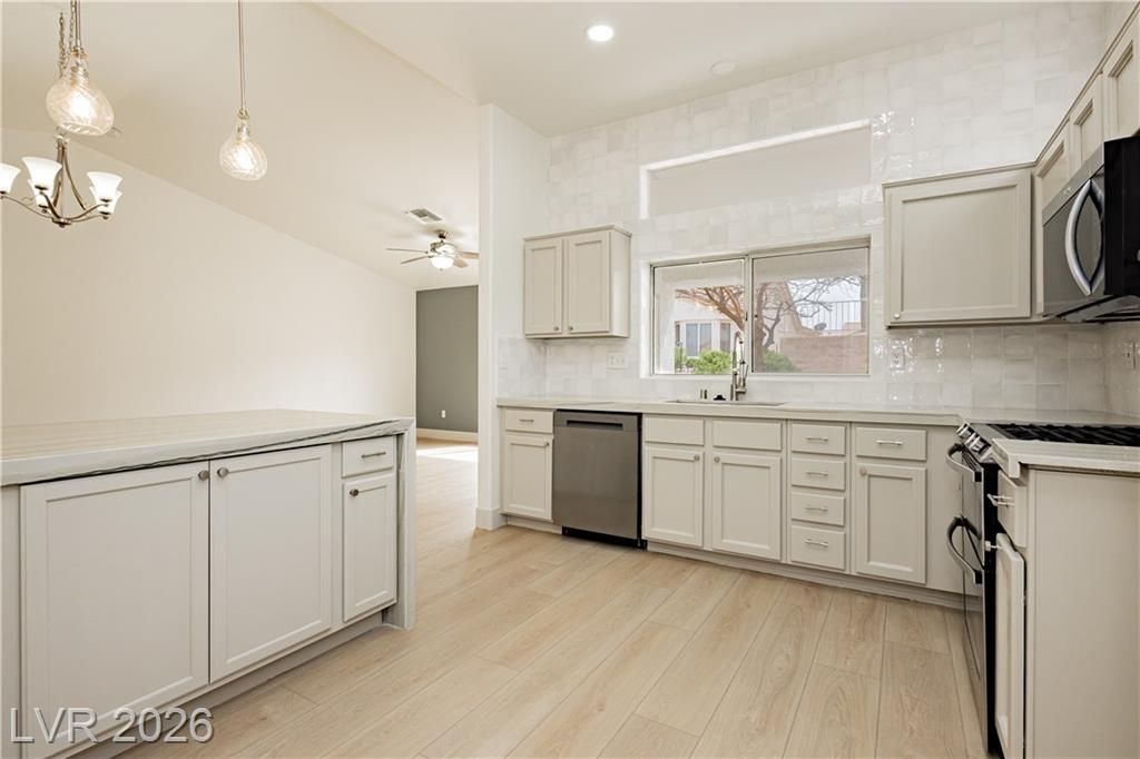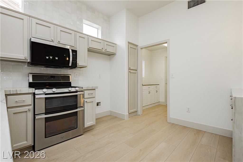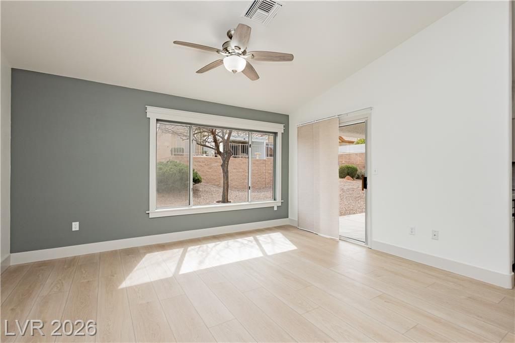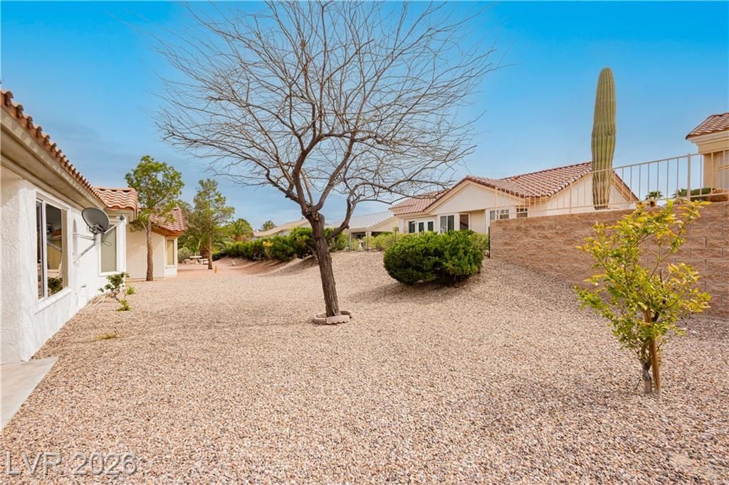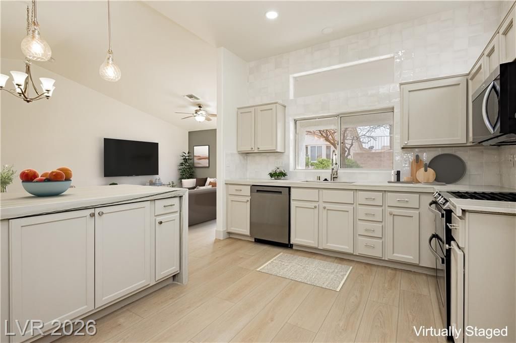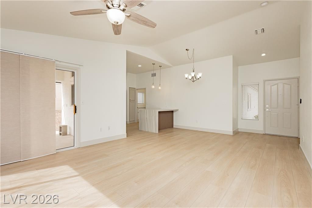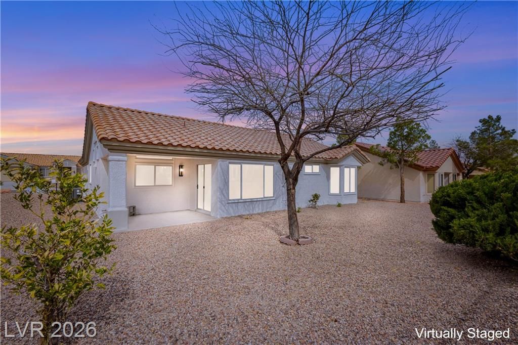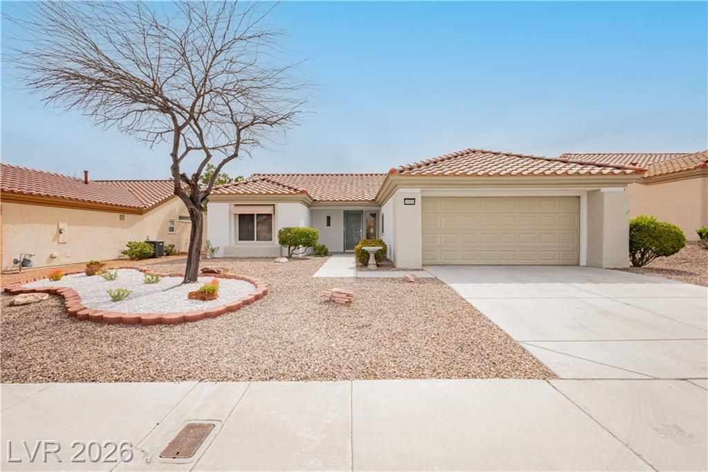 Step into a beautifully reimagined Elko model in the heart of Sun City Summerlin, where timeless elegance meets modern comfort. This home has been fully refreshed from top to bottom, showcasing new interior & exterior paint, luxury vinyl plank flooring, & an opened-up layout that enhances flow & invites natural light to spill in through oversized windows & vaulted ceilings. The gourmet kitchen has been completely transformed with striking quartzite countertops, stainless steel appliances, a double oven, brushed nickel finishes, & a welcoming breakfast bar. The spa-inspired primary bath brings resort-level luxury with fluted wood tile & stunning gold accents for a sophisticated, modern edge. Outside, relax in a serene, low-maintenance backyard featuring a covered patio—ideal for effortless entertaining or quiet evenings beneath the desert sky. Brand-new AC unit adds peace of mind & year-round comfort.