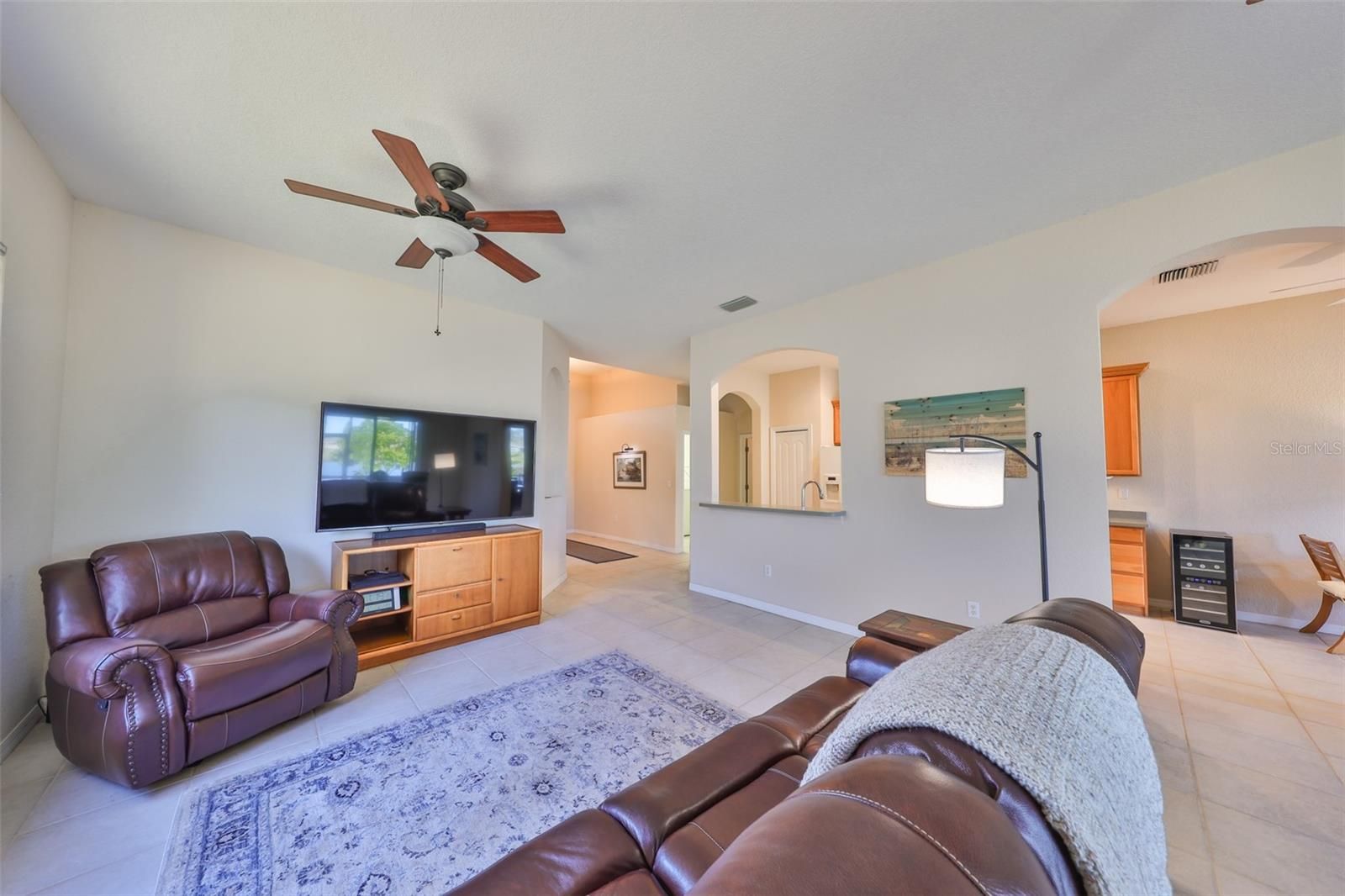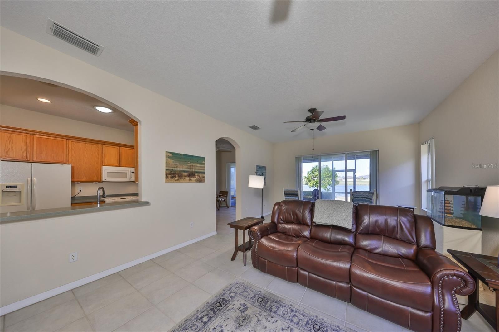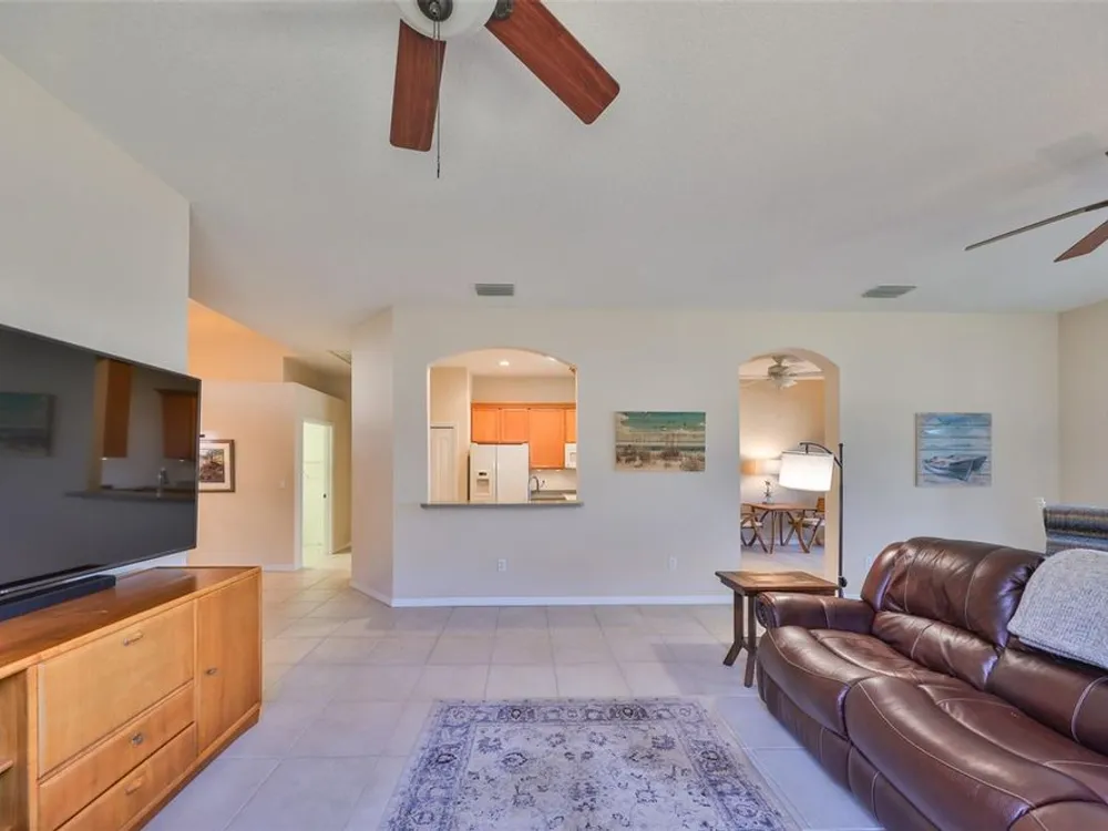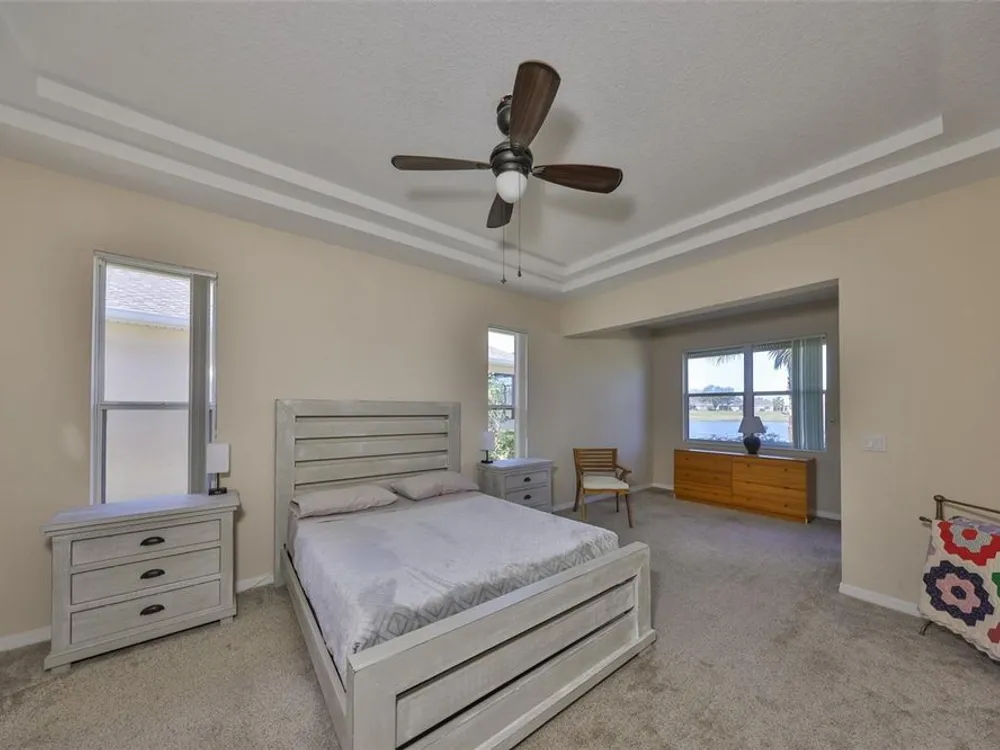 Click on 3D tour ------- MOTIVATED SELLERS! TERRIFIC WATER & GOLF COURSE VIEWS! Welcome to active & fun retirement living in the 55+ resort-style community of Renaissance, where you'll feel like you're on vacation every day. This lovely, PARTIALLY FURNISHED, 2 bed/2 bath & den home boasts almost 2000 square feet of living space and is nestled on a premium lot. You'll be impressed with the neutral decor, high ceilings, lots of ceramic tile flooring and stunning WATER & GOLF COURSE VIEWS ALL ACROSS THE REAR OF THE HOME. The eat-in kitchen has a solar tube for extra lighting, has plenty of cabinetry & counter space and opens up to the comfortable living/dining room area for easy living. The large private owner's suite has an extra sitting area w/slider to the lanai, has a nice ensuite bathroom w/walk-in shower and plenty of closet space. The guest bedroom & bathroom are at the opposite end of the home for added privacy. The den/office can easily be used for a 3rd bedroom if needed. The lanai is the perfect space to relax & enjoy the various birds & wildlife. As an added bonus, there is an awesome grill w/hood for the BBQ lovers. This home has several updates, ROOF 2022, FURNACE 2019 W/UV LIGHT, DISPOSAL 2019, HURRICANE SHUTTERS ALL AROUND 2018, EXTERIOR PAINT 2018, WATER HEATER 2017 AND NATURAL GAS. THIS HOME ALSO COMES WITH A 1 YEAR HOME WARRANTY FOR WORRY-FREE LIVING. The neighborhood Club Renaissance is just a short golf cart ride up the street, where you can enjoy dining, drinks, resort-style pool, fitness classes, spa, social activities, and so much more. You'll also have access to all Sun City Center amenities, such as shopping, restaurants, banking, doctors, numerous social clubs, pickleball, and tons more, all accessible by golf cart. So come and visit this wonderful home today and see why you'll want to call it yours!
