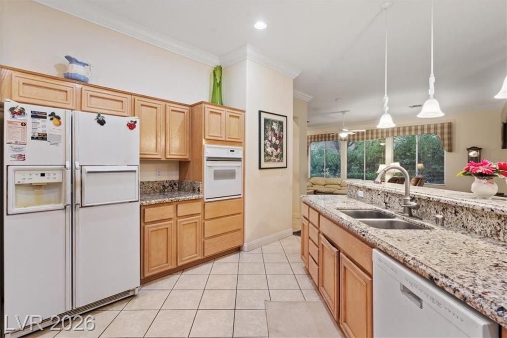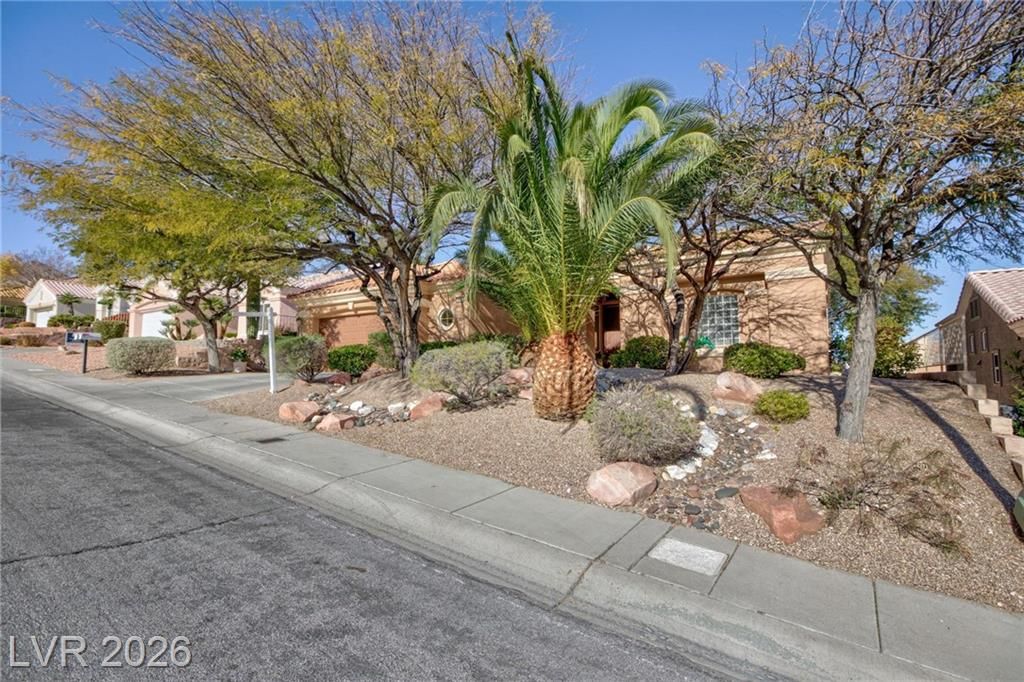 Elegant single-story residence in Sun City Summerlin offering timeless design and inviting indoor–outdoor living. A spacious great room with custom entertainment wall and fireplace opens to a bright kitchen with granite counters and tile floors. Step outside to a serene backyard oasis with privacy fencing with mature bay trees, fountains, and a full-length covered patio enhanced by a misting system for year-round comfort. True pride of ownership with 8" crown molding and 6" baseboard throughout, den/office with oak built in, separate laundry room with abundant storage. Recent upgrades include 2 new HVAC and 2 new furnace systems. Residents enjoy world-class amenities including 4 community centers, 3 championship golf courses, fitness facilities, indoor & outdoor pools, tennis & pickleball courts, walking trails, bocce, theater, restaurants, and vibrant social clubs (80+ clubs!). Ideally situated in Summerlin with premier shopping, dining, and outdoor activities. Perfect new chapter!