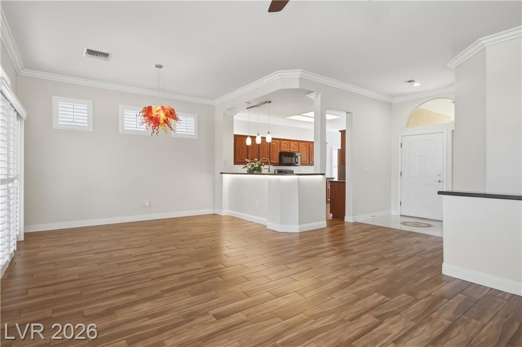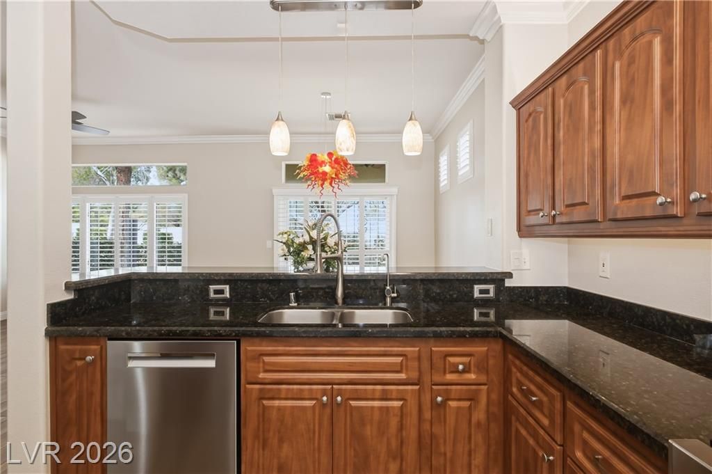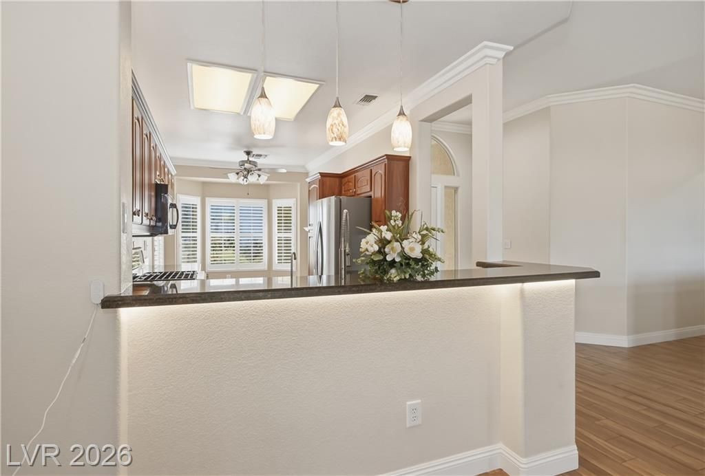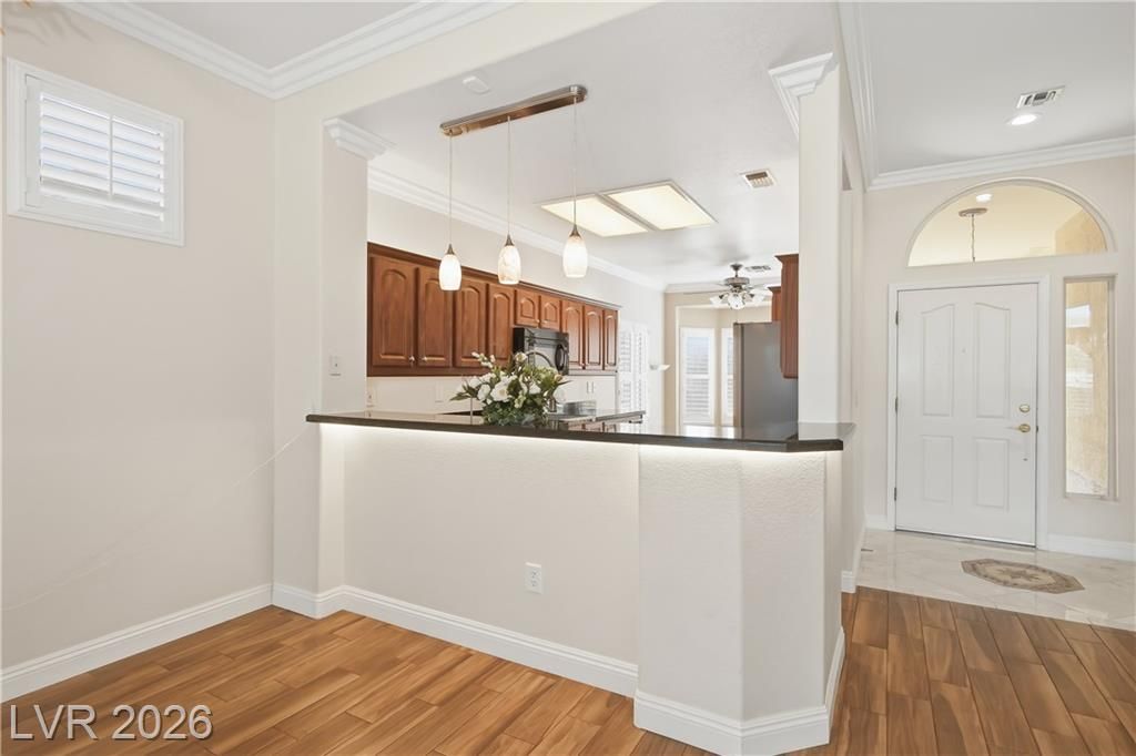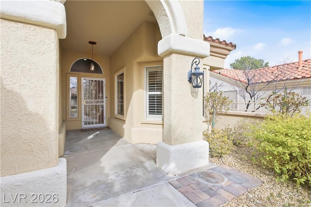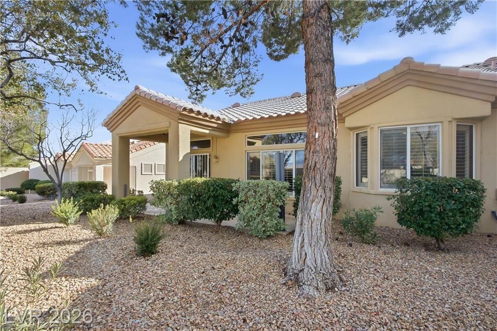 Recently updated & highly sought-after 1,313 sq. ft. townhome in the premier 55+ community of Sun City Summerlin. Enter through a gated courtyard along a charming cobblestone path, surrounded by refreshed landscaping with enhanced lighting & an upgraded drip system. The thoughtfully designed floor plan features a well-appointed kitchen with upgraded cabinetry, granite countertops, newer stainless-steel appliances, under-sink reverse osmosis, accent lighting, and an inviting eat-in bay window nook. Stylish improvements throughout include wood-look tile flooring, crown molding and baseboards, ceiling fans, plantation-style shutters, fresh interior paint, and exterior lighting. The spacious primary en-suite offers a custom walk-in closet, step-in shower, and a delightful bay window that fills the room with natural light. Sun City Summerlin offers 3 golf courses, 4 club houses, multiple pools & hot tubs, sports courts, clubs & activities and is located nearby Down Town Summerlin district