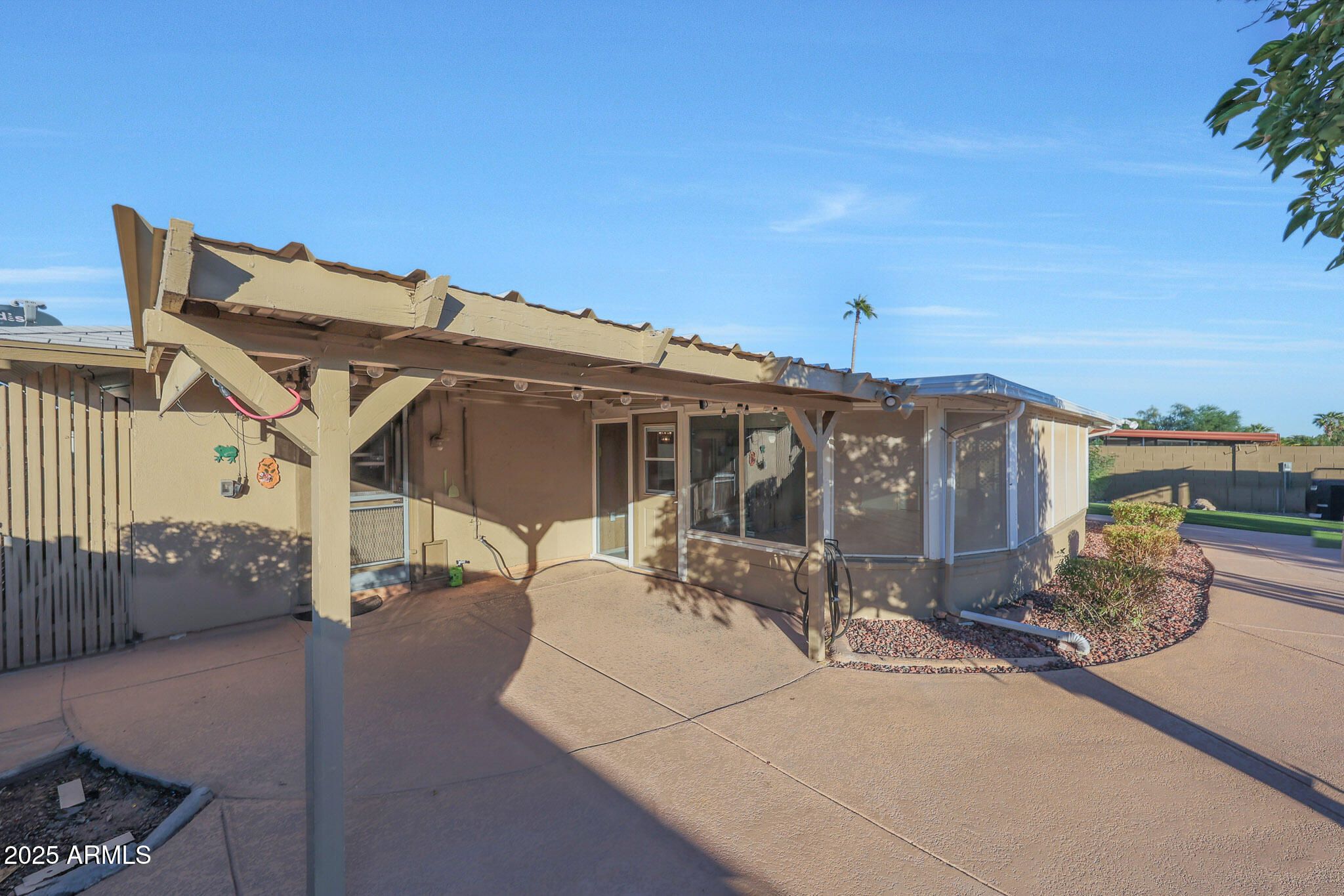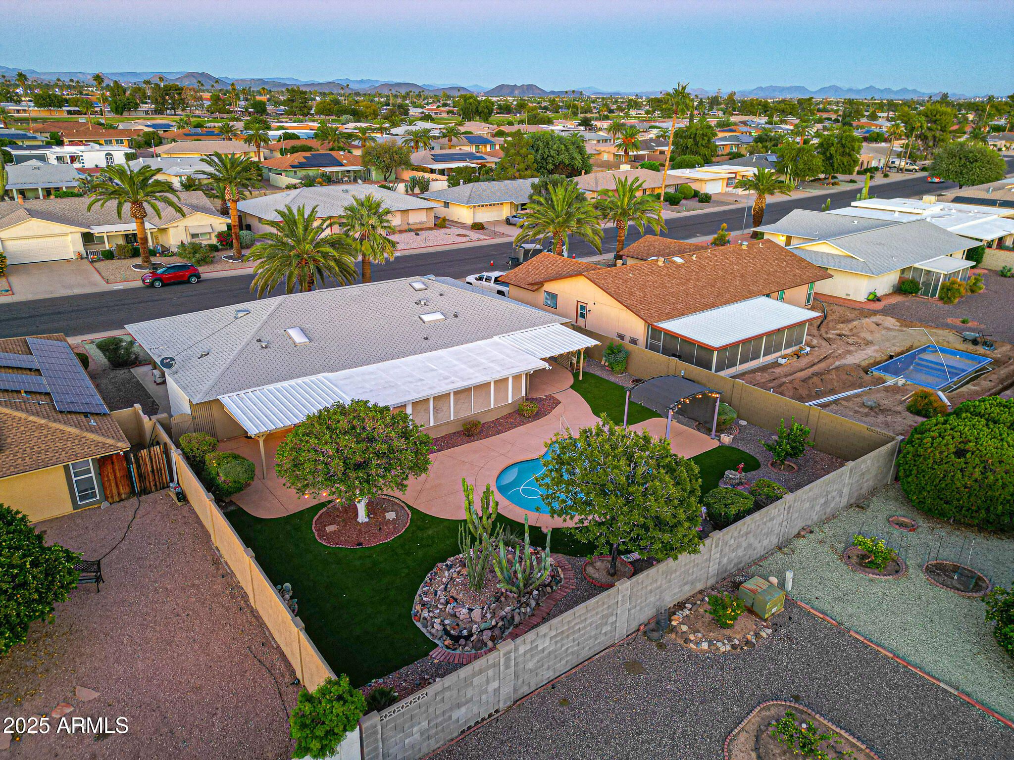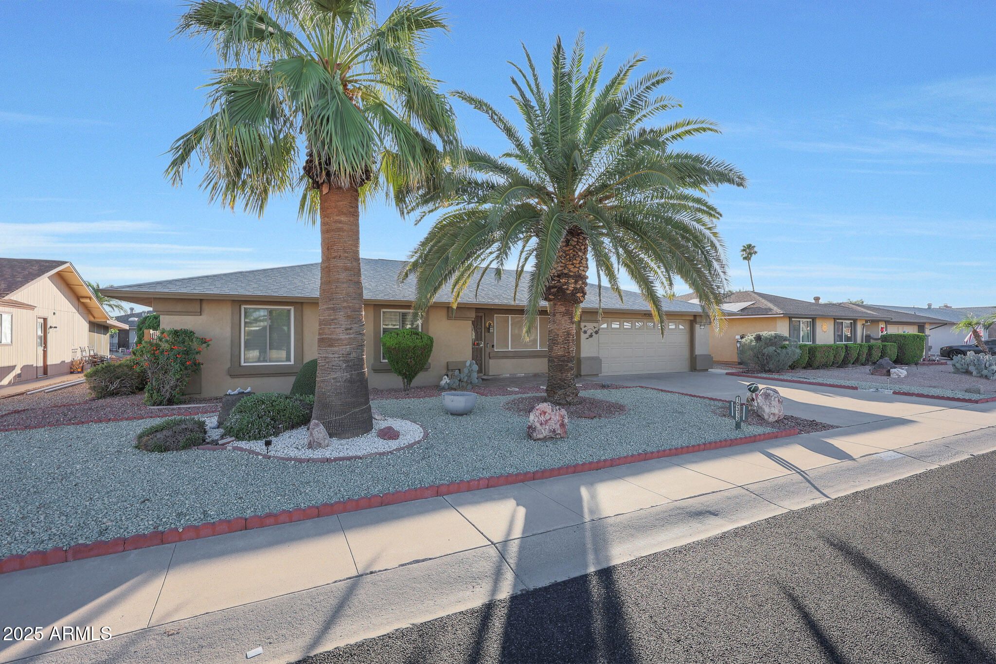 Be sure to visit this beautifully updated Fontaine model home in Sun City! Yes there's a pool that can be heated or cooled! This home has so many wonderful updates throughout. Some highlights include a stucco exterior, updated windows, and laminate and tile flooring. You'll also find ceiling fans in every room, and the popcorn ceilings have been removed. The kitchen has been thoughtfully updated with modern appliances, refreshed cabinets, granite countertops, and a convenient ''eat-at'' bar. Both bathrooms feature updated vanities and toilets, the guest bath offers a tub and shower, while the primary bath has a beautifully walkin tiled shower. One of the standout features is the spacious Arizona room, heated and cooled by its own mini-split HVAC system, making it comfortable year round This inviting space over looks the backyard and sparkling pool, perfect for relaxing or entertaining. Step outside to the large patio with cool decking and partially covered for shade. Across the pool, a charming gazebo offers another spot to unwind during warm sunny days. The entire backyard is enclosed by a block wall fence, providing privacy and a peaceful retreat.