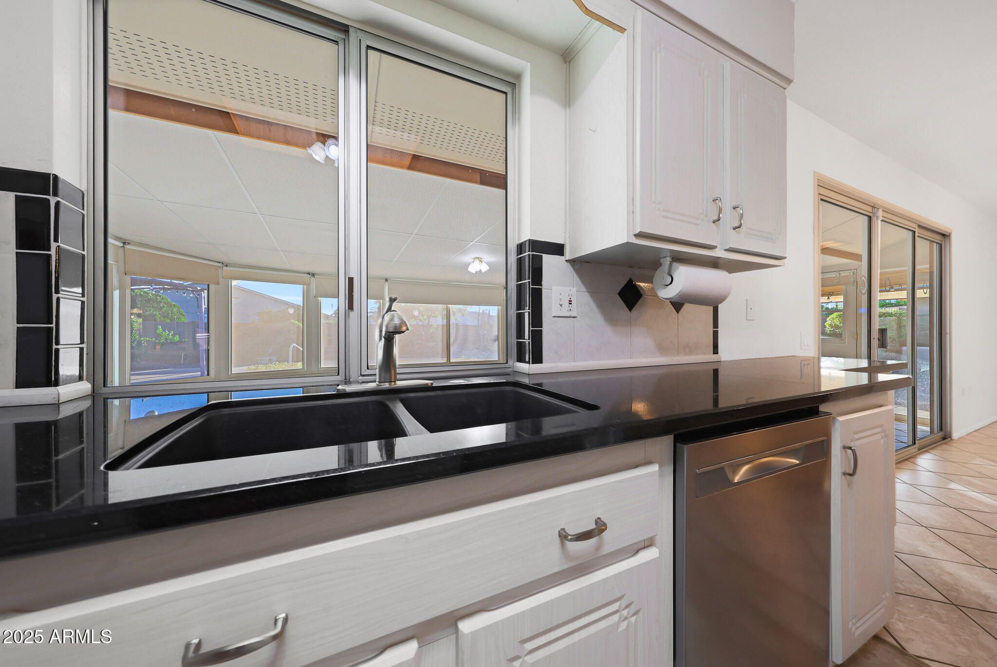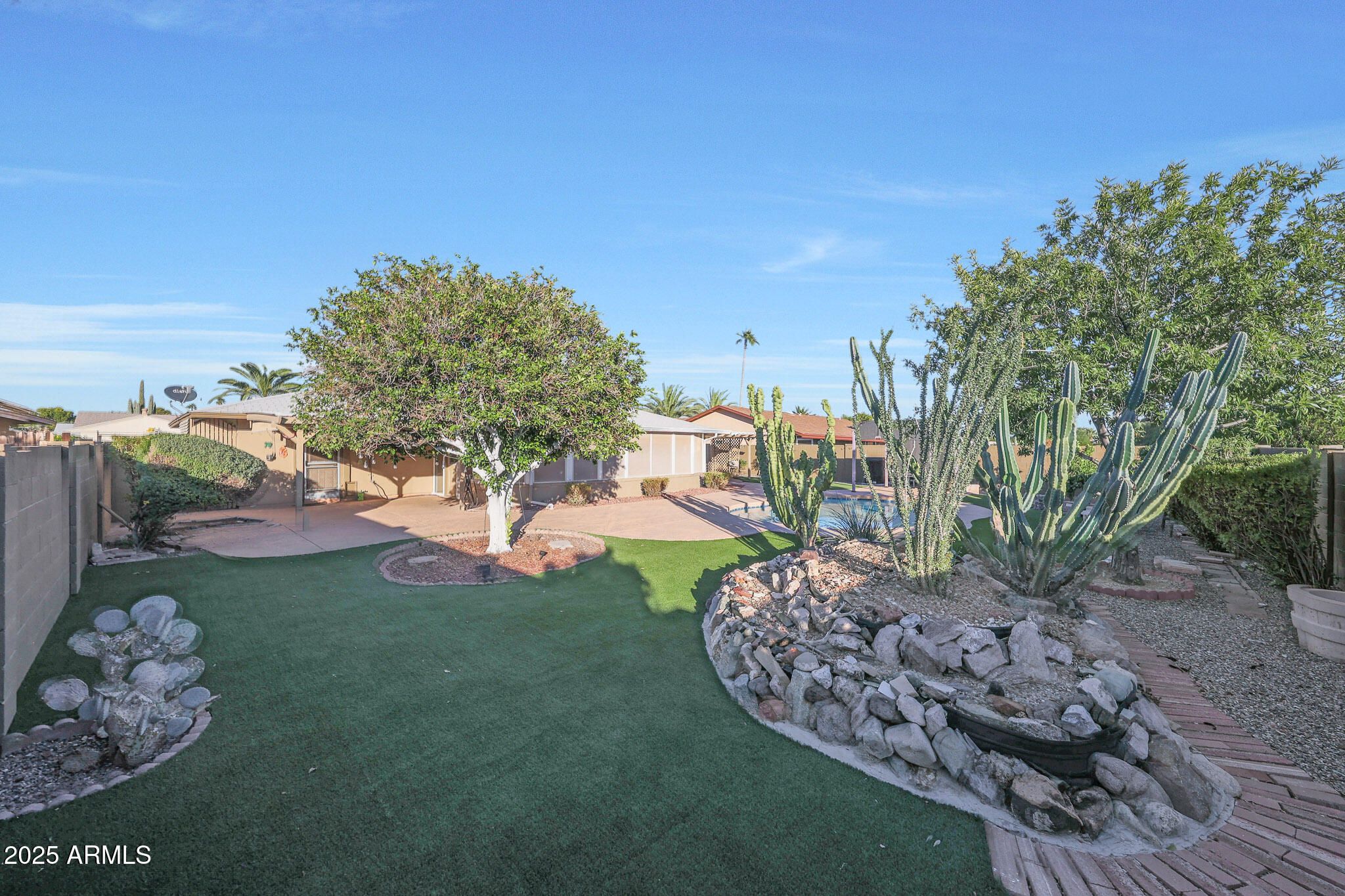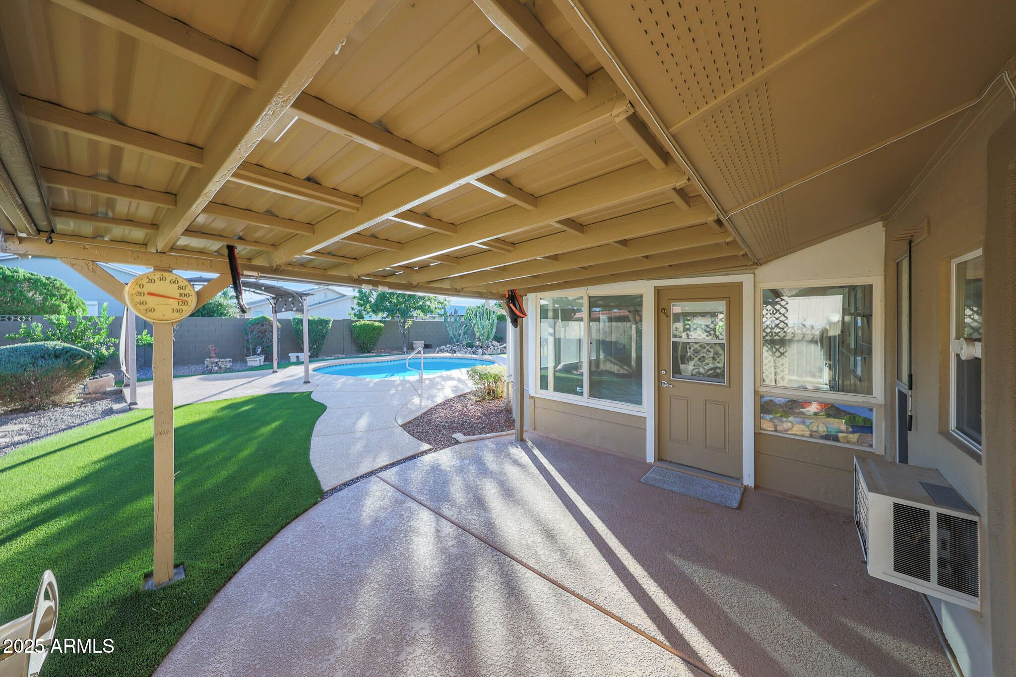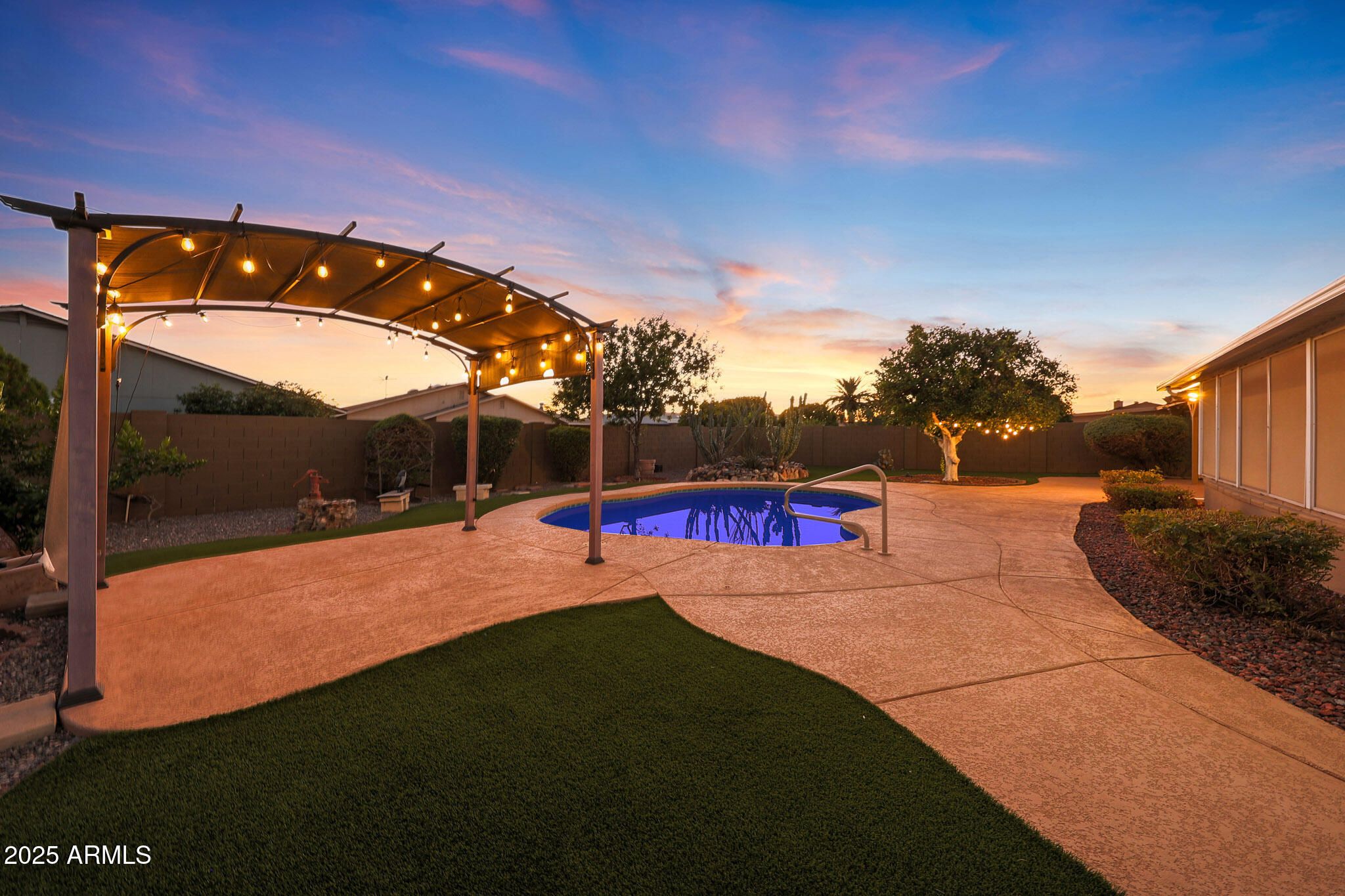 Be sure to visit this beautifully updated Fontaine model home in Sun City! Yes there's a pool that can be heated or cooled! This home has so many wonderful updates throughout. Some highlights include a stucco exterior, updated windows, and laminate and tile flooring. You'll also find ceiling fans in every room, and the popcorn ceilings have been removed. The kitchen has been thoughtfully updated with modern appliances, refreshed cabinets, granite countertops, and a convenient ''eat-at'' bar. Both bathrooms feature updated vanities and toilets, the guest bath offers a tub and shower, while the primary bath has a beautifully walkin tiled shower. One of the standout features is the spacious Arizona room, heated and cooled by its own mini-split HVAC system, making it comfortable year round This inviting space over looks the backyard and sparkling pool, perfect for relaxing or entertaining. Step outside to the large patio with cool decking and partially covered for shade. Across the pool, a charming gazebo offers another spot to unwind during warm sunny days. The entire backyard is enclosed by a block wall fence, providing privacy and a peaceful retreat.