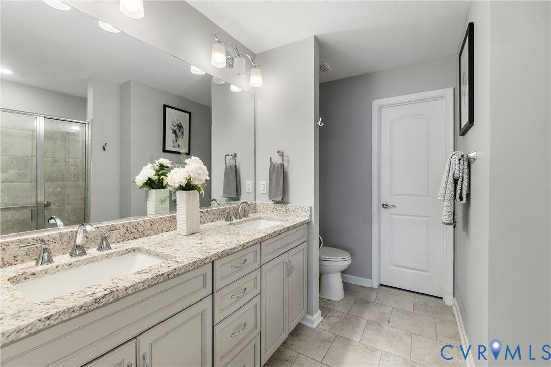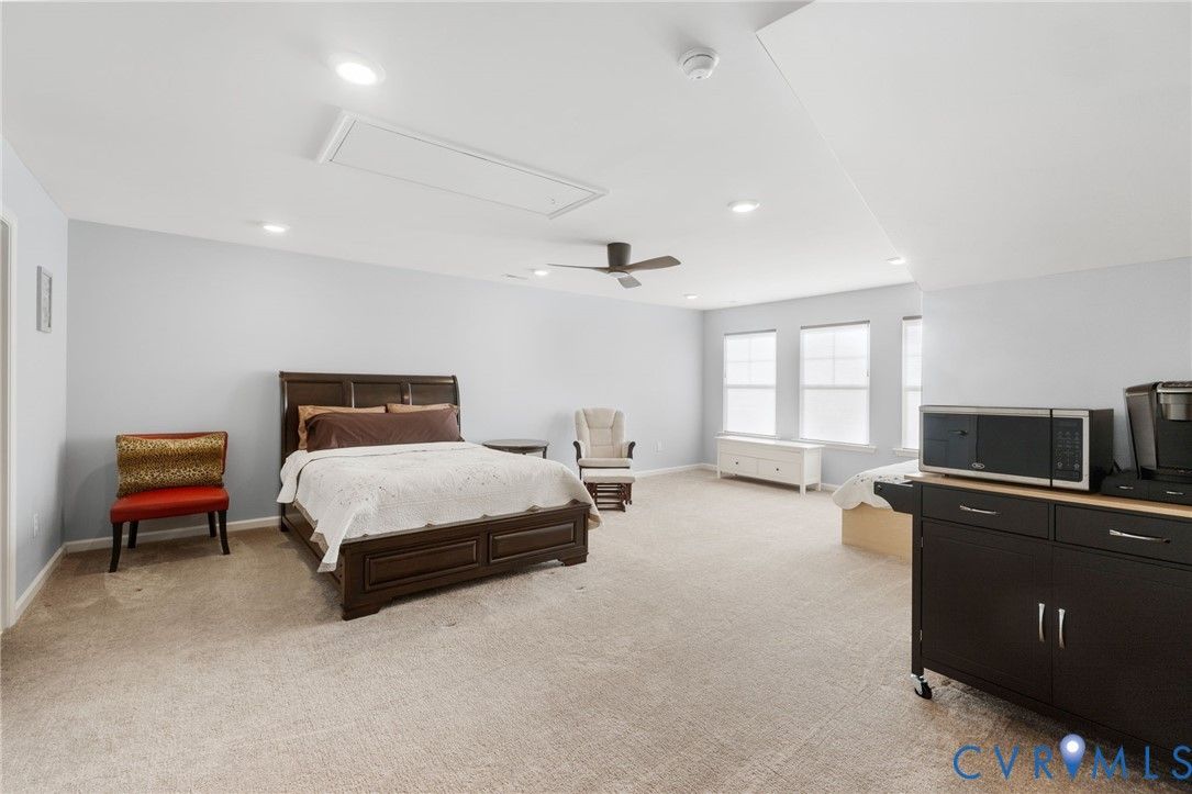 This Beautiful home is located in the premier 55+ Community at Chickahominy Falls! Designed for comfort and style, this home features One-Level living at its finest! The spacious Living Room features Hardwood floors, cathedral ceiling with a sleek & modern Fan/Light, custom blinds, and a Dual-Sided Gas Fireplace. Off to the side is a sun-drenched Morning Room/Study. Behind the Fireplace is an open Kitchen - truly a delightful space to prepare meals and entertain with its large center Island with an overhang for additional seating, 42" cabinets with pull-out drawers, Marble counters, tiled backsplash, Stainless appliances including 2 wall ovens, Pantry, Farmhouse-style sink, pendant and recessed lights. In a cozy corner, the Dining Room features a tray ceiling with chandelier. The Primary Bedroom features a walk-in closet (used as an office), vaulted ceiling w/ fan/light, and an En-suite luxury Bath. Step inside to find double vanities, shower with glass doors AND a large walk-in closet! Over to the other side of the house, a 2nd Bedroom (used as a craft/quilting room) features 2 closets & built-in cabinets & shelves. Additional rooms include a Laundry Room equipped with a sink & a generous size closet/pantry, and a Full Bath. Families & guests will be spoiled with the finished 2nd floor Loft! This 3rd Bedroom is multi-functional with the space provided & includes a walk-in closet and its own En-suite Full Bath! Outdoor entertaining in the private courtyard comes with a Gas hook-up for grilling. More storage is found in the finished Garage w/ epoxy flooring & cabinets. This HOME gets gentle sunlight throughout the day! Richmond's ONLY 55+ Agri-community w/ Woodside Farms - growing a curated mix of fruits/vegetables to benefit the health & wellness of the neighbors! Enjoy Resort-style amenities that includes a 6500SF Clubhouse, pool, fitness center, community gardens, walking trails, and social events that bring neighbors together throughout the year! Let's make this your HOME and enjoy Active - Adult Living!