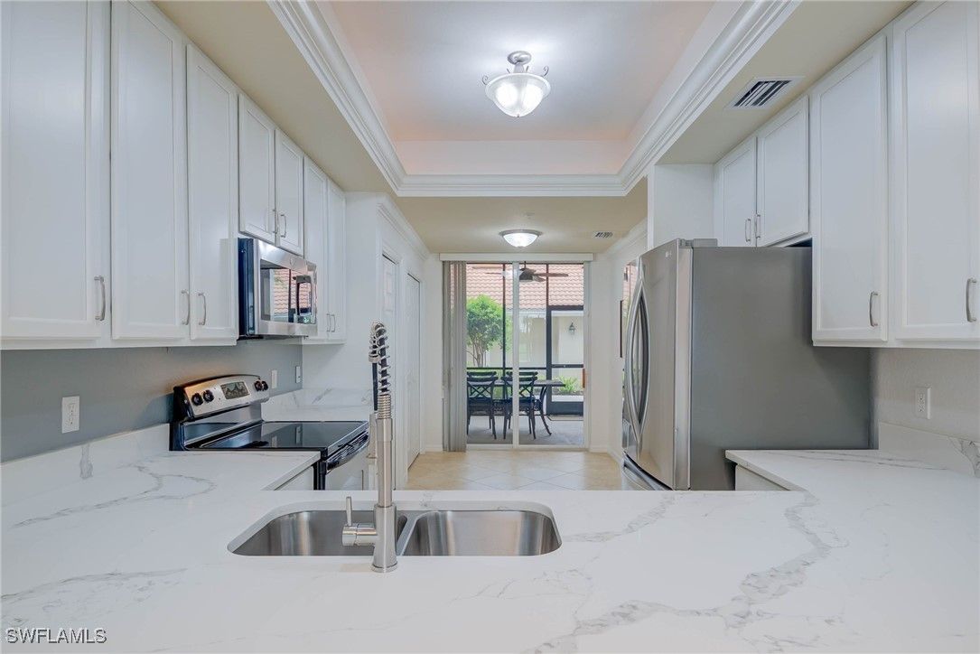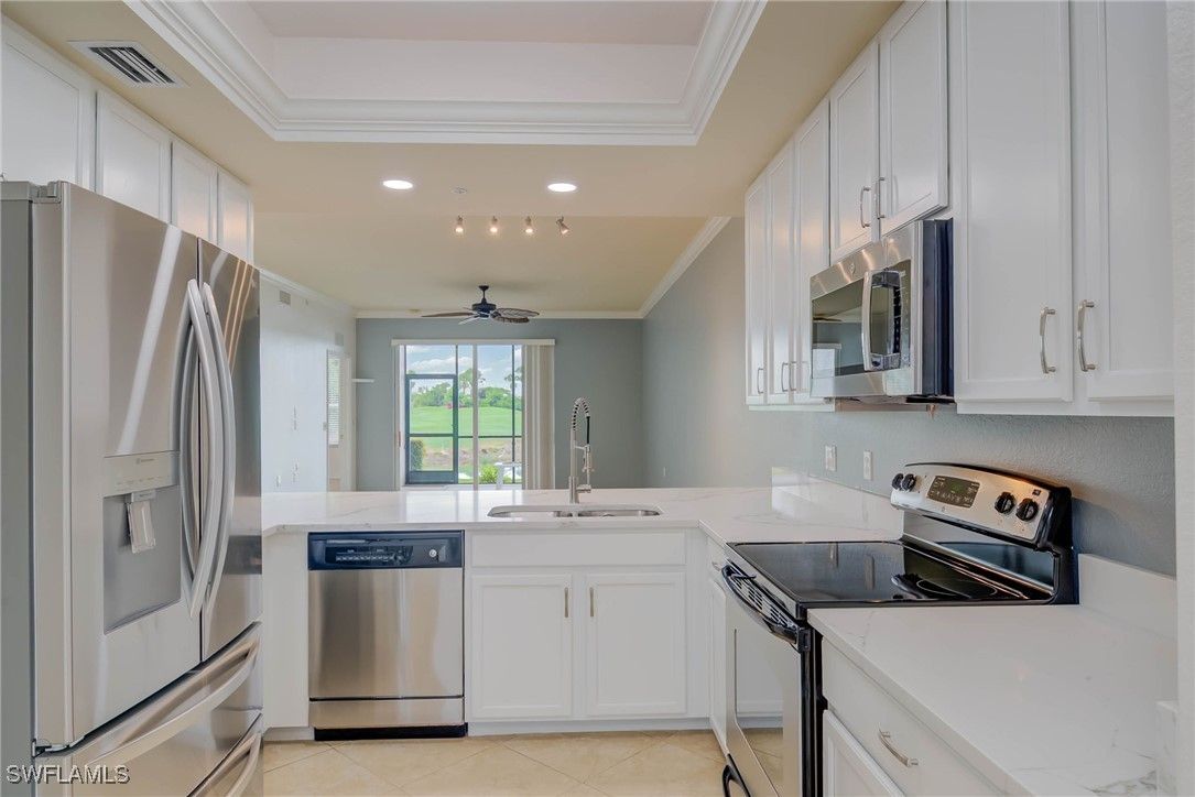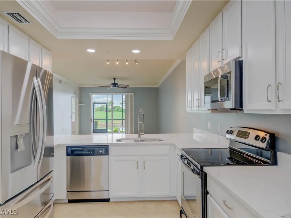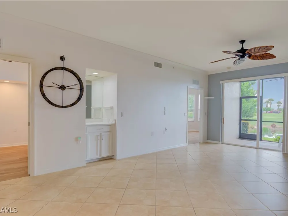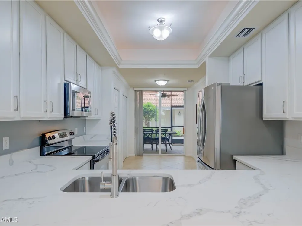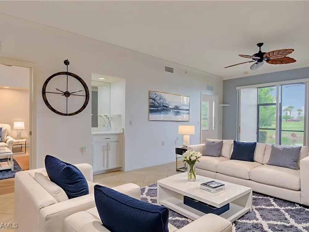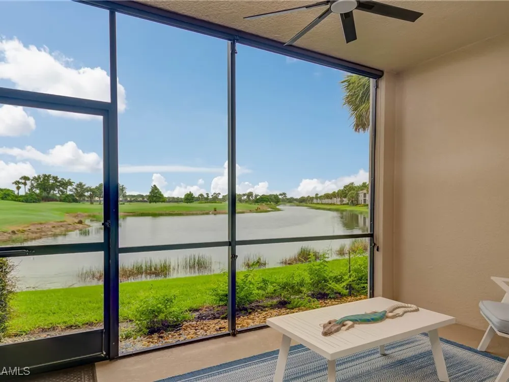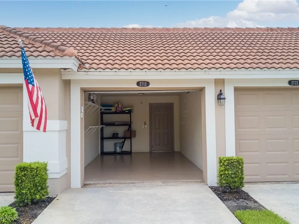 Welcome to 10316 Heritage Bay Blvd #2712, a stunning 2?bedroom + den, 2?bathroom Veranda condo with garage nestled within the prestigious gated Heritage Bay Golf & Country Club in North Naples, FL. This first-floor unit offers serene views overlooking a picturesque pond and the championship golf course—a perfect blend of comfort and elegance. UPDATED KITCHEN including extended counter height Quartz counter tops, white cabinets, new refrigerator and microwave range hood. Newer HVAC (2021) and water heater (2025) and all new wood laminated flooring in the bedrooms and den.Large tile on diagonal and crown molding add to the finishes of this beautifully maintained home. FULL GOLF MEMBERSHIP INCLUDED. NO INITIATION FEE. NO WAIT LIST.