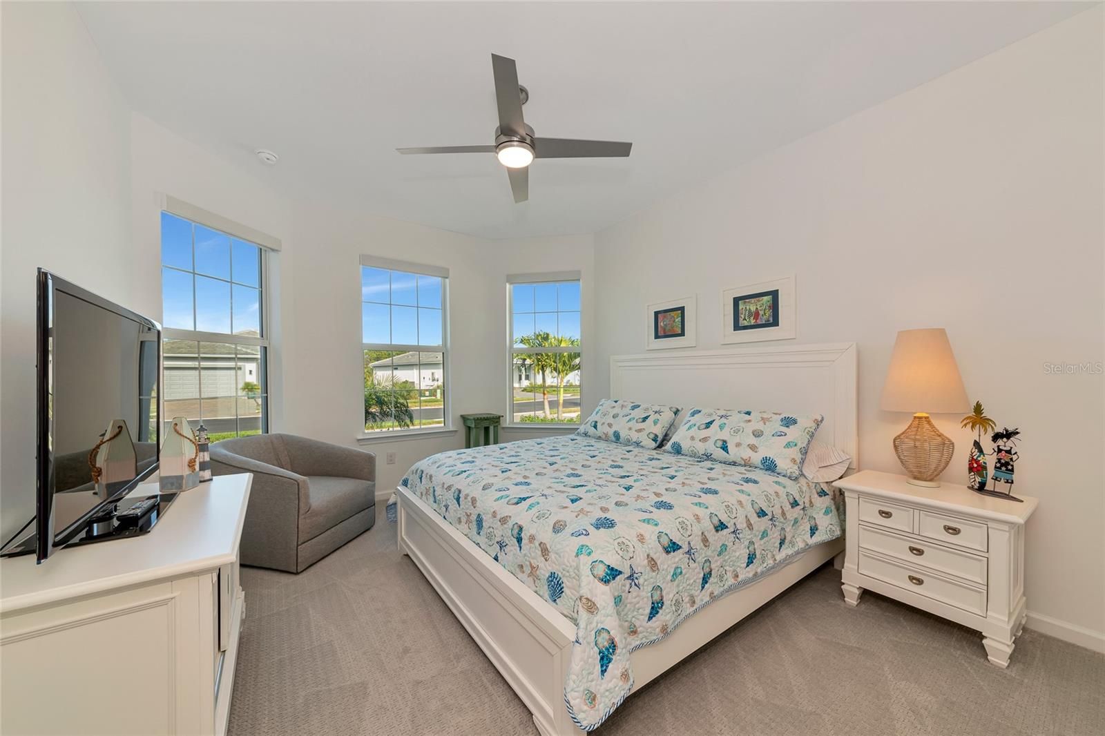 - Ceiling Fan(s), Eat-in Kitchen, High Ceilings, Open Floorplan, Main Level Primary, Smart Home, Solid Surface Counters, Thermostat, Walk-In Closet(s), Window Treatments