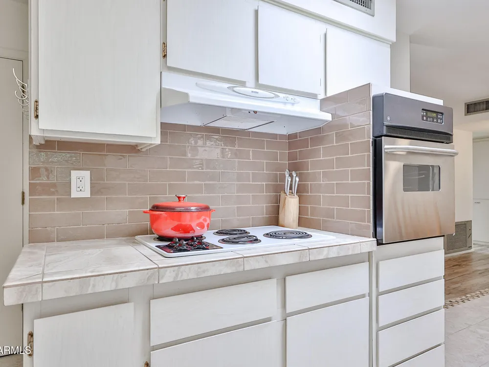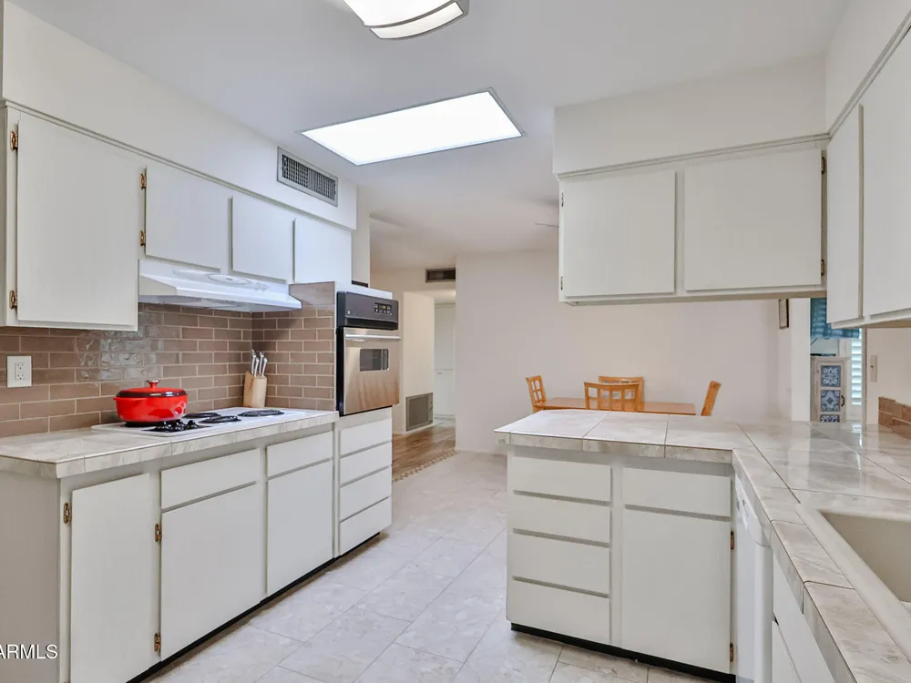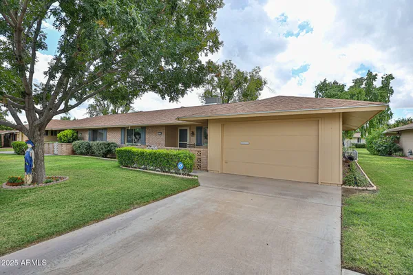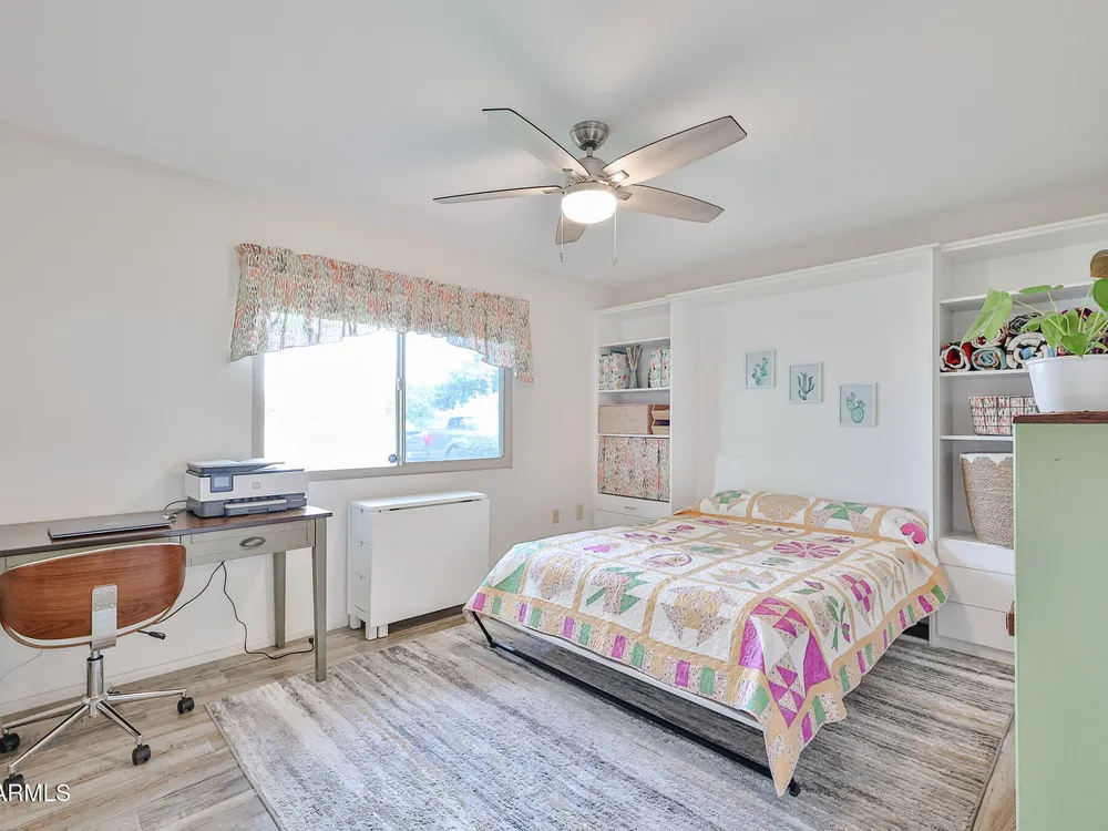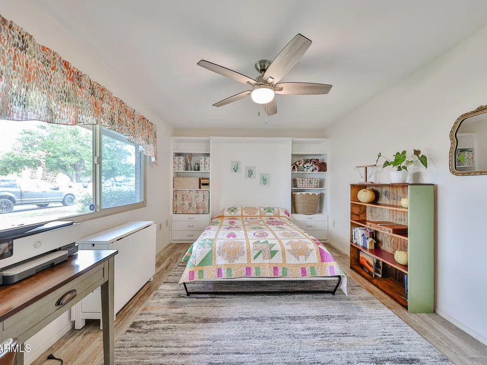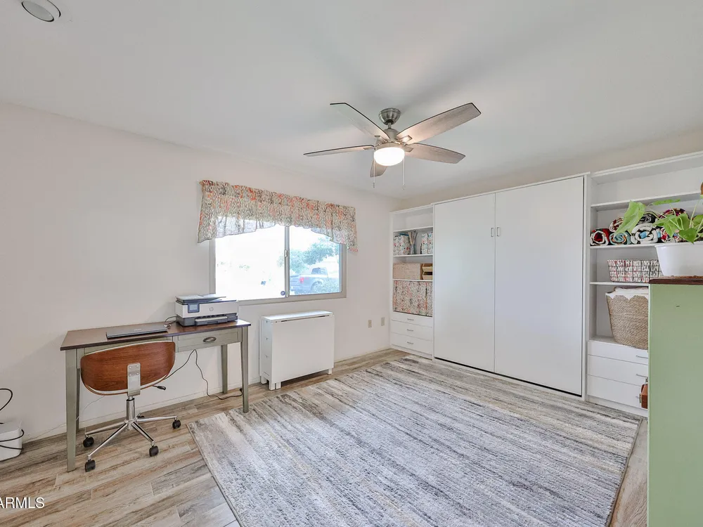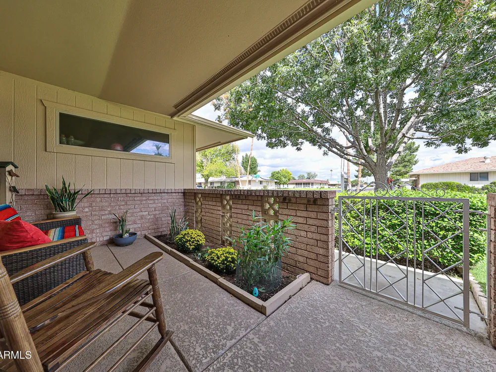 Prime Sun City Location! Are you looking for a beautifully updated, meticulously kept, move-in ready Gemini home with numerous upgrades—plantation shutters, Hunter Douglas blinds, dual-pane windows, storm door, security doors, A/C and furnace (2019), and added attic insulation. Electrical updates include GFCIs, upgraded breaker box, and dedicated line for the newer wall oven. For added comfort and extra work space, the guest room includes a custom murphy bed and wall unit, professionally done by Closets by Design. Enjoy morning coffee on your charming front patio area or relax out back overlooking the serene greenbelt and fruit trees. For added convenience inside washer/dryer room and attached direct access garage with driveway. All this within walking distance to Greenway Terrace shop and Sun Dial recreation center.
