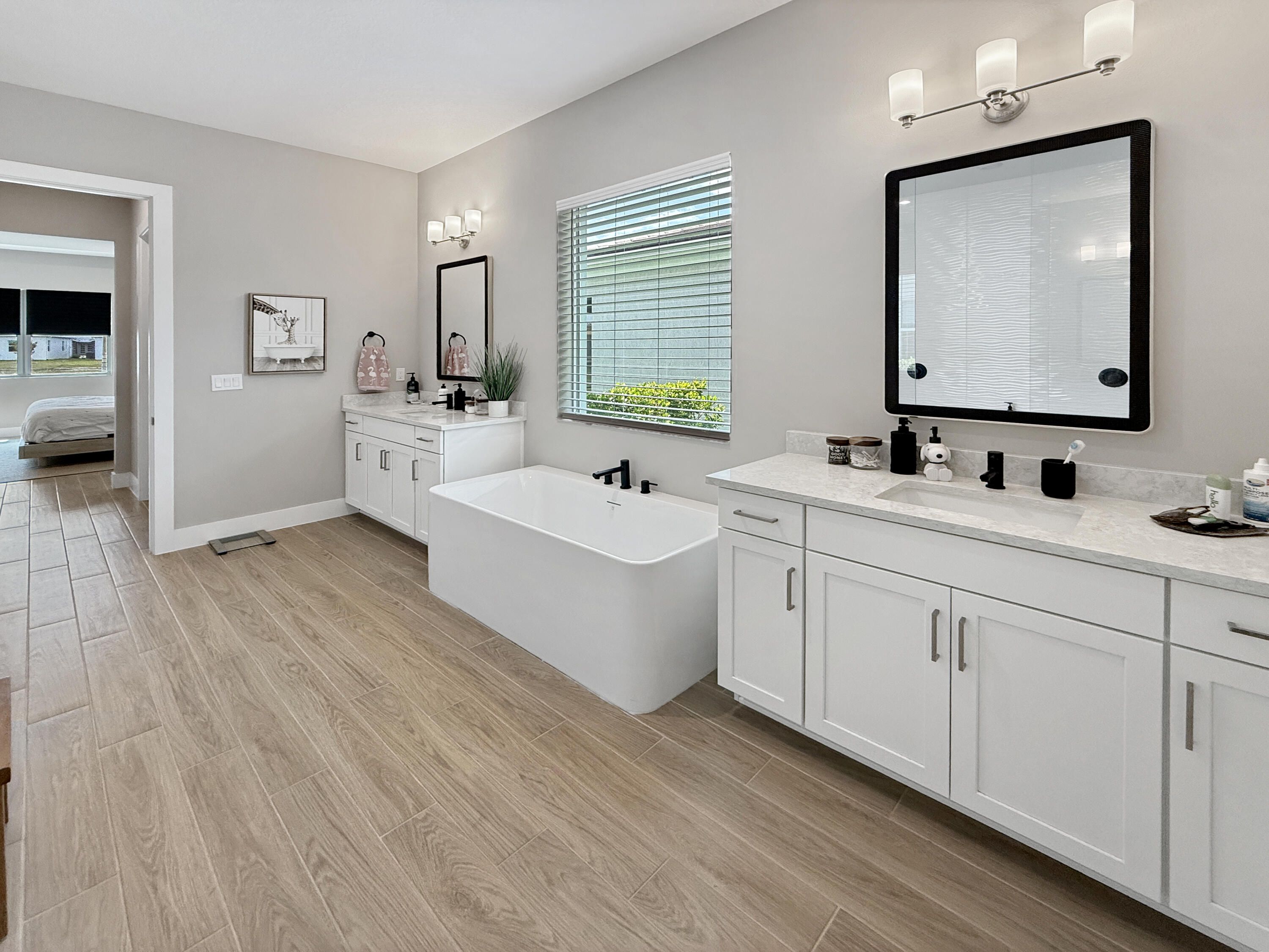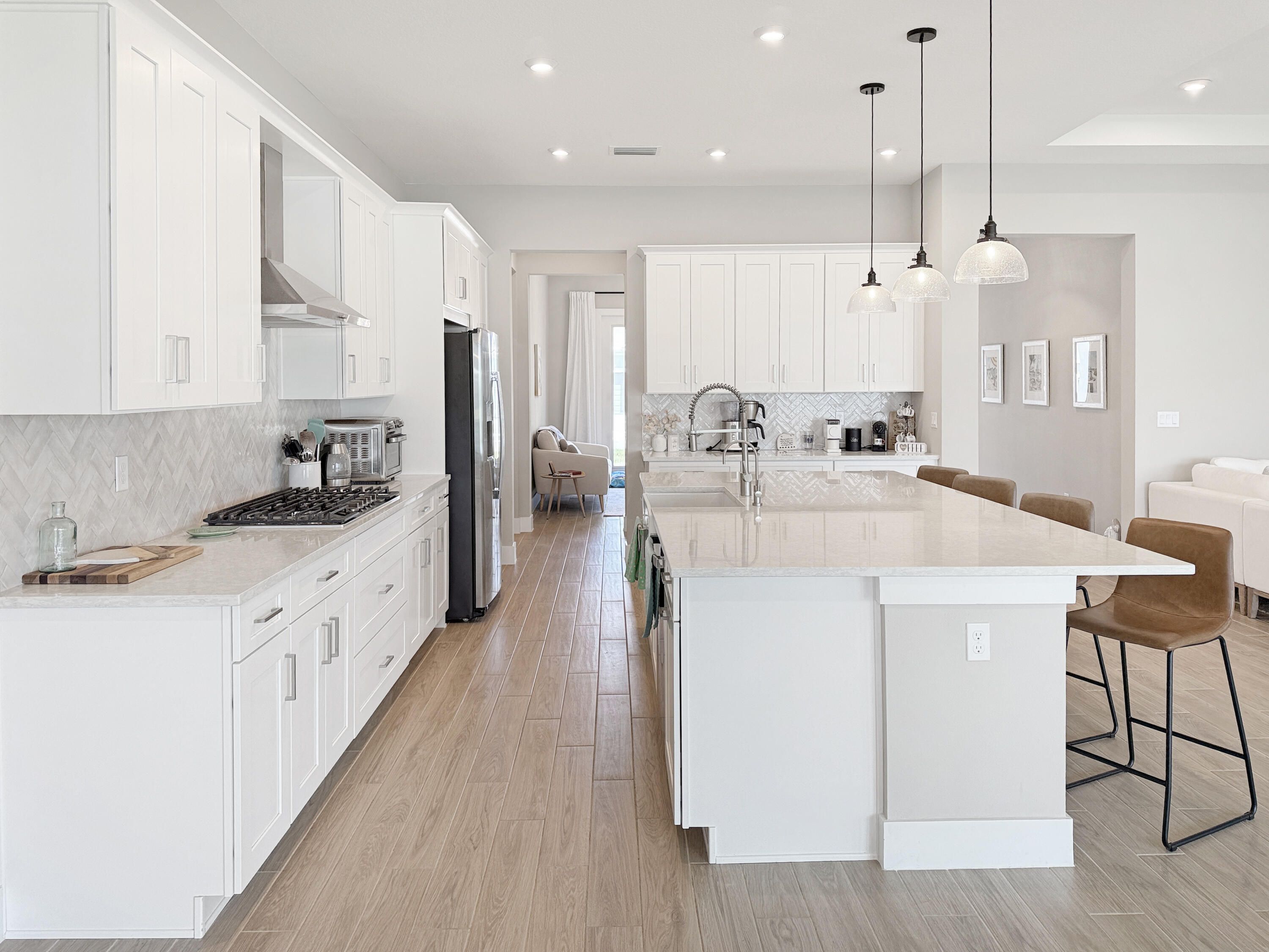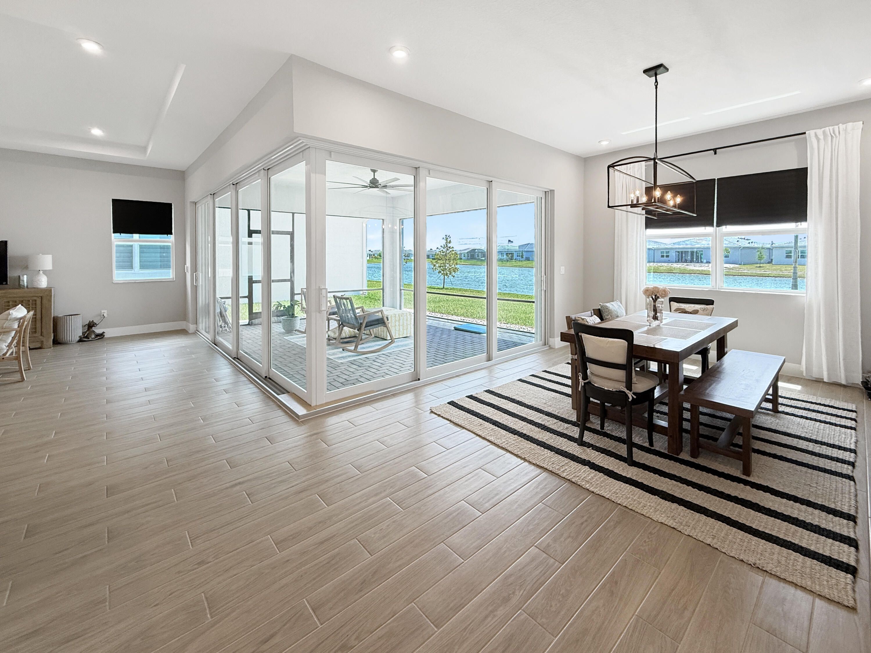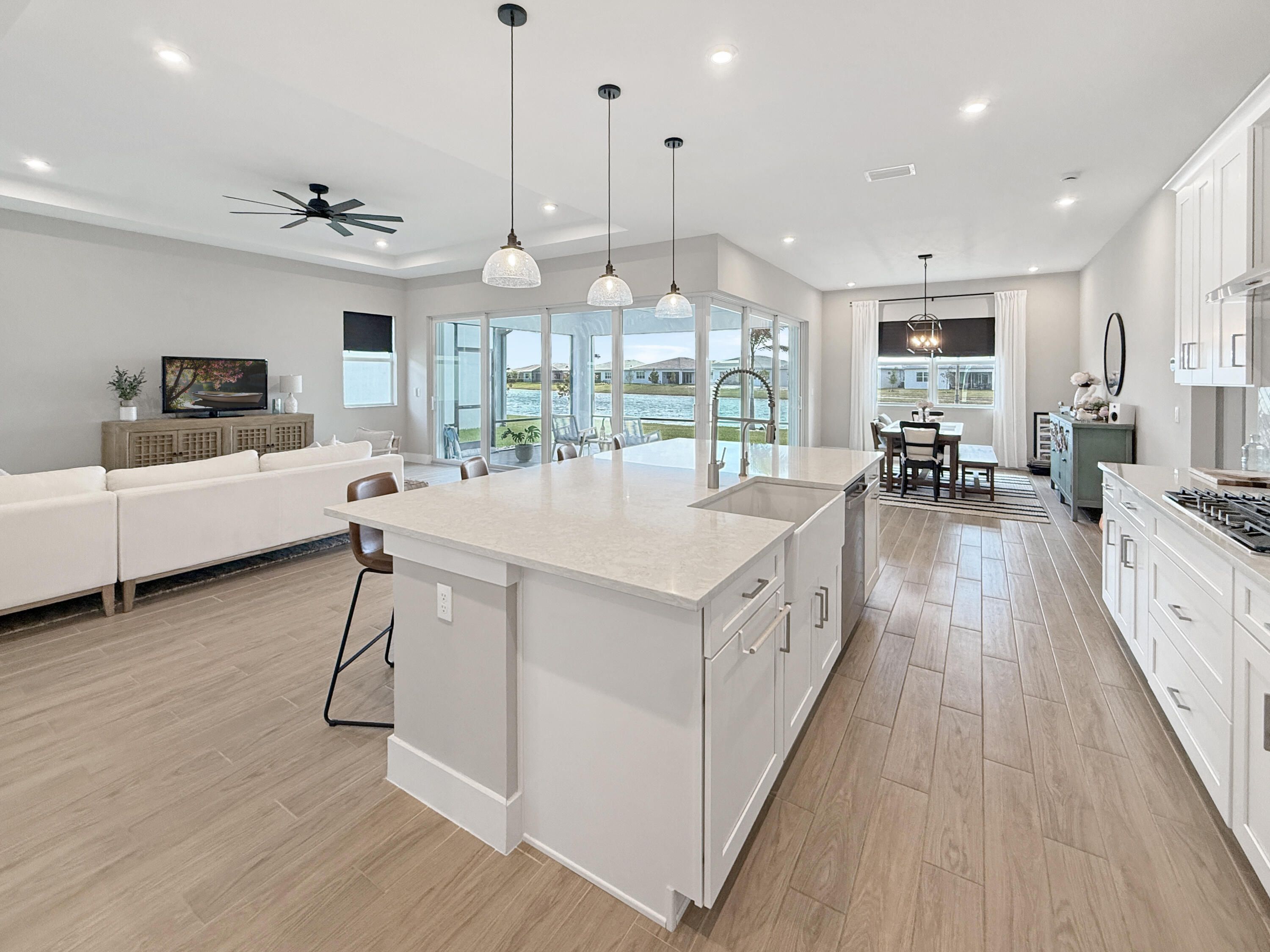 SELLER OFFERING $20,000 TOWARD CLOSING COSTS! This is NOT your basic home! This home is carefully curated with no corners cut and high-end upgrades and finishes throughout! Located in the sought-after 55+ community of Telaro at Tradition, this fully upgraded home features wood-grain tile throughout, upgraded lighting, and a stunning 7-panel L-shaped slider. And let's talk about the view...enjoy a wide lake view on the largest lot in the community with room for your dream pool! The gourmet kitchen showcases a herringbone backsplash, farmhouse sink, gas cooktop, upgraded appliances, and custom cabinetry. Spa-like primary suite with soaking tub and custom closets. Screened patio, custom pantry, whole-house water system & more! SELLER OFFERING $20,000 TOWARD CLOSING COSTS! Stunning lake view with extensive upgrades throughout. This home was thoughtfully designed with high-end finishes and no corners cut. Interior features include upgraded wood-grain tile flooring throughout, upgraded baseboards and trim, enhanced lighting with recessed fixtures in main living areas and primary suite, and a dedicated coffee bar with 20-amp outlet. Gourmet kitchen upgraded to highest level with custom herringbone backsplash, farmhouse sink, Moen spiral faucet, natural gas cooktop, upgraded appliances, and custom pull-out cabinetry added post-closing. Custom pantry with glass door, built-in countertop, and additional storage. Primary suite features upgraded tile work, freestanding soaking tub, large window, and two custom walk-in closets. All bathrooms upgraded with modern vanities, sinks, lighting, and Moen Align plumbing fixtures. Additional upgrades include French doors to flex room, laundry room plumbing for sink, upgraded laundry tile, epoxy garage flooring, belt-driven garage door opener, and whole-house water filtration system including softener, UV light, and reverse osmosis with remineralization. Exterior enhancements include screened lanai, expanded paver areas, custom courtyard with river rock and stepping stones, privacy landscaping, improved drainage system, generator hookup (50 amp), and natural gas dryer. Home has been professionally inspected multiple times, including pre-drywall, pre-closing, post-closing, and one-year inspection.