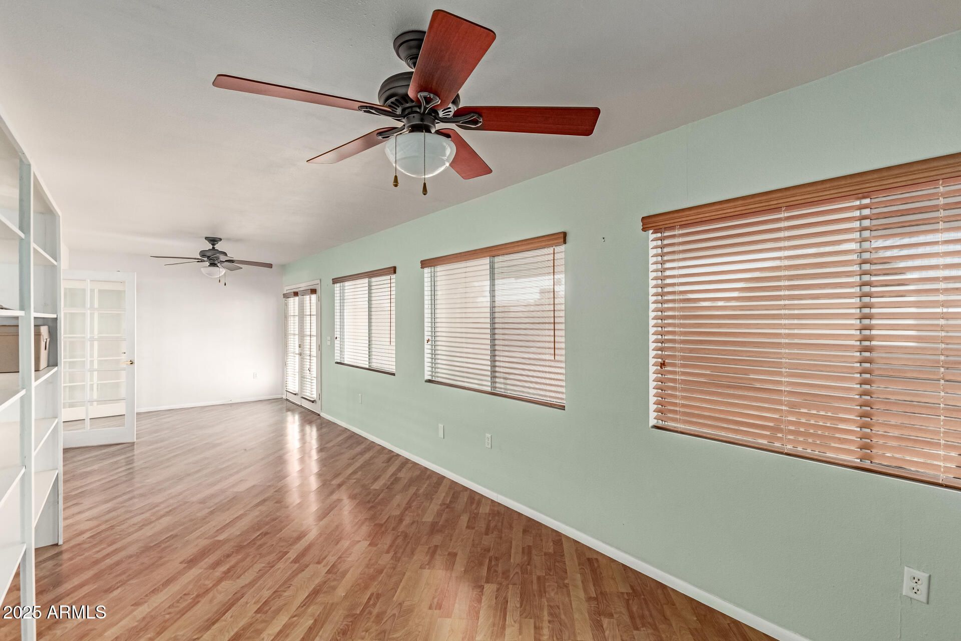Our Preferred Lender is offering a 1-0 buy down on this property for qualified buyers!! Make yourself at home in this charming 2-bedroom residence in the adult Community of Sun City! You're welcomed by a serene living room with a fresh palette, plantation shutters, and wood-look flooring for a timeless appeal. The eat-in kitchen comes with granite counters, warm wood cabinetry, recessed lighting, a pantry, and built-in appliances for a delightful cooking experience. Don't forget the bright sunroom, perfect for enjoying the warm Arizona weather year-round. The primary bedroom includes a private bathroom for added convenience. Spend relaxing moments in the backyard, complete with a covered patio, stylish pavers, and fragrant citrus trees. A deal like this won't last long!