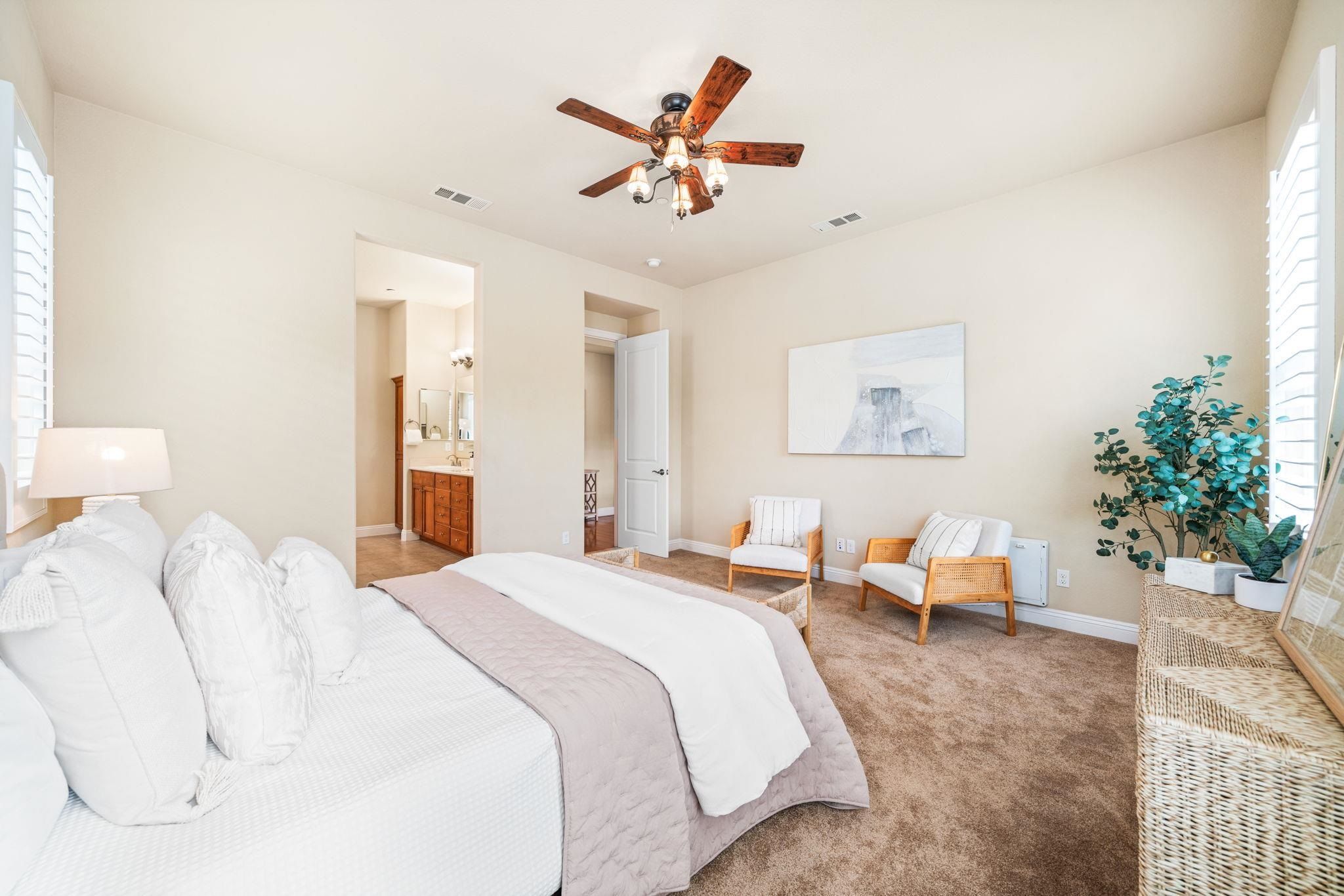 Welcome to Trilogy Vineyard, a premier gated 55+ community offering luxury living and endless amenities; multiple private pools, spa, event center, concert grounds, bocce, tennis, pickleball, and more! This immaculate 2 bedroom, 2 bath home features neutral flooring, custom shutters, recessed lighting, and carpeted bedrooms with ceiling fans. The spacious primary suite boasts a large walk-in closet, double vanity with custom wood cabinets, and an oversized shower with built-in bench. The chef’s kitchen shines with stone countertops, a generous center island with bar seating, and stainless steel appliances. Laundry room with custom desk space and abundant storage sits just off the attached 2-car garage. Enjoy a private backyard oasis with retractable covered patio, lush landscaping, and mature trees, all maintained with care. Energy-efficient owned SOLAR completes this move-in ready gem!