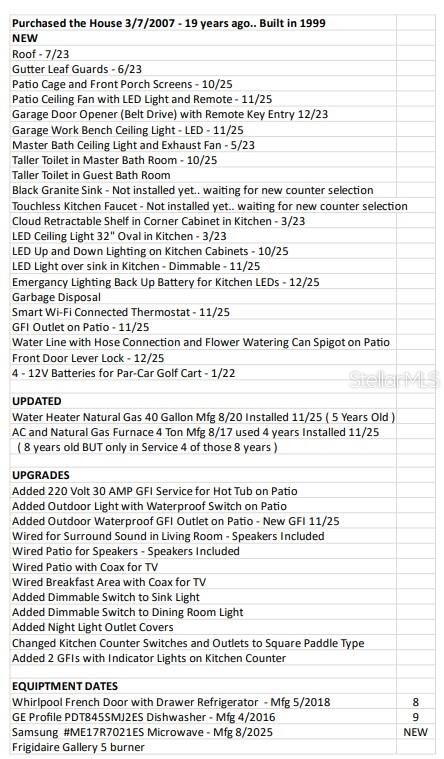 Beautiful 3/2 with vaulted ceilings. Covered Lania and screened in back patio. Many upgrades. New roof 2 years ago. Updated AC and natural gas water heater. Two car garage and 4 parking spaces. Large bedrooms and lots of closet space. Great location.. centrally located in the expansive Villages. Close to lots of retail and restaurants on Hwy 466 which is all accessible by golf cart. The screened in patio is great for entertaining with a BBQ area next to it. There is also a pond.. closed but everything is still there if you would like to revive it! Great neighborhood with driveway and holiday parties. New roof, updated AC, water heater, stove, dishwasher, nice French door refrigerator with a drawer and ice/water on the outside and a new microwave. Here is a list of add-ons and updates: Purchased the House 3/7/2007 - 19 years ago.. Built in 1999 NEW Roof - 7/23 Gutter Leaf Guards - 6/23
