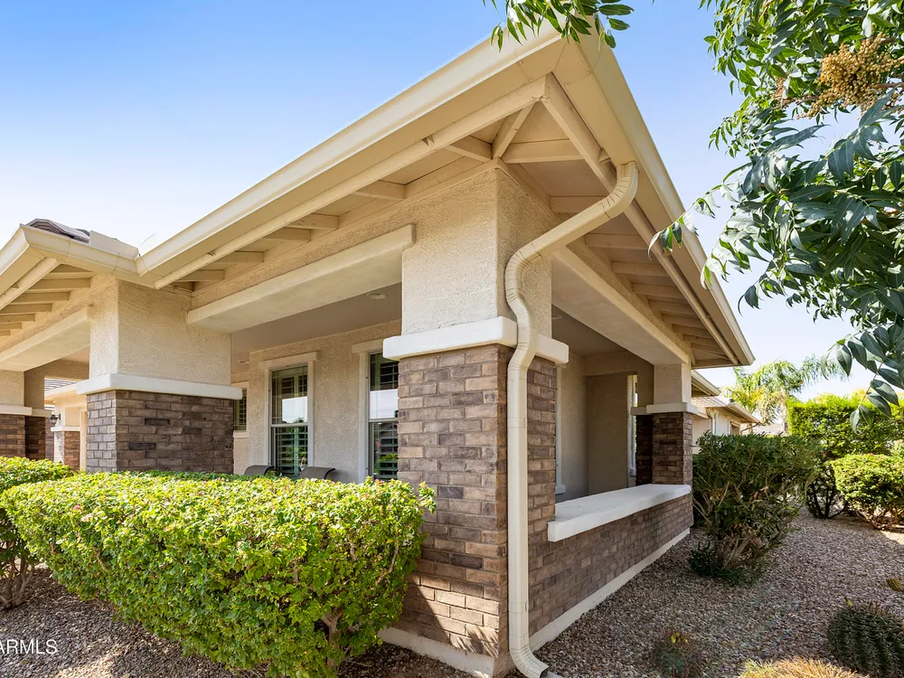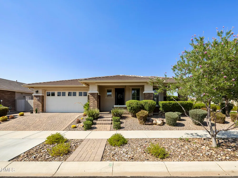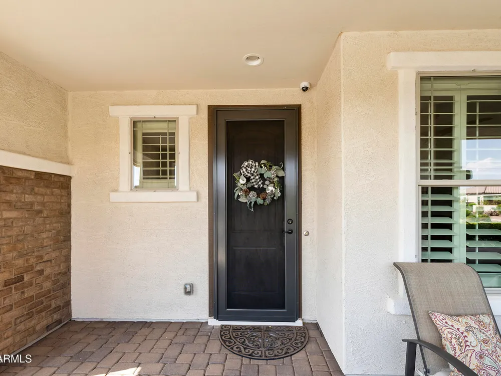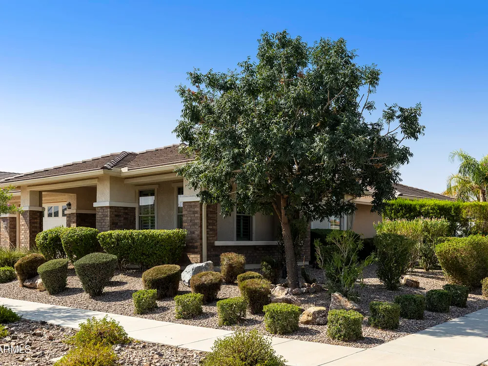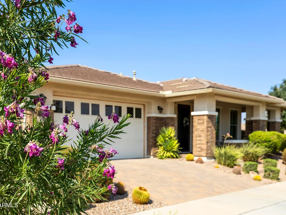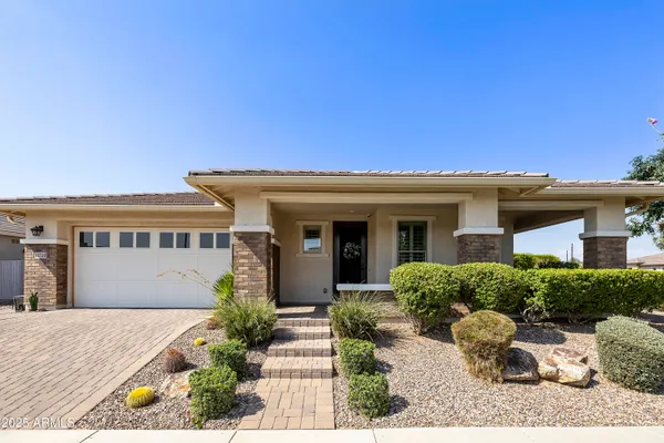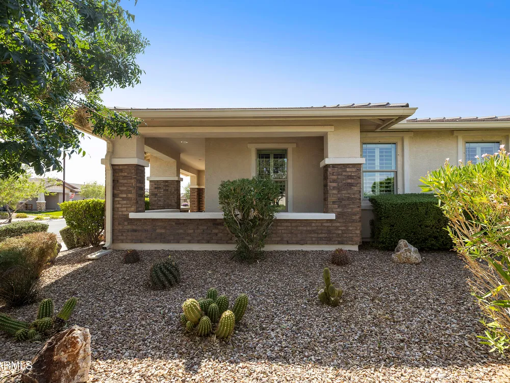 This hard to find 3 bed/2.5 baths home offers the ideal living experience for those seeking active adult living. The expanded Sydney floor plan provides 2 private en-suite baths along with a third bdrm, & den, complemented by a spacious great rm. The chef's kitchen is a standout feature, equipped with KitchenAid SS appliances including wall ovens, a gas cook-top, & a wall-mounted hood. The well-appointed kitchen has 42'' shaker cabinets, subway tile backsplash & pendant lights. The lg island with seating boasts quartz countertops, farm sink, pro-style flex faucet providing ample prep & gathering space. The W-I pantry adds to the kitchen's functionality and storage. Throughout the home, you'll find numerous upgrades, such as 2 multi-sliders (one off the kitchen looking onto the courtyard.. & one off the great room), 8-foot shaker doors, shutters, 5.25-inch baseboards, & engineered wood floors, creating a cohesive & refined aesthetic. Stepping outside, the extended covered patio & spa with steps & storage offers a serene outdoor living space, while the courtyard off the kitchen showcases a pergola & a privacy hedge, providing a lush and private setting. The 2.5-car garage with an epoxy floor, storage cabinets, and overhead storage completes this exceptional property, located on a premium corner lot. You will enjoy the amenities of Encore at Eastmark. Clubhouse with workout facility, movement room, billiards, craft room with 2 kilns, card room, meeting room, Proving Ground Café, pickle ball, tennis and Bocci ball. Something for everyone!! This is a MUST SEE!