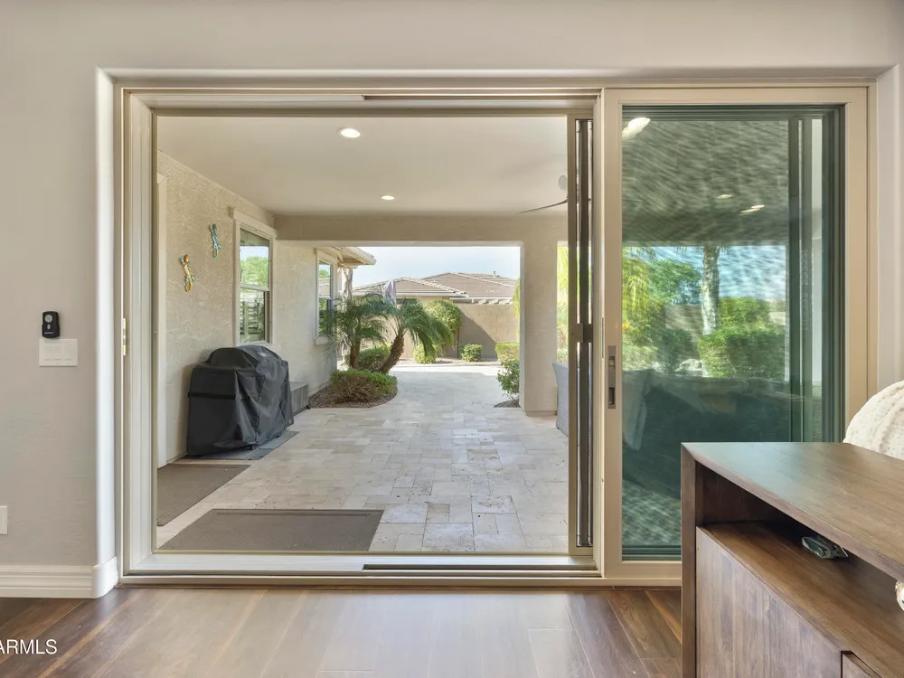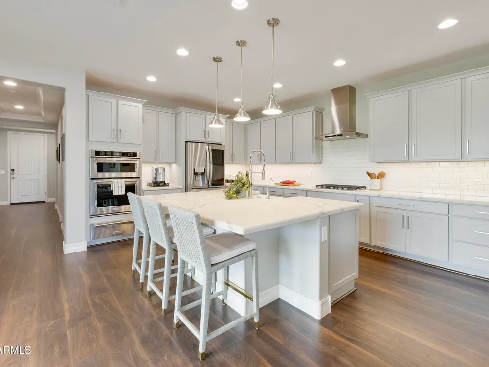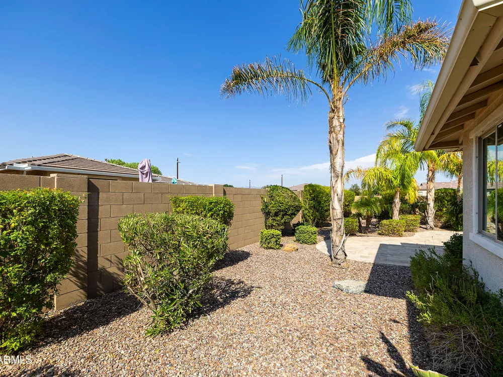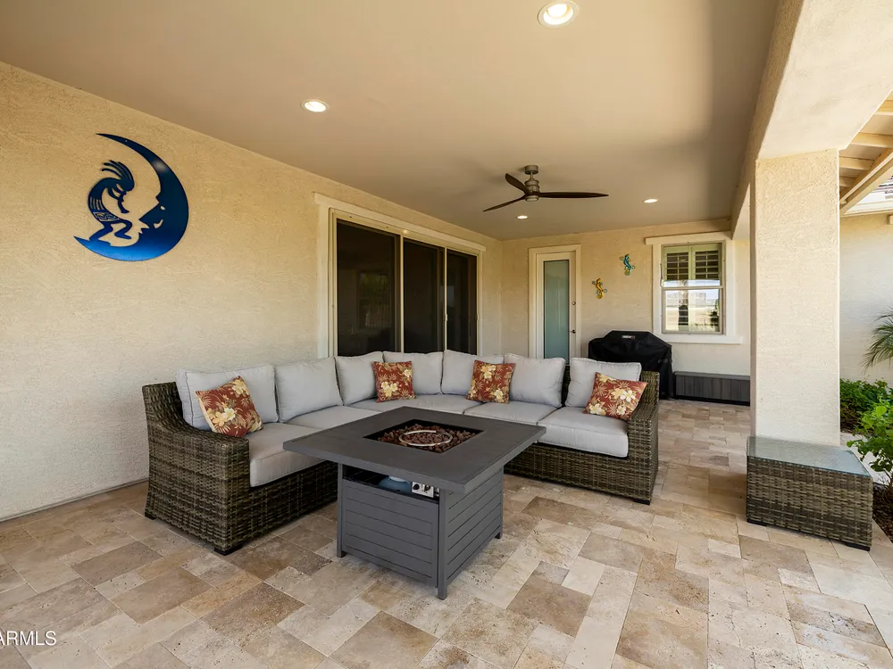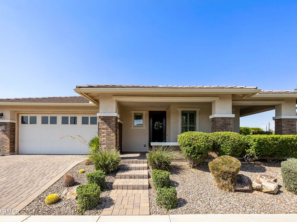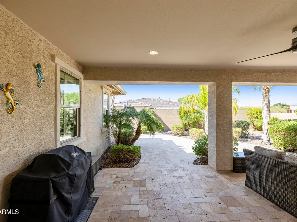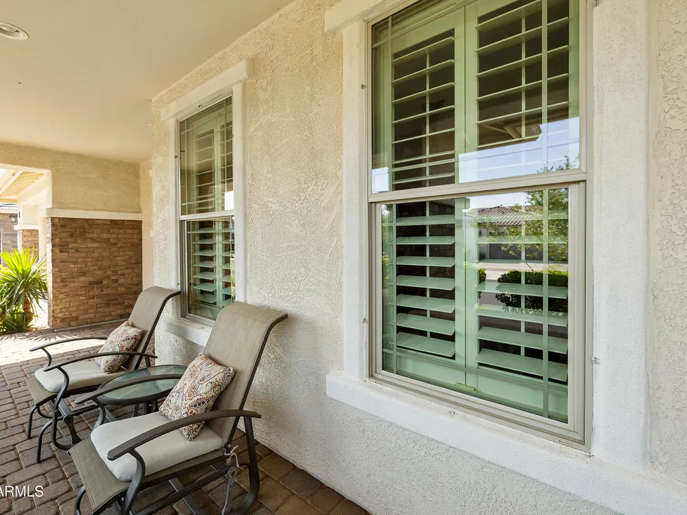 This hard to find 3 bed/2.5 baths home offers the ideal living experience for those seeking active adult living. The expanded Sydney floor plan provides 2 private en-suite baths along with a third bdrm, & den, complemented by a spacious great rm. The chef's kitchen is a standout feature, equipped with KitchenAid SS appliances including wall ovens, a gas cook-top, & a wall-mounted hood. The well-appointed kitchen has 42'' shaker cabinets, subway tile backsplash & pendant lights. The lg island with seating boasts quartz countertops, farm sink, pro-style flex faucet providing ample prep & gathering space. The W-I pantry adds to the kitchen's functionality and storage. Throughout the home, you'll find numerous upgrades, such as 2 multi-sliders (one off the kitchen looking onto the courtyard.. & one off the great room), 8-foot shaker doors, shutters, 5.25-inch baseboards, & engineered wood floors, creating a cohesive & refined aesthetic. Stepping outside, the extended covered patio & spa with steps & storage offers a serene outdoor living space, while the courtyard off the kitchen showcases a pergola & a privacy hedge, providing a lush and private setting. The 2.5-car garage with an epoxy floor, storage cabinets, and overhead storage completes this exceptional property, located on a premium corner lot. You will enjoy the amenities of Encore at Eastmark. Clubhouse with workout facility, movement room, billiards, craft room with 2 kilns, card room, meeting room, Proving Ground Café, pickle ball, tennis and Bocci ball. Something for everyone!! This is a MUST SEE!
