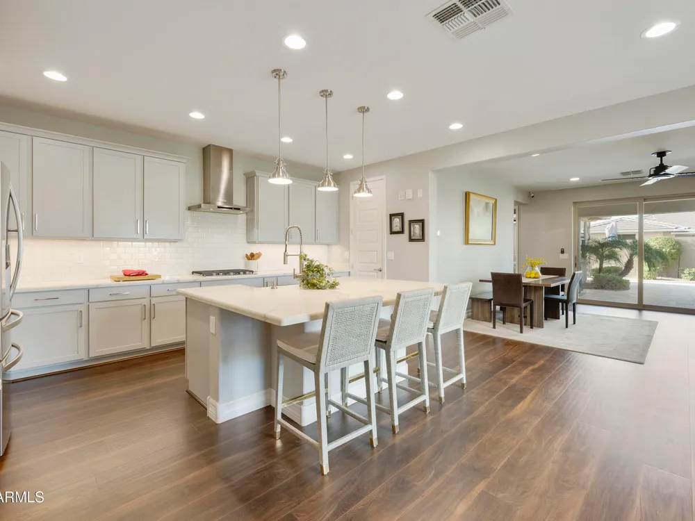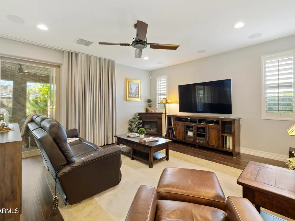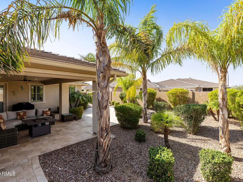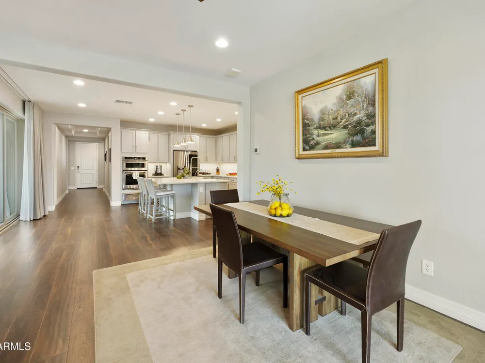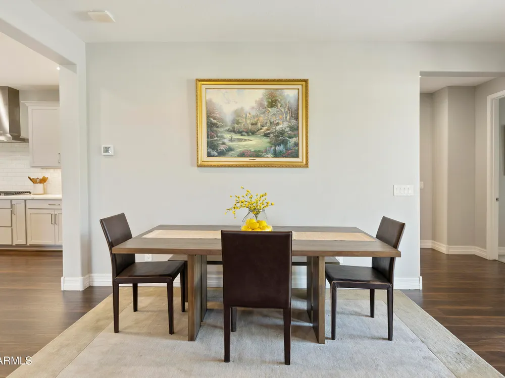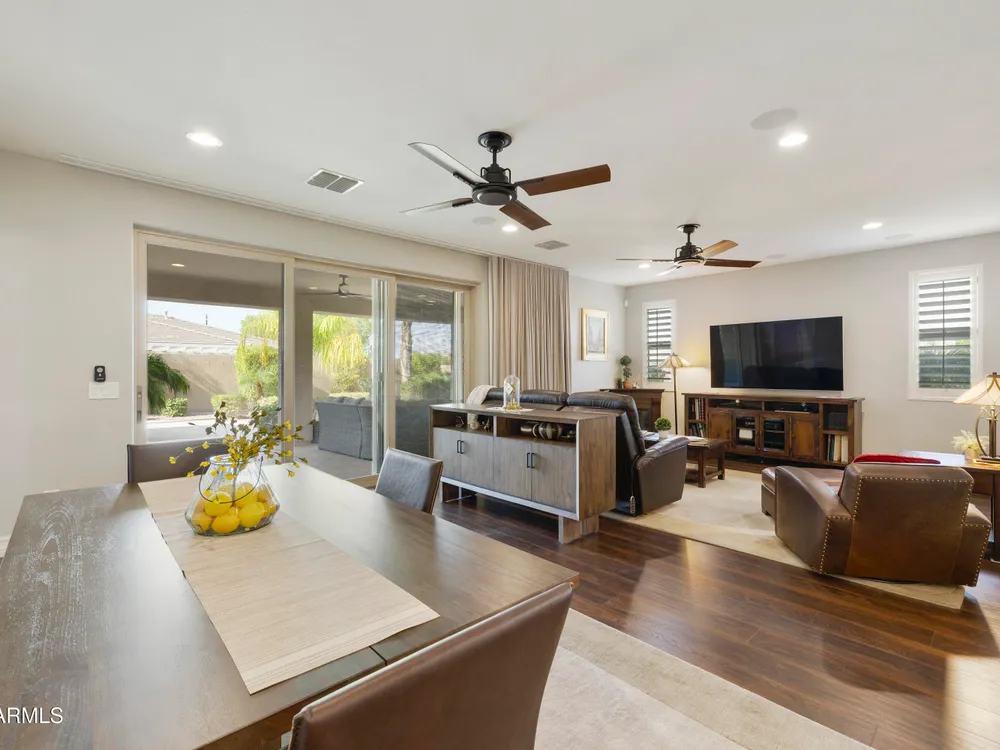 This hard to find 3 bed/2.5 baths home offers the ideal living experience for those seeking active adult living. The expanded Sydney floor plan provides 2 private en-suite baths along with a third bdrm, & den, complemented by a spacious great rm. The chef's kitchen is a standout feature, equipped with KitchenAid SS appliances including wall ovens, a gas cook-top, & a wall-mounted hood. The well-appointed kitchen has 42'' shaker cabinets, subway tile backsplash & pendant lights. The lg island with seating boasts quartz countertops, farm sink, pro-style flex faucet providing ample prep & gathering space. The W-I pantry adds to the kitchen's functionality and storage. Throughout the home, you'll find numerous upgrades, such as 2 multi-sliders (one off the kitchen looking onto the courtyard.. & one off the great room), 8-foot shaker doors, shutters, 5.25-inch baseboards, & engineered wood floors, creating a cohesive & refined aesthetic. Stepping outside, the extended covered patio & spa with steps & storage offers a serene outdoor living space, while the courtyard off the kitchen showcases a pergola & a privacy hedge, providing a lush and private setting. The 2.5-car garage with an epoxy floor, storage cabinets, and overhead storage completes this exceptional property, located on a premium corner lot. You will enjoy the amenities of Encore at Eastmark. Clubhouse with workout facility, movement room, billiards, craft room with 2 kilns, card room, meeting room, Proving Ground Café, pickle ball, tennis and Bocci ball. Something for everyone!! This is a MUST SEE!