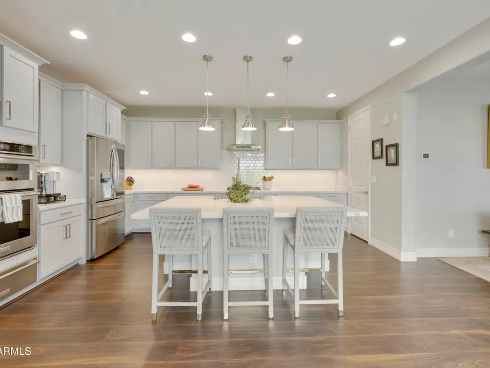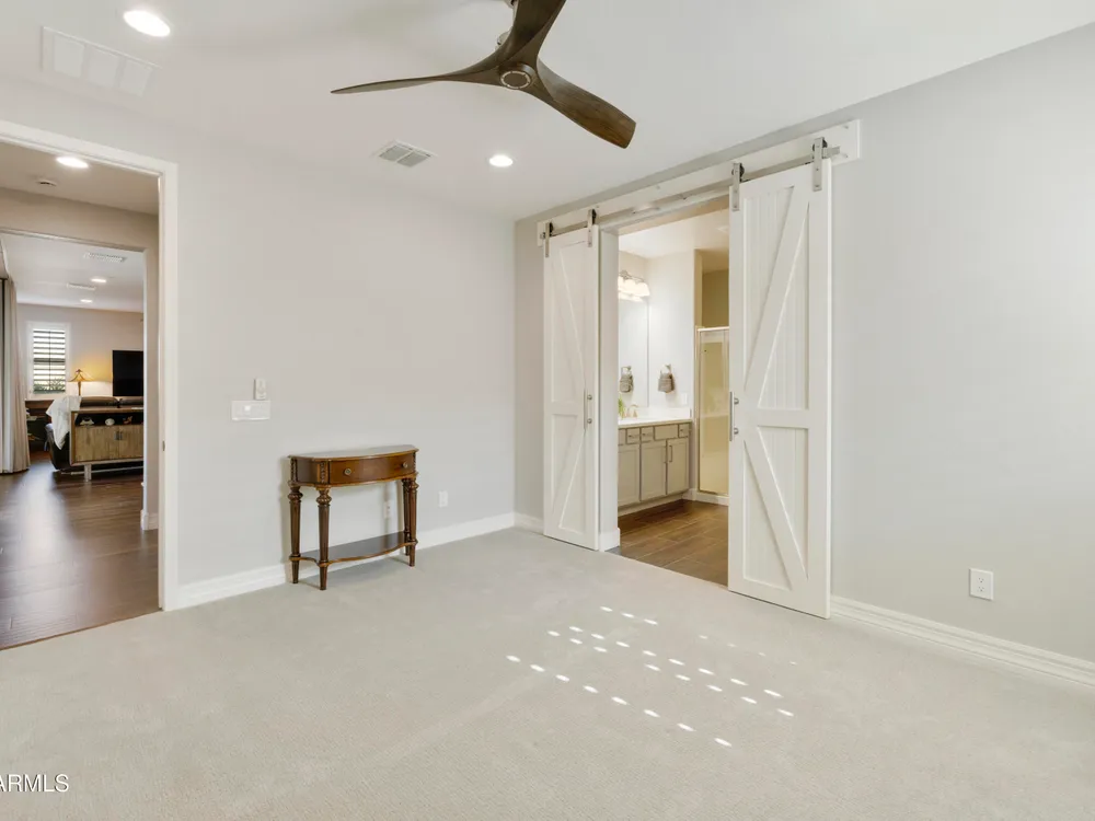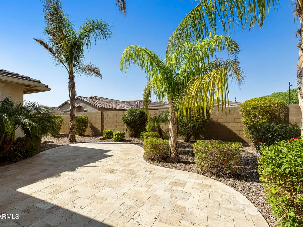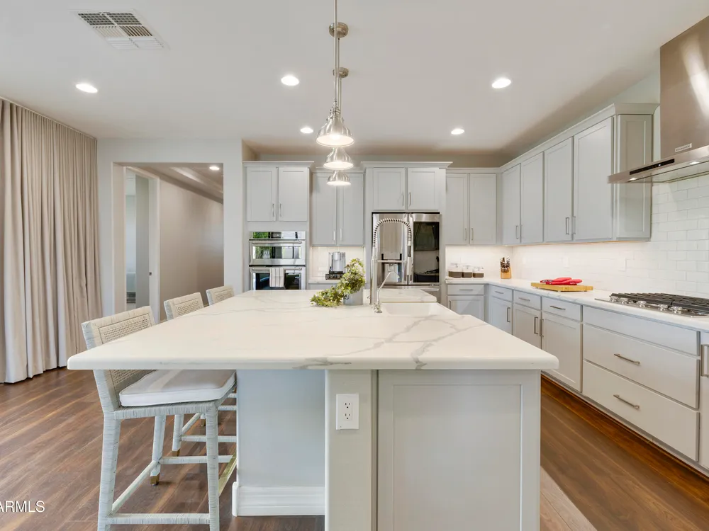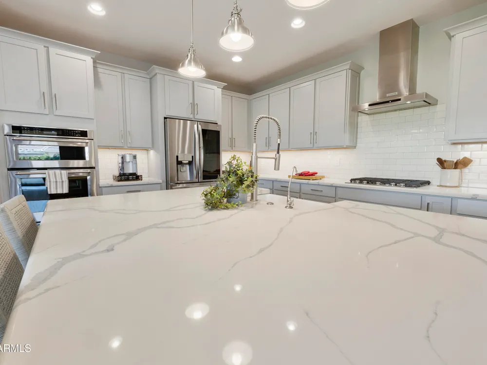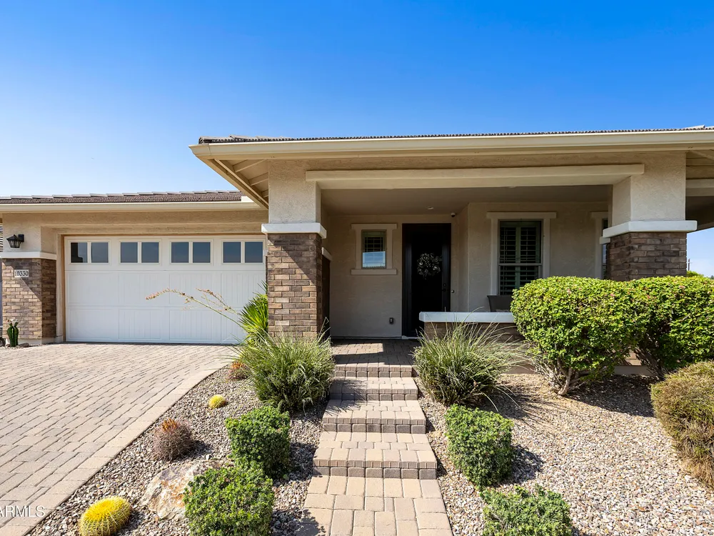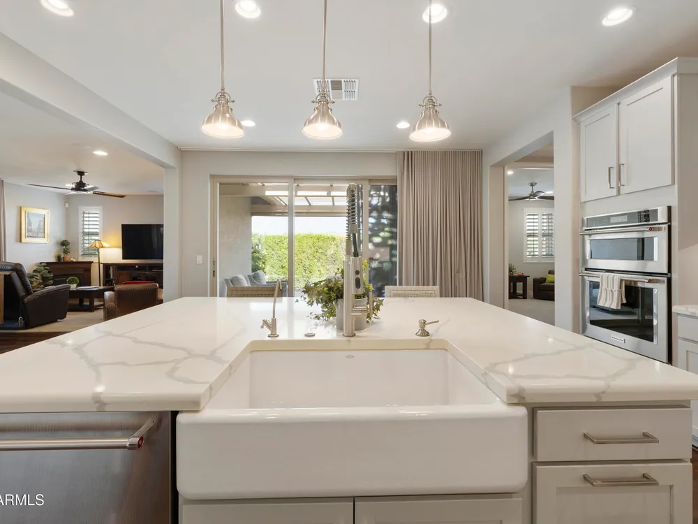 This hard to find 3 bed/2.5 baths home offers the ideal living experience for those seeking active adult living. The expanded Sydney floor plan provides 2 private en-suite baths along with a third bdrm, & den, complemented by a spacious great rm. The chef's kitchen is a standout feature, equipped with KitchenAid SS appliances including wall ovens, a gas cook-top, & a wall-mounted hood. The well-appointed kitchen has 42'' shaker cabinets, subway tile backsplash & pendant lights. The lg island with seating boasts quartz countertops, farm sink, pro-style flex faucet providing ample prep & gathering space. The W-I pantry adds to the kitchen's functionality and storage. Throughout the home, you'll find numerous upgrades, such as 2 multi-sliders (one off the kitchen looking onto the courtyard.. & one off the great room), 8-foot shaker doors, shutters, 5.25-inch baseboards, & engineered wood floors, creating a cohesive & refined aesthetic. Stepping outside, the extended covered patio & spa with steps & storage offers a serene outdoor living space, while the courtyard off the kitchen showcases a pergola & a privacy hedge, providing a lush and private setting. The 2.5-car garage with an epoxy floor, storage cabinets, and overhead storage completes this exceptional property, located on a premium corner lot. You will enjoy the amenities of Encore at Eastmark. Clubhouse with workout facility, movement room, billiards, craft room with 2 kilns, card room, meeting room, Proving Ground Café, pickle ball, tennis and Bocci ball. Something for everyone!! This is a MUST SEE!