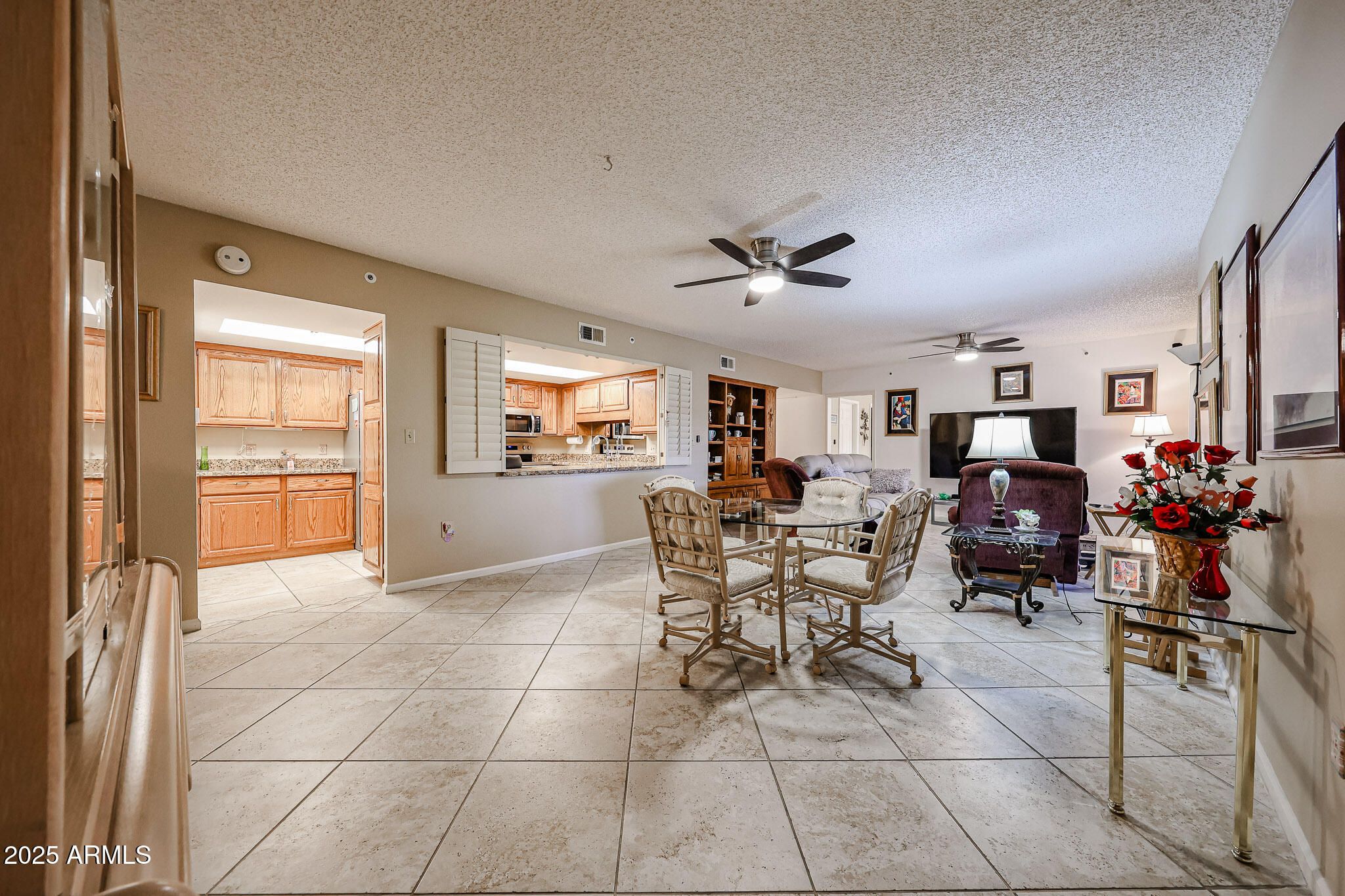 55+ Independent living! New HVAC in 2023. Largest, most popular two-bedroom floorplan features a beautiful office/den and over 1500+ sq ft of living space with gorgeous oak cabinets! Spacious updated kitchen with granite countertops, newer stainless appliances including a new stove and dishwasher! The unit has attractive neutral tile flooring with a wood floor entryway! The master bath has a newer walk-in shower, the second bath has a very desirable walk-in tub with a shower. Monthly fee is $2455 for one person. 2nd person is $745 which includes meals. HOA provides for many additional amenities described in supplemental remarks below. Enjoy cruise ship style living at El Dorado! Your deed includes home OWNERSHIP! and 1/249th of the common areas of El Dorado in this non-profit organization. This community is located on Viewpoint Lake in Sun City. HOA fees include the following: Elegant Dining Room that serves breakfast, lunch, dinner and monthly fee covers 30 four course meals a month, Weekly housekeeping (one to two hours) with linen service and beds re made, Medical transportation with in 8 miles of community and Sky Harbor transportation included, Nurses on staff for emergencies and advocacy from 7am -11pm and security staff from 11pm to 7am, water, sewer, trash, Covered parking for your car and golf cart, personal keyed mailbox, Basic Cox cable and In-House TV Channel included, 12 complimentary laundry rooms throughout the building, Infrared Perimeter Security System and all perimeter doors are key locked with resident access only, Outdoor Heated pool and spa, Fitness Center, TV Lounge with WiFi, Small Private Storage Space, Library, Card Room, Billiards Room, Auditorium, Lakeside Lounges, Art Gallery, Lakefront Fishing, And much, much more