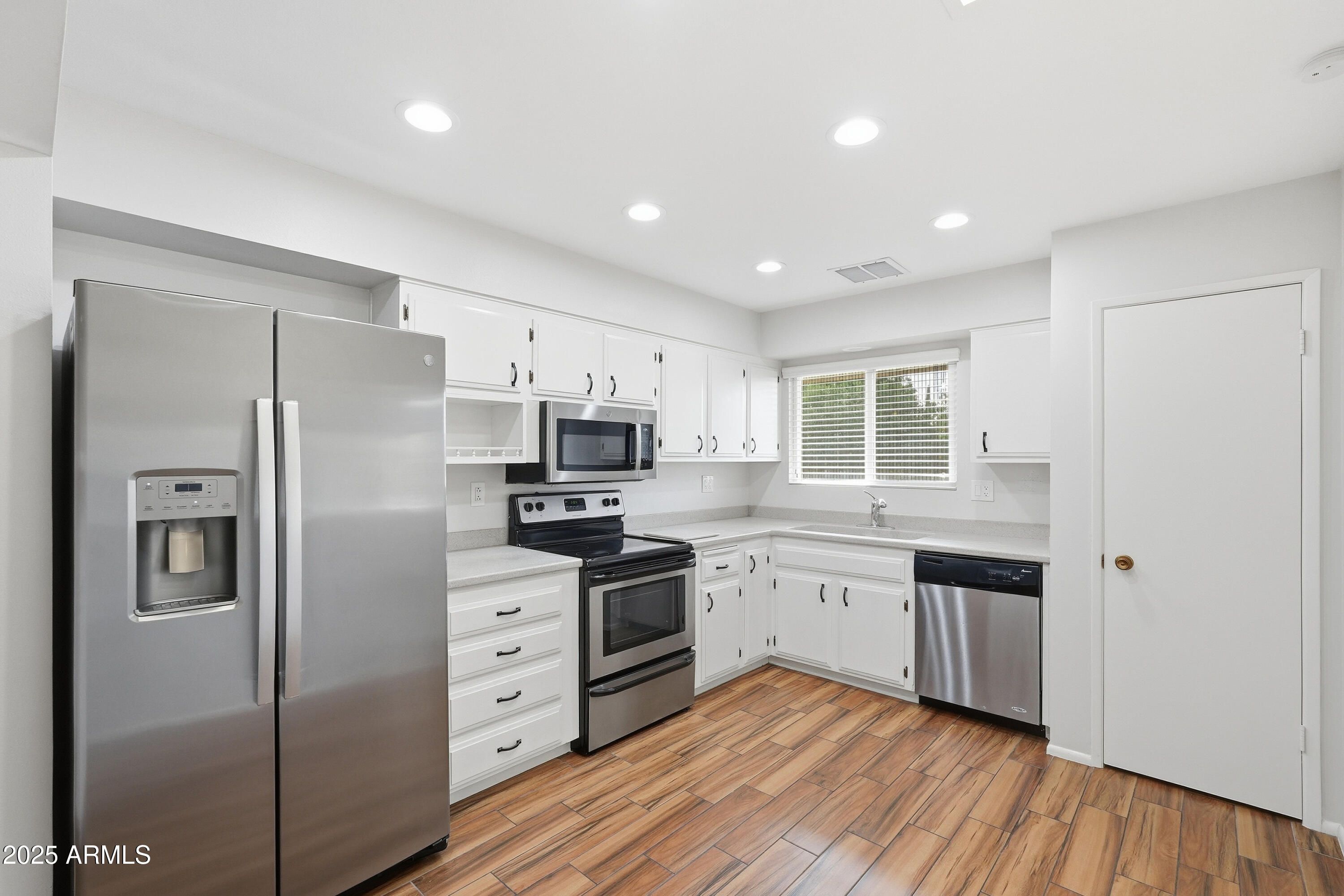 This well-maintained two-bedroom, two-bathroom house offers 1,382 square feet of living space, The kitchen features restored cabinets, upgraded hardware, Corian countertops, and stainless-steel appliances, complemented by canned lighting. The home boasts newer ceiling fans, tile floors, and carpeting in the bedrooms, as well as updated window treatments, a newer roof with gutters, and a newer air conditioning unit. The two-car garage has an epoxied floor and an insulated garage door, providing ample storage space. The large laundry room includes a golf cart entrance, offering added convenience. The property sits on a spacious 8,867 lot with mature fruit trees. The AZ room (approx. 132 sq. ft. and laundry room approx. 120 sq. ft.) are not included in the original sq. ft. of 1,119.
