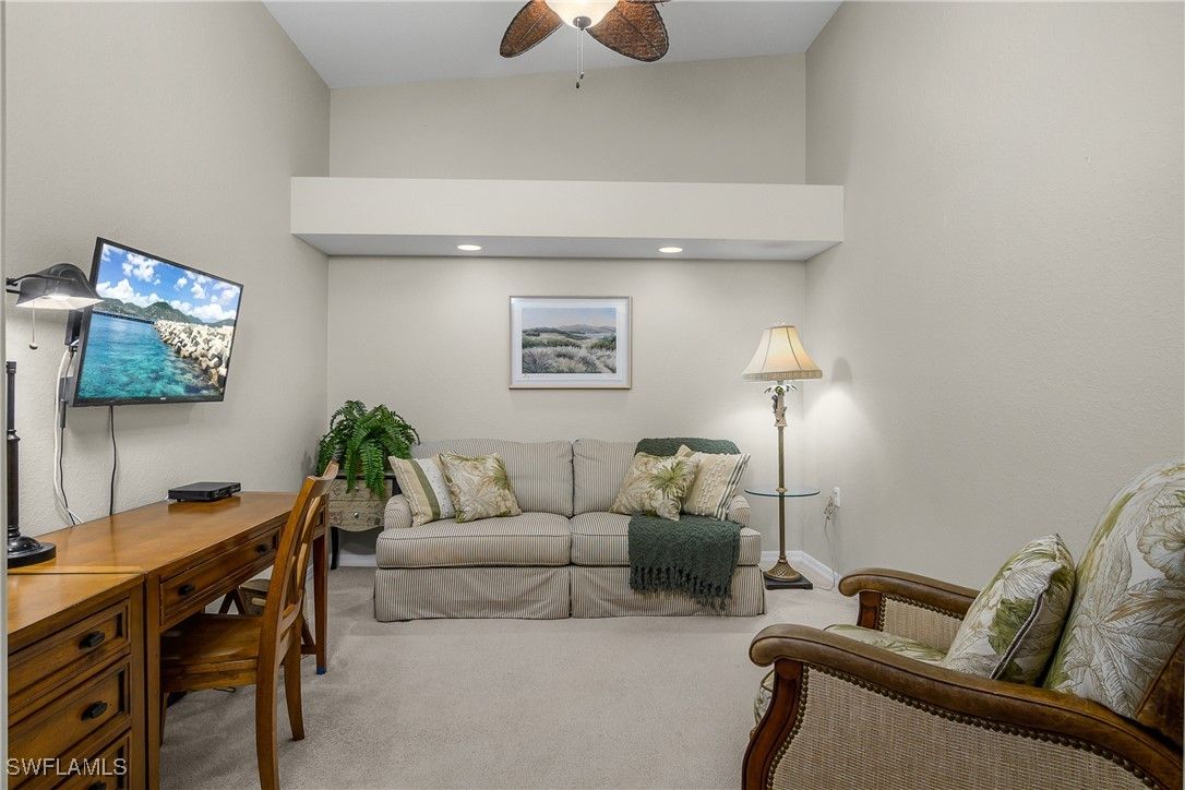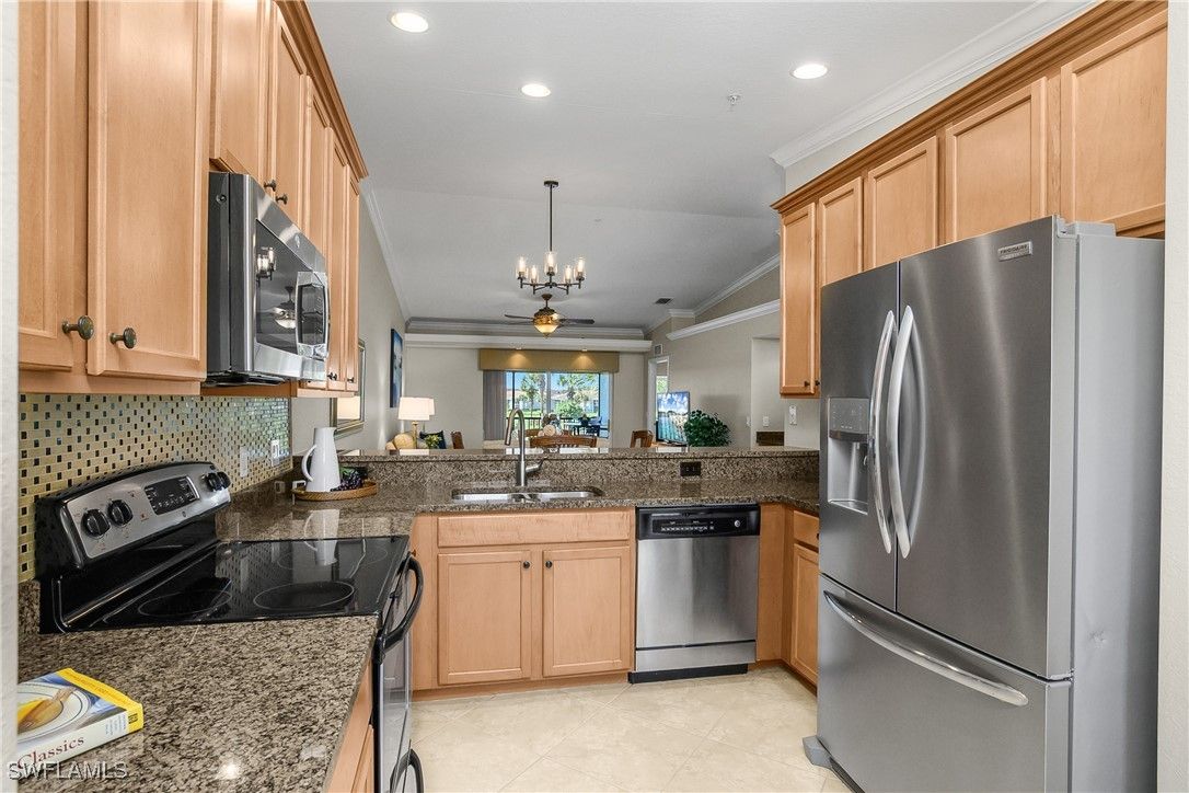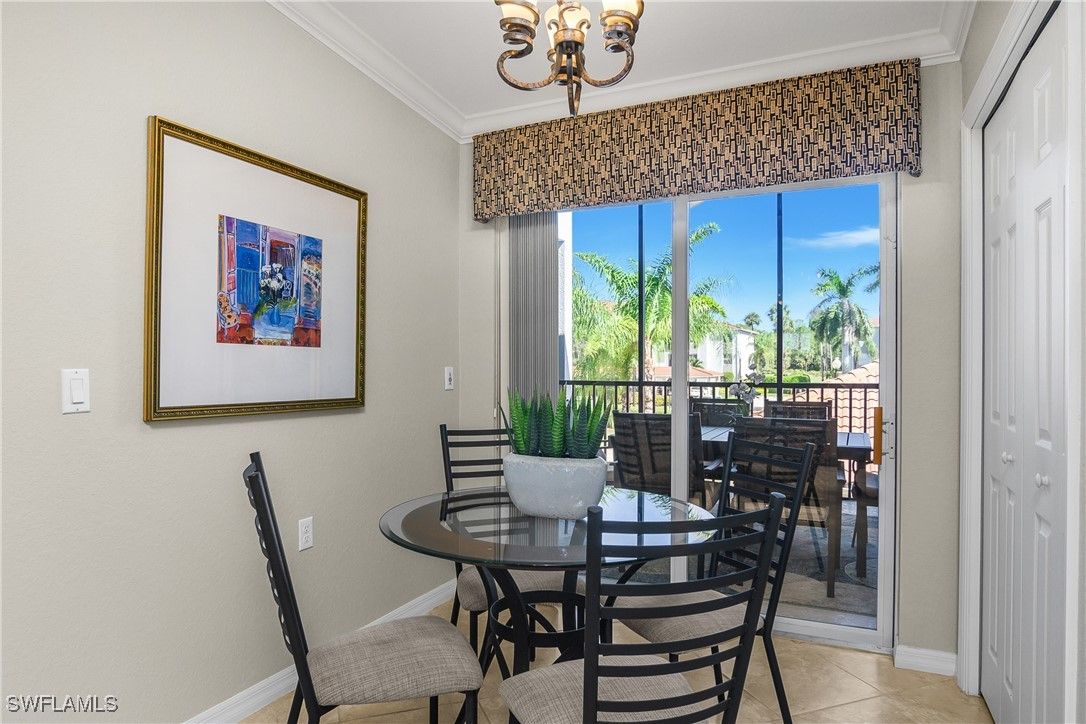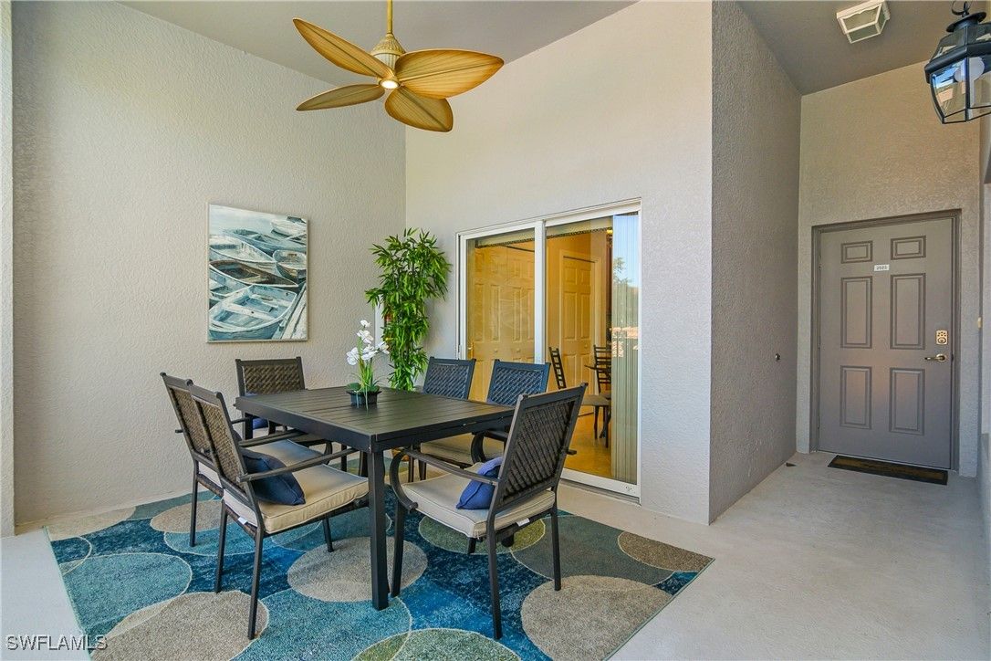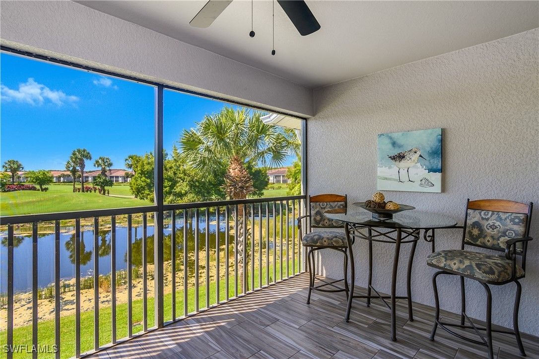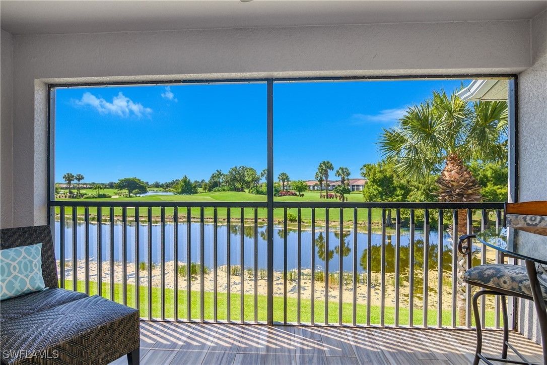 Welcome to this beautifully maintained second-floor Barrington model, 2-bedroom and a den, 2-bathroom Veranda in the highly sought-after bundled golf community of Heritage Bay in Naples, Florida. This residence is being offered turnkey furnished, allowing you to move in and immediately enjoy the resort-style lifestyle that Heritage Bay is known for. Enjoy southern exposure and breathtaking panoramic golf course and water views from your rear lanai, enhanced with no-see-um screens and upgraded wood-look plank tile flooring. The front lanai also features no-see-um screens, providing multiple outdoor spaces to relax and entertain. Just steps away, you’ll appreciate the convenience of being located next to one of the community’s five satellite pools. Inside, this home showcases high ceilings, crown moulding, and tasteful décor that create a light and airy atmosphere. The kitchen is equipped with granite countertops, stainless steel appliances, and a new microwave, designed for everyday ease. Additional upgrades include a new washing machine (2025), newer dryer, and a 2024 water heater, all offering peace of mind and energy efficiency. The primary suite provides serene views and comfort, while the flexible den space offers options for a home office or guest accommodations. The condo also includes a one-car detached garage for added convenience. Heritage Bay is one of Naples’ premier golf and country club communities, offering 27 holes of golf, tennis, pickleball, bocce ball, a state-of-the-art fitness center, resort-style pools, and multiple dining venues. With its vibrant social calendar and beautifully renovated clubhouse, Heritage Bay delivers the perfect blend of active living and relaxation. If you are searching for a turnkey second home, seasonal retreat, or full-time residence in Naples, FL, this veranda condo combines luxury, comfort, and convenience in a community that has it all.