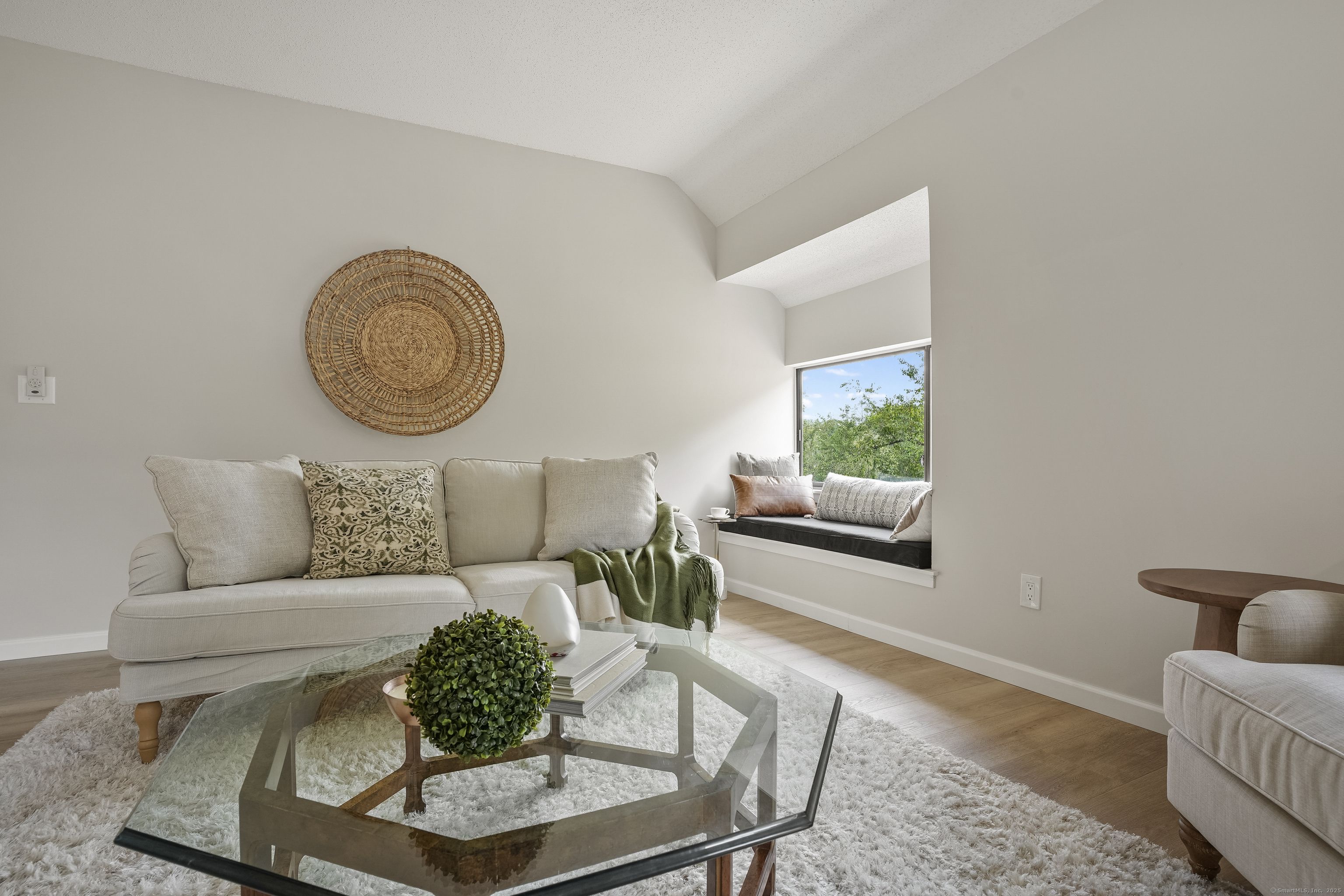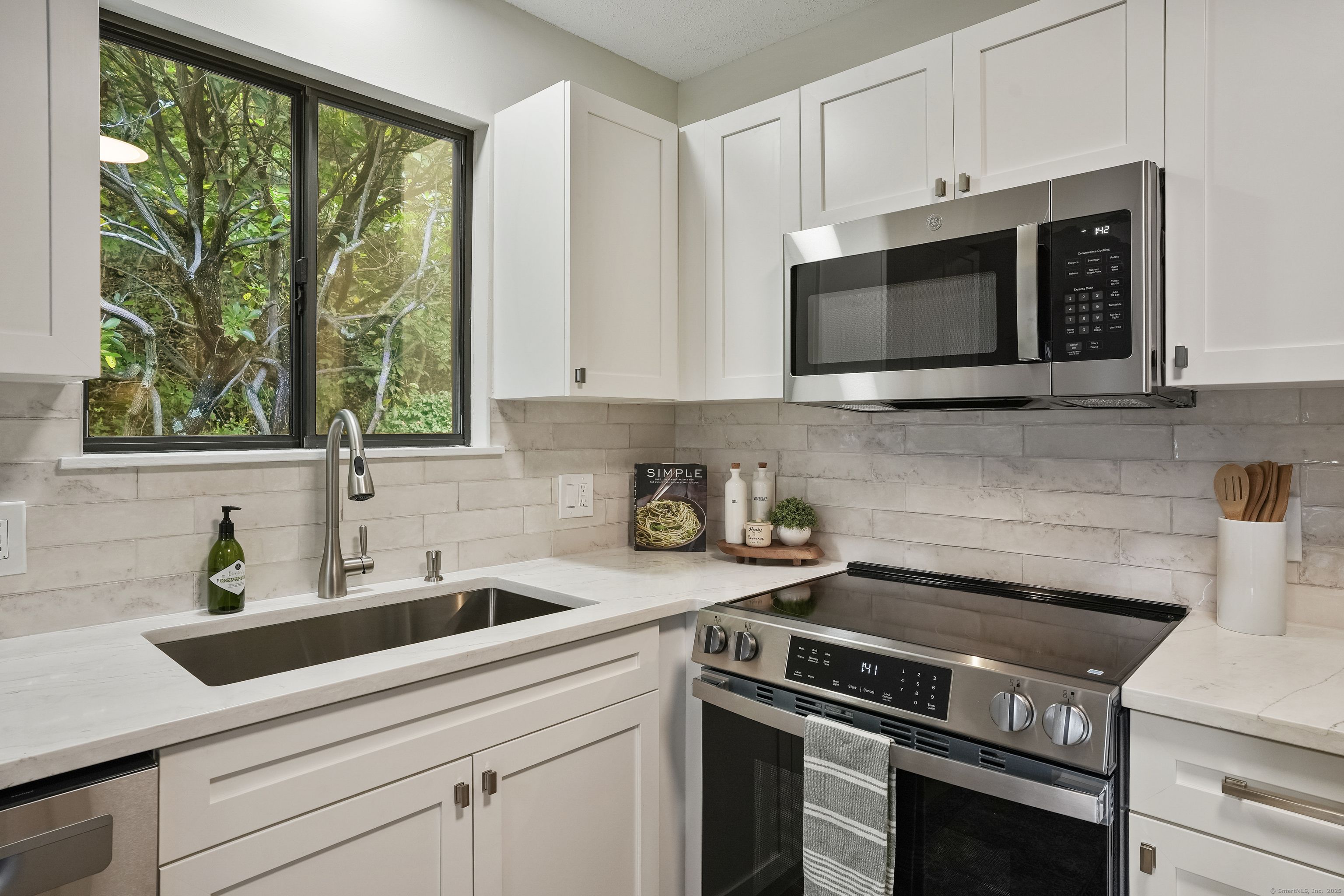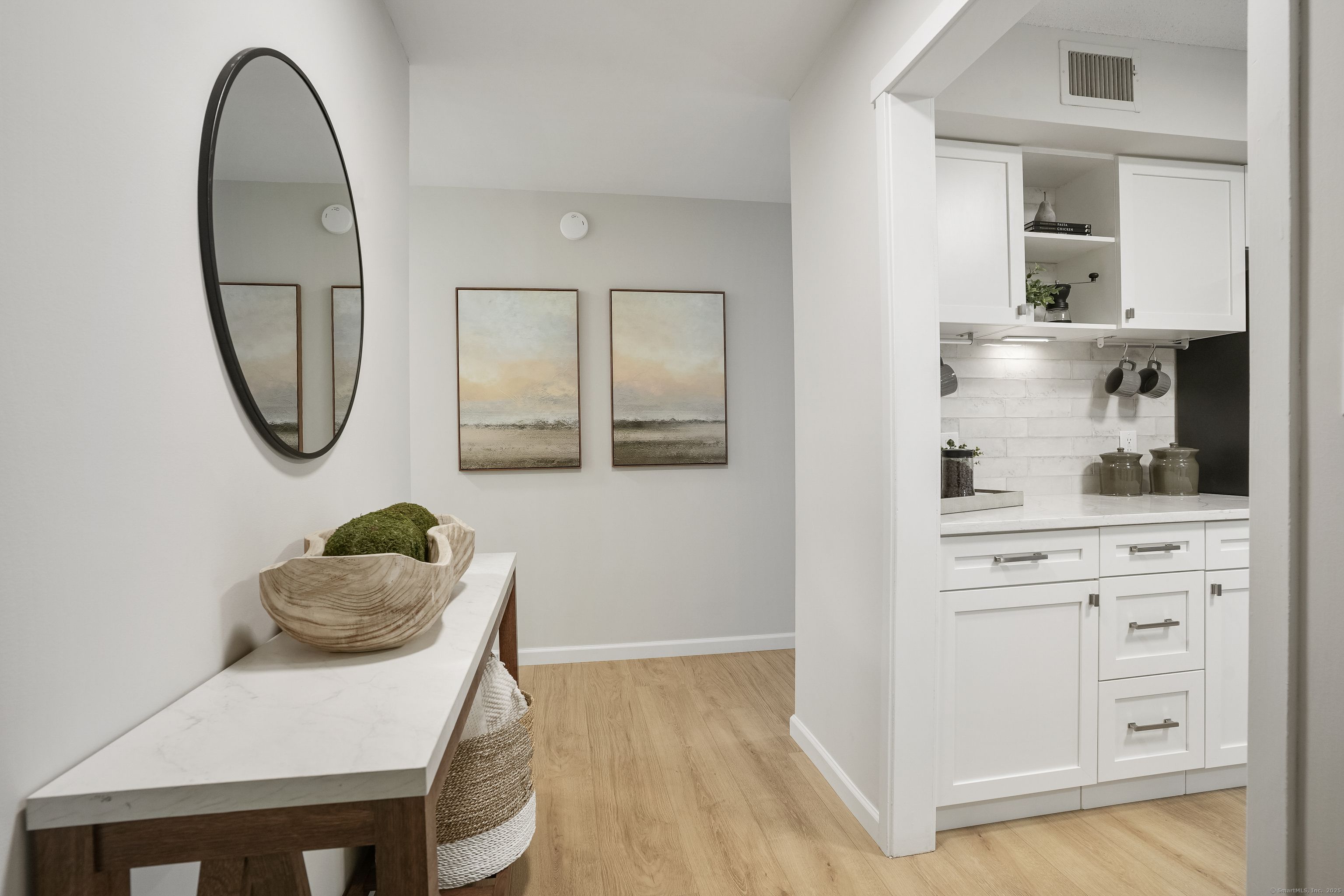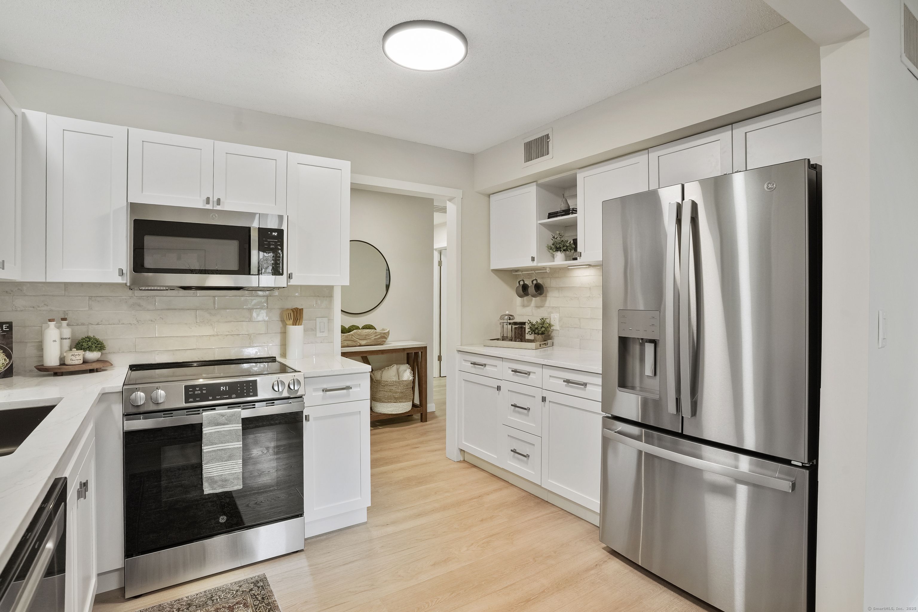 Be the first to enjoy this beautifully renovated 1-bedroom, 1-bath condo located in the sought-after 55+ active adult community of Heritage Village. This condo has been meticulously updated inside and out! The exterior has just been restored, including the replacement of cedar planks and a fresh coat of paint. The roof was replaced in 2023. Inside, this stylish unit offers plenty of room for two, with a smartly redesigned layout that maximizes comfort and convenience. Chic wide-plank hybrid waterproof laminate flooring throughout, that look and feel like real hardwood. The kitchen boasts new shaker cabinets with soft-close hinges, a rechargeable under cabinet motion light, sleek stainless steel appliances, stunning quartz countertops, a tile backsplash, and a remodeled open floor plan. The renovated bathroom showcases an elegant, floor-to-ceiling tiled shower, a spacious double vanity with a modern lighted mirror featuring dual illumination, and a smartly integrated laundry area-blending contemporary design with everyday convenience. The large primary bedroom is filled with natural light and includes a charming window seat. Energy-efficient updates include a new heat pump, water heater, LED lighting, and ceiling fans. New interior doors, baseboards, and a fresh coat of paint create a polished, modern look that instantly elevates the space. Even the garage has been refreshed with a new LiftMaster opener and updated hardware. HOA fee includes Spectrum cable/inter.