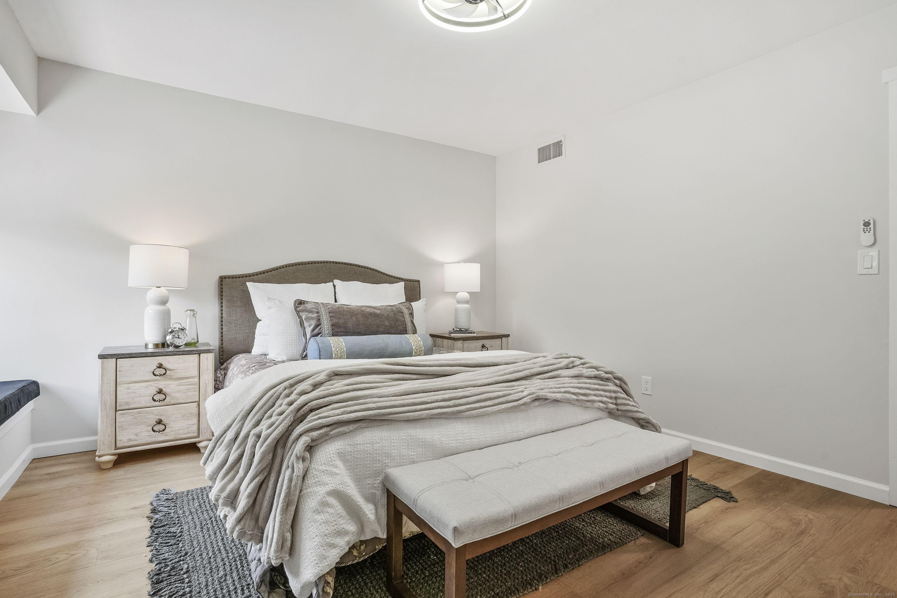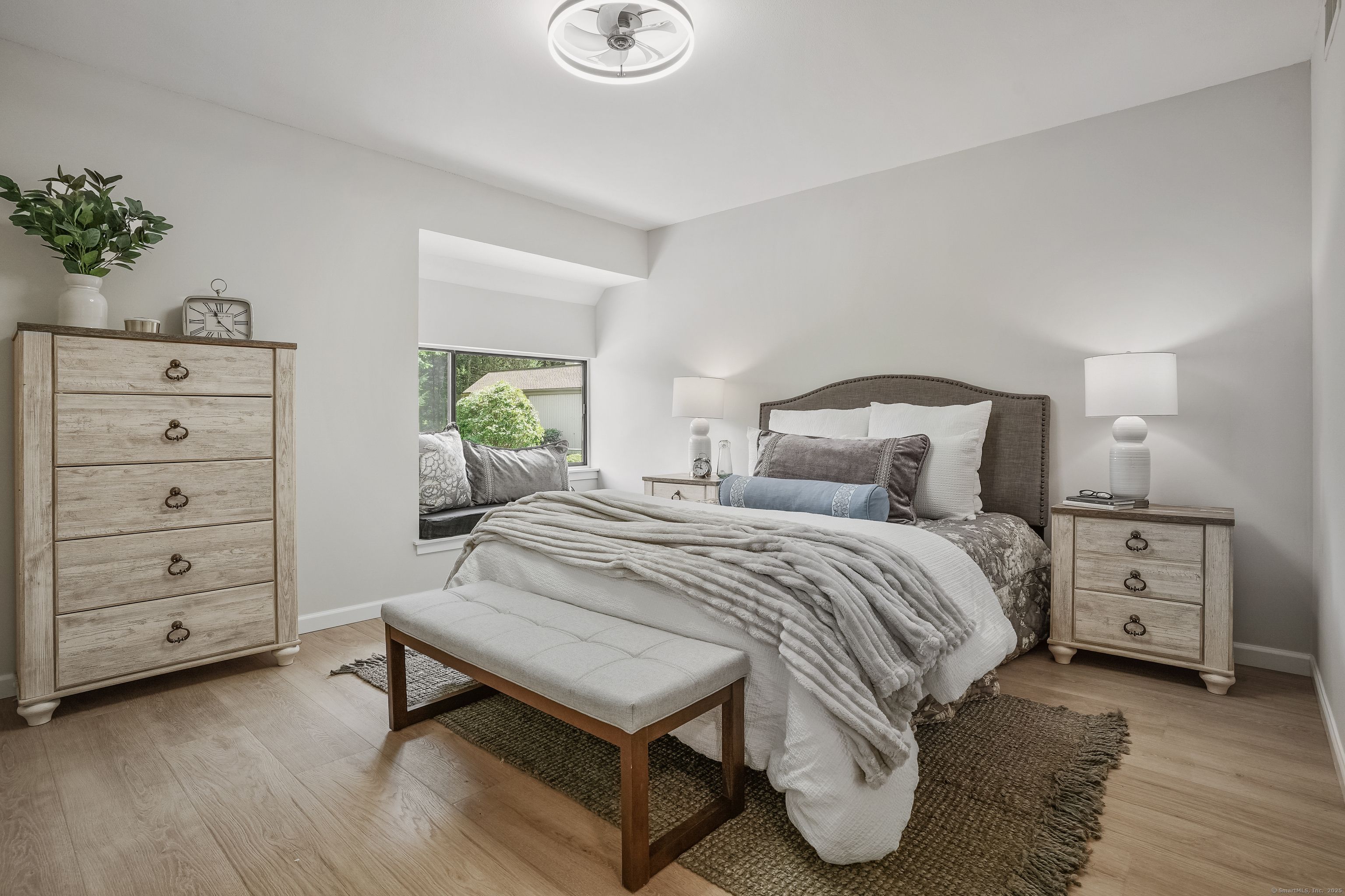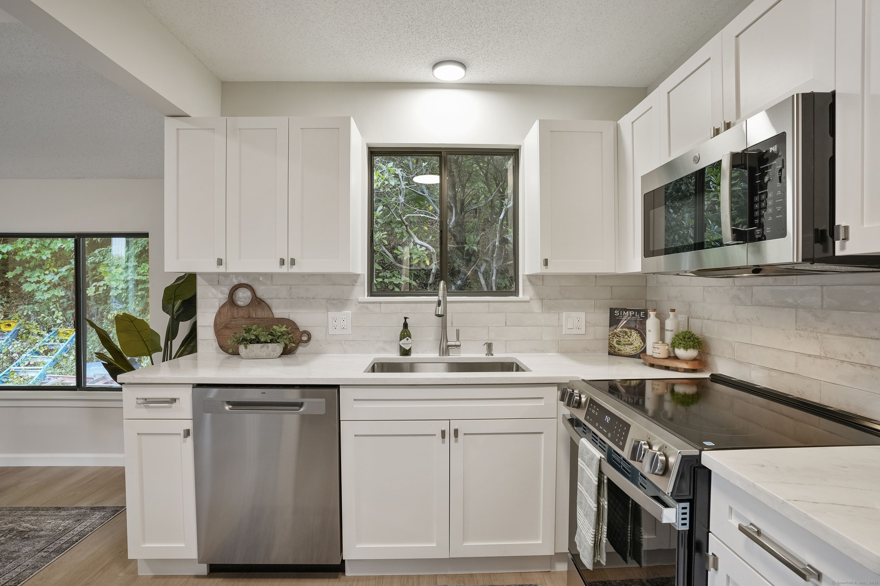 Be the first to enjoy this beautifully renovated 1-bedroom, 1-bath condo located in the sought-after 55+ active adult community of Heritage Village. This condo has been meticulously updated inside and out! The exterior has just been restored, including the replacement of cedar planks and a fresh coat of paint. The roof was replaced in 2023. Inside, this stylish unit offers plenty of room for two, with a smartly redesigned layout that maximizes comfort and convenience. Chic wide-plank hybrid waterproof laminate flooring throughout, that look and feel like real hardwood. The kitchen boasts new shaker cabinets with soft-close hinges, a rechargeable under cabinet motion light, sleek stainless steel appliances, stunning quartz countertops, a tile backsplash, and a remodeled open floor plan. The renovated bathroom showcases an elegant, floor-to-ceiling tiled shower, a spacious double vanity with a modern lighted mirror featuring dual illumination, and a smartly integrated laundry area-blending contemporary design with everyday convenience. The large primary bedroom is filled with natural light and includes a charming window seat. Energy-efficient updates include a new heat pump, water heater, LED lighting, and ceiling fans. New interior doors, baseboards, and a fresh coat of paint create a polished, modern look that instantly elevates the space. Even the garage has been refreshed with a new LiftMaster opener and updated hardware. HOA fee includes Spectrum cable/inter.