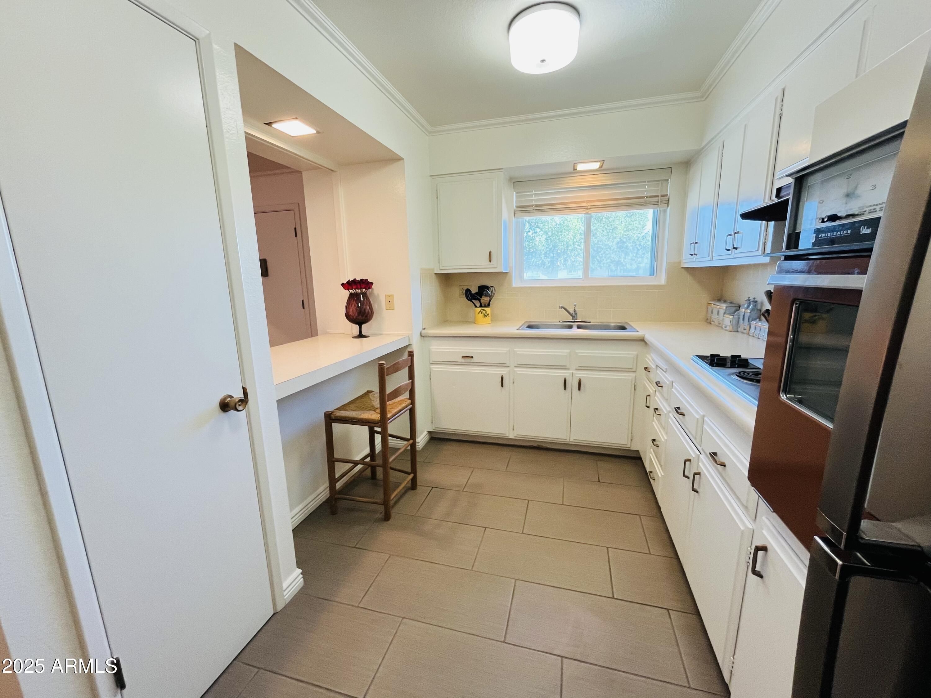 Welcome to easy living in this beautifully updated one bedroom, one bath condo located in the desirable Sun City 55+ community. This light-filled home features numerous upgrades throughout, including new Anderson windows and doors, highlighted by elegant French doors that open to a private patio - perfect for enjoying indoor-outdoor living. The private patio showcases five large pots complete with an irrigation system-all included with the home. New stone flooring runs throughout the home, complemented by new baseboards and crown molding that add a refined finish. The updated bathroom and new electric water heater provide modern comfort and peace of mind. The kitchen offers a charming retro vibe and a lovely view of the well maintained courtyard.