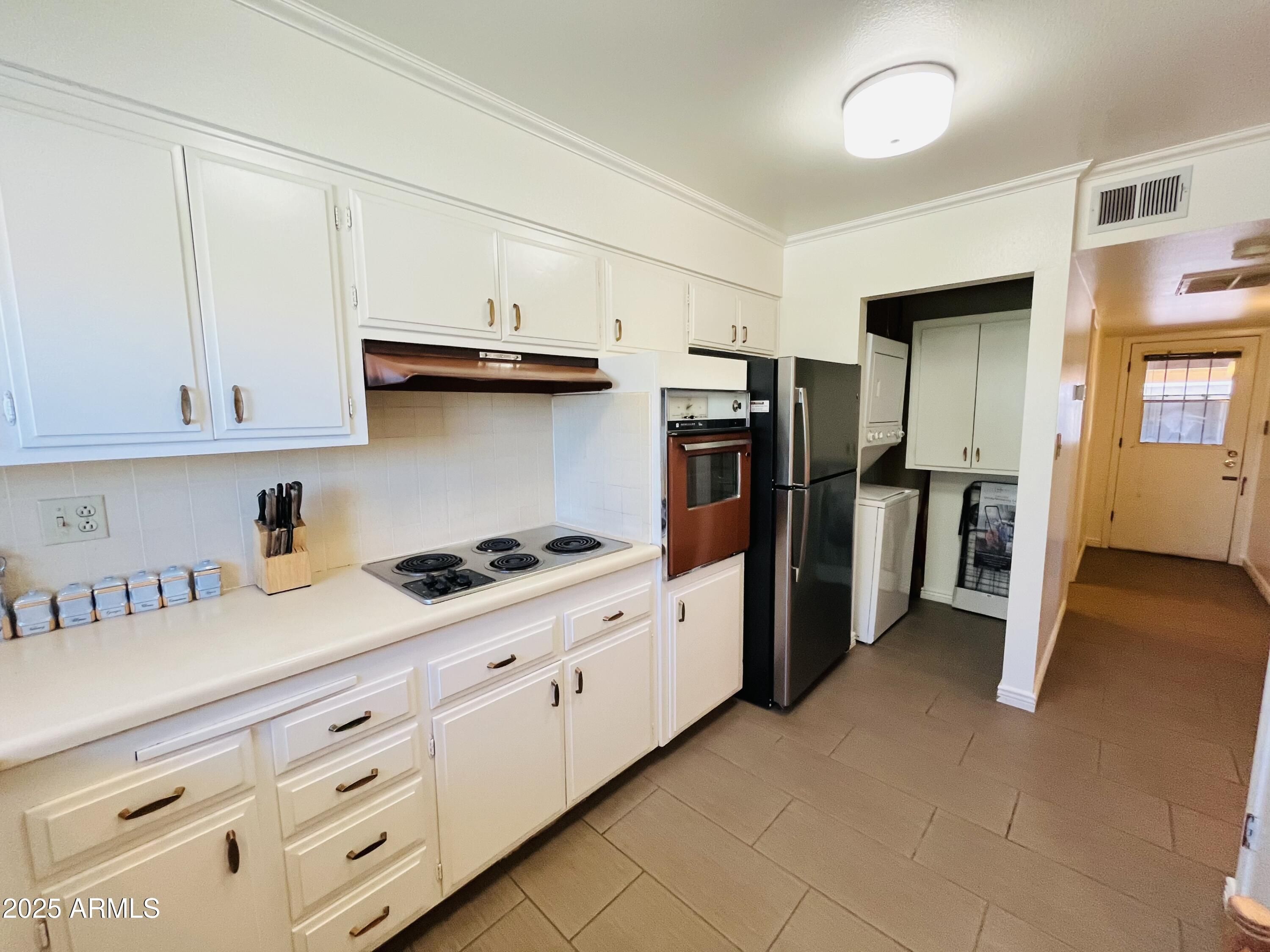 - Stacked Washer/Dryer, Refrigerator, Disposal, Electric Range, Built-In Electric Oven