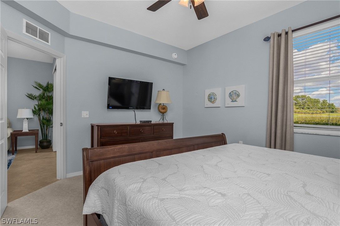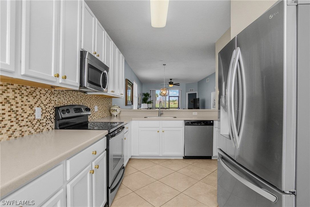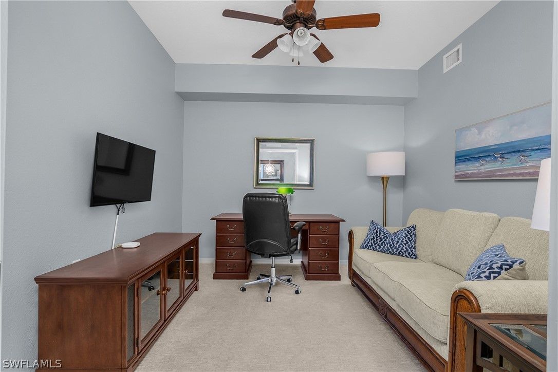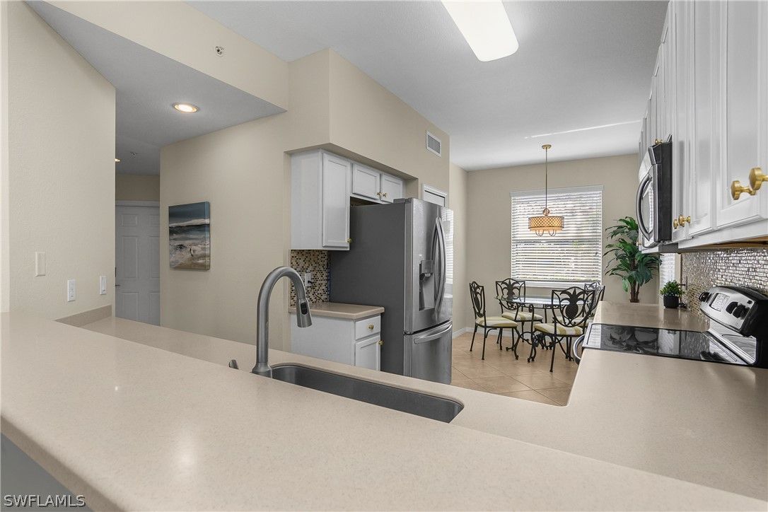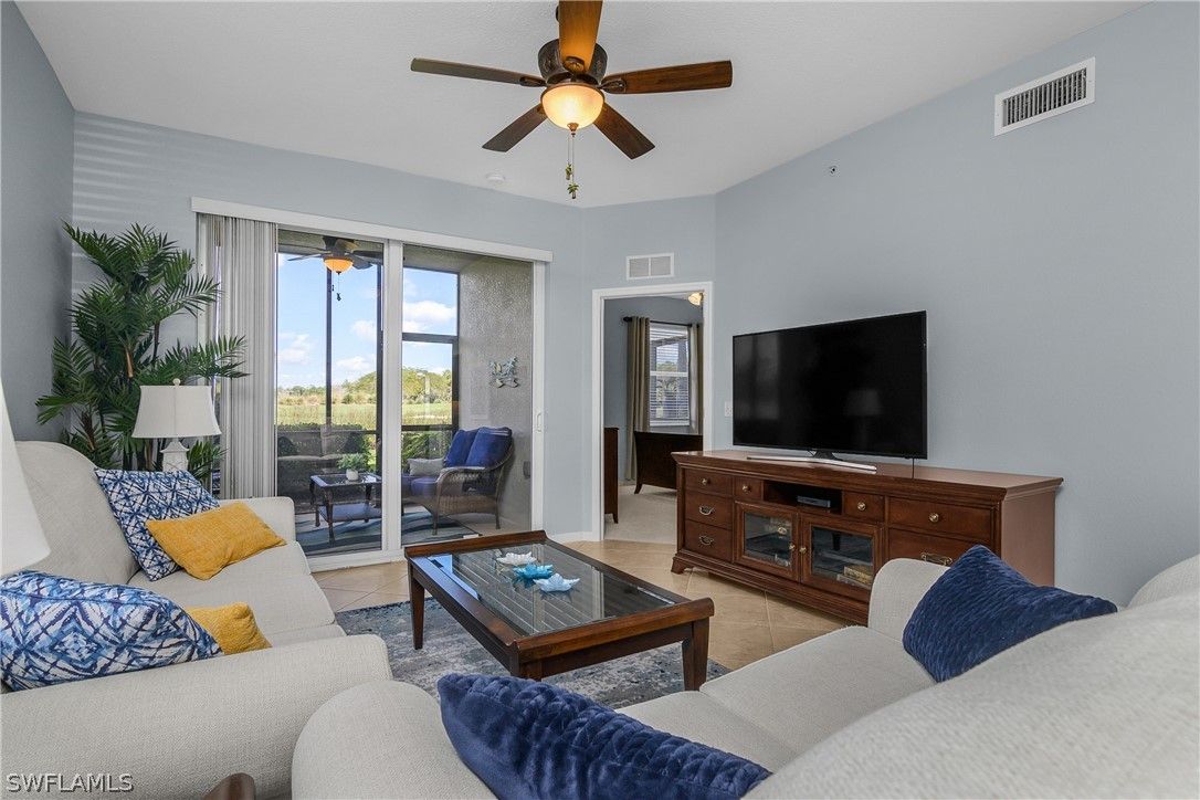 Bundled golf membership included. Enjoy immediate access to 27 holes of championship golf with ownership in this first-floor Colonade end-unit in the Terraces at Heritage Bay Golf & Country Club. This well-maintained 2-bedroom, 2-bath condominium plus a versatile den offers a comfortable, functional layout with additional windows that enhance the natural light throughout. Fresh paint in the living room and den, updated light fixtures in the kitchen and dining area, and new carpet in the bedrooms and den create a clean, move-in-ready feel. The kitchen has been refreshed with painted white cabinetry, new hardware, a glass tile backsplash, stainless steel appliances, and a new LG refrigerator. Both bathrooms feature painted cabinetry with updated hardware for a cohesive, updated look. The flexible den includes a pull-out sofa, ideal for guests or a home office. Being sold turnkey and including four televisions, the residence is ready to enjoy immediately. Step outside to the tiled, screened lanai overlooking the Cypress #13 green and enjoy this peaceful setting for morning coffee or relaxing in the evening while taking in golf course views. The first-floor location provides easy access to parking with no stairs to navigate, and a private storage unit just outside the front door offers convenient space for golf clubs, beach gear, or seasonal items. Heritage Bay is one of Naples’ premier bundled golf communities, offering 27 holes of championship golf, tennis, pickleball, bocce, a resort-style pool with full-service Cabana, dining, a fitness center, Clubhouse dining, and an active social calendar. Whether you’re seeking a seasonal retreat, full-time residence, or investment opportunity, this home delivers the low-maintenance, amenity-rich lifestyle that makes Naples so desirable.