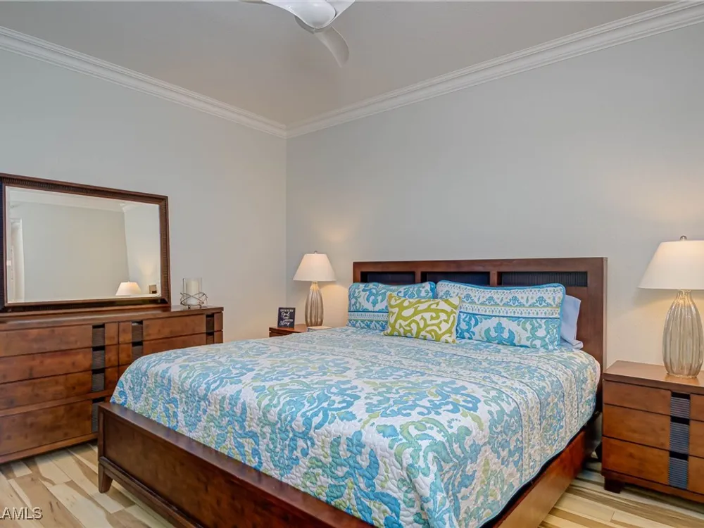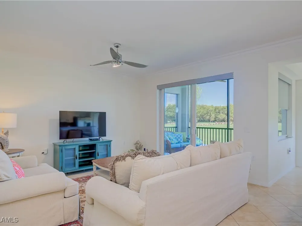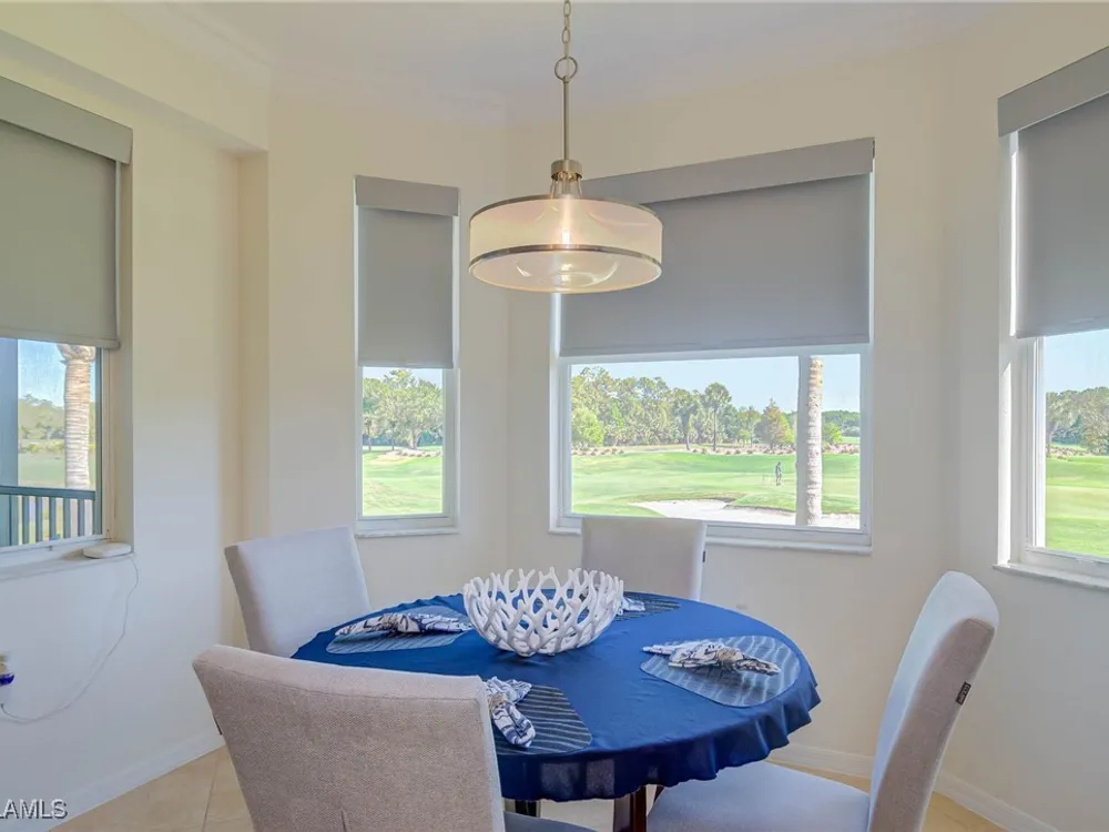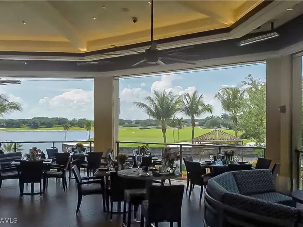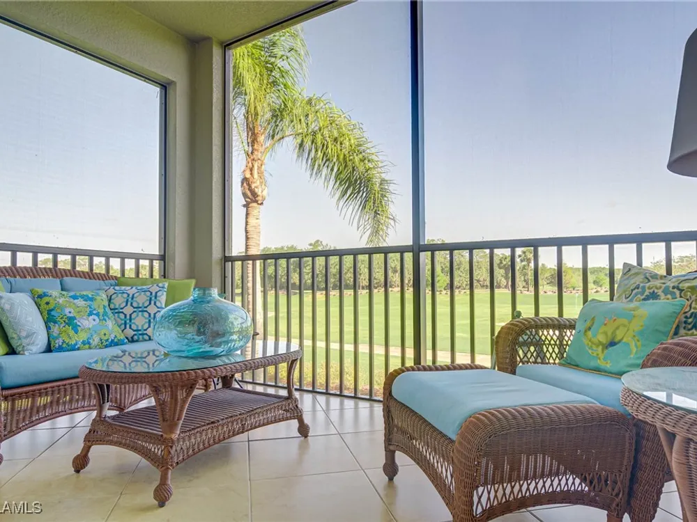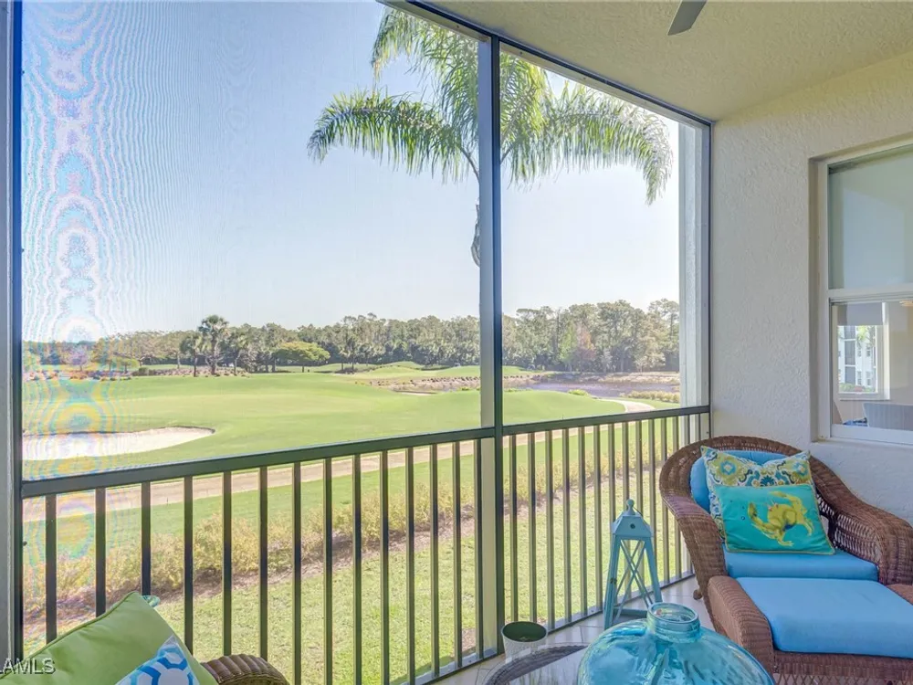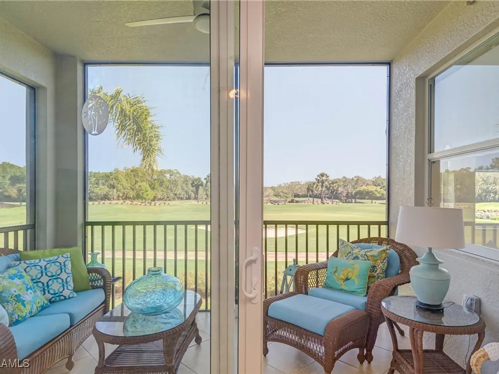 This charming 2-bedroom, 2-bathroom condominium offers 1,232 square feet of comfortable living space With REMARKABLE and STUNNING VIEWS of the 13th green and beyond. TURNKEY FURNISHED AND DECORATED, this BROOKSIDE MODEL has many upgrades including crown molding in every room, updated light fitures and ceiling fans , plantation shudders,solar shades in kitchen and remote control on rear sliding door to the lanai. Luxury laminate flooring in bedrooms ( NO CARPET ) The screened entry and lanai are tiled, enhancing the outdoor living experience. Residents of Heritage Bay enjoy a wealth of amenities, including a golf course, clubhouse,2 restaurants. fitness center, pool, spa, tennis courts,pickleball and bocce The property is conveniently located near top-rated schools, shopping, dining, and the beautiful beaches of Naples.