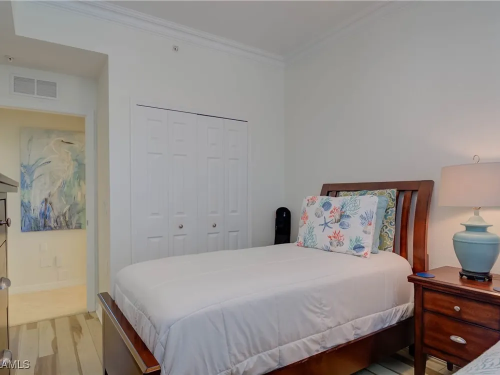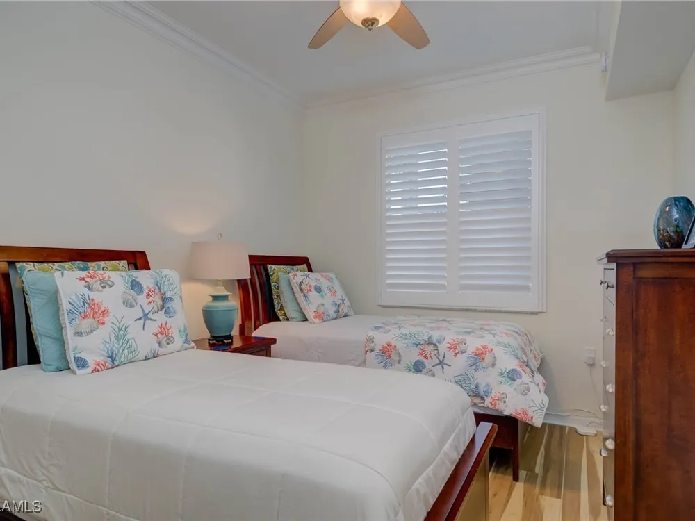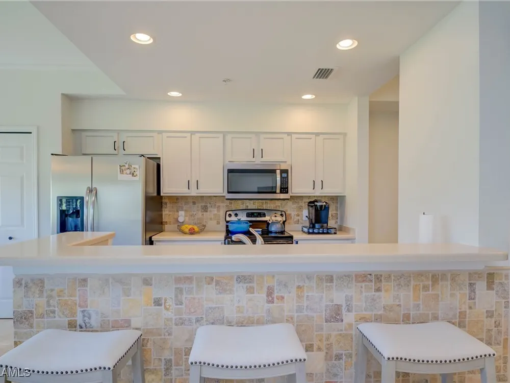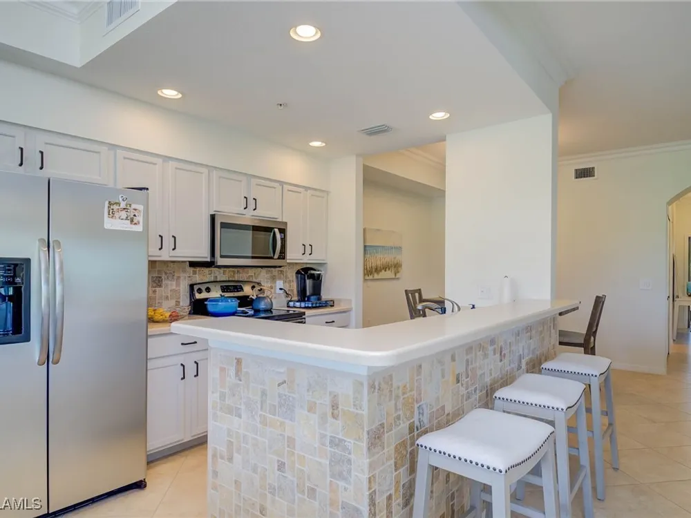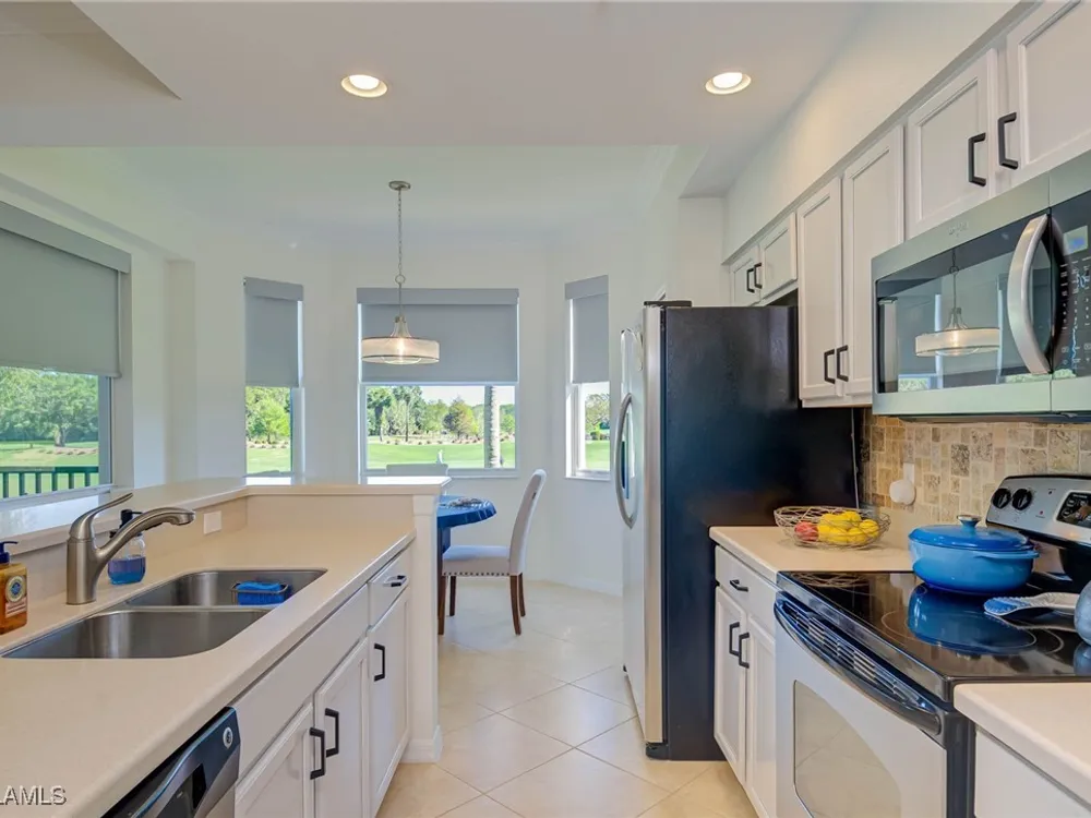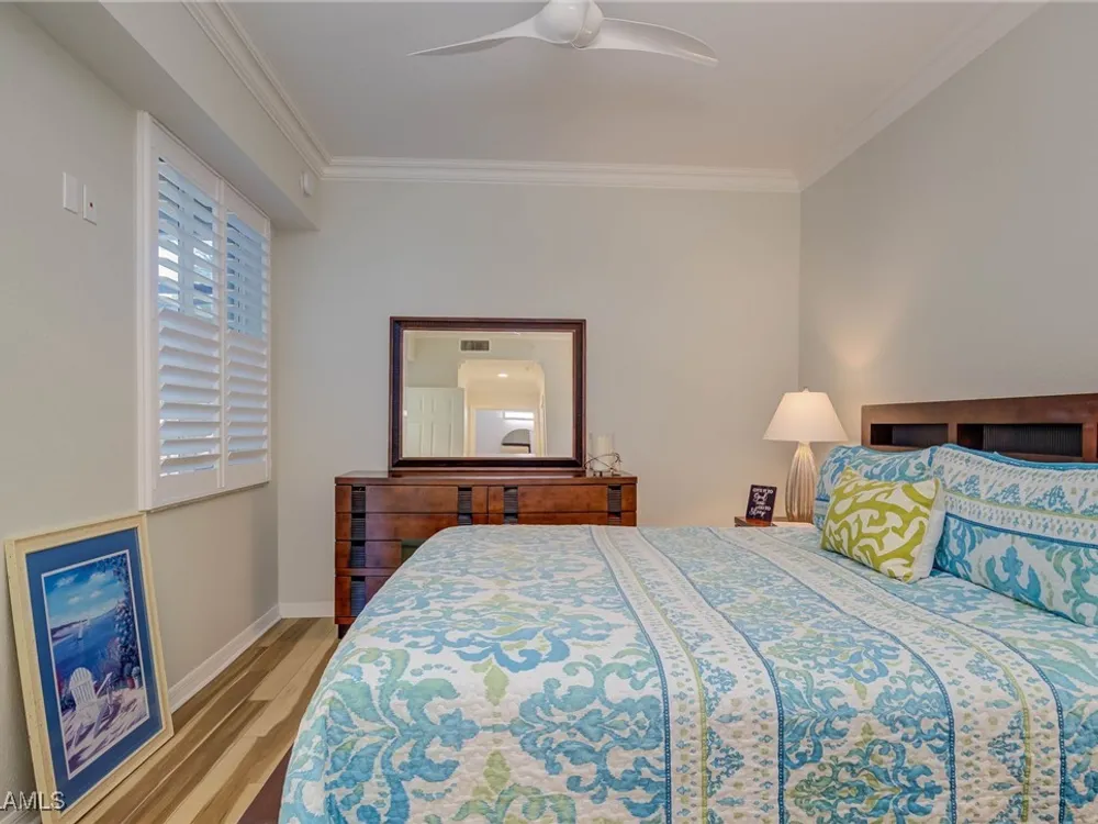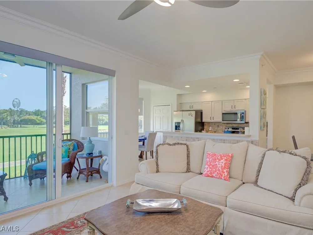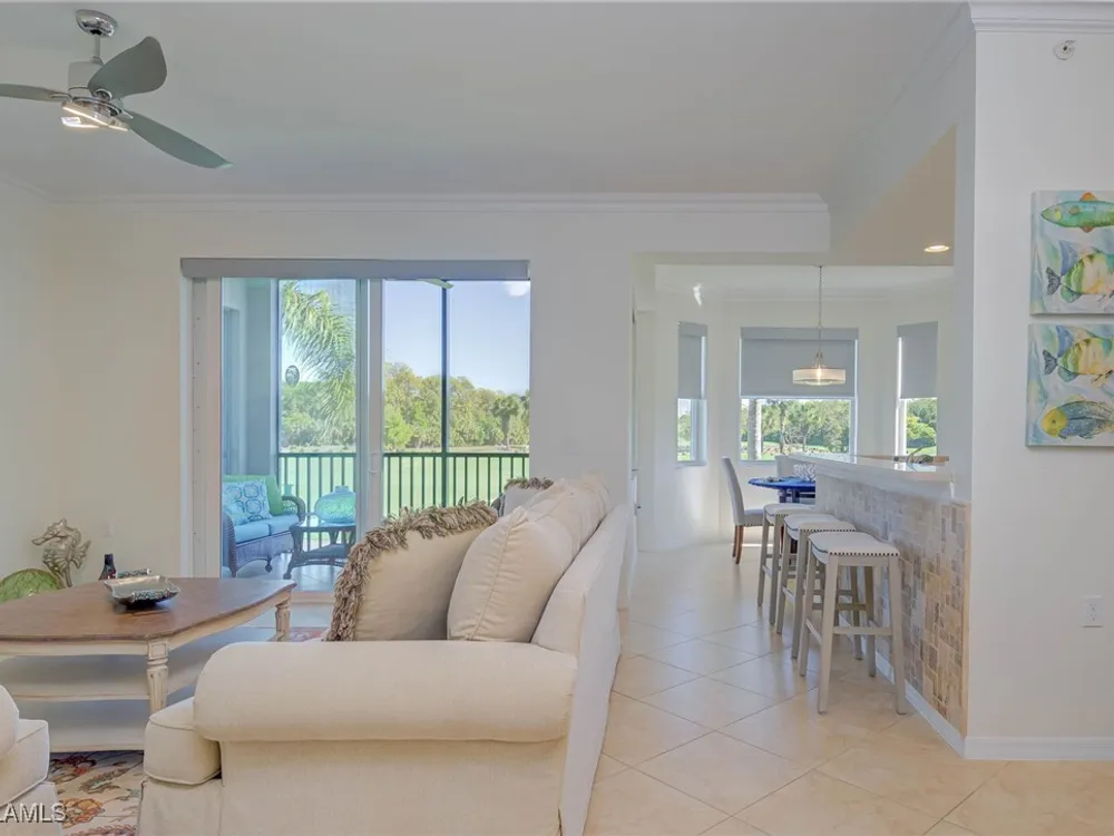 This charming 2-bedroom, 2-bathroom condominium offers 1,232 square feet of comfortable living space With REMARKABLE and STUNNING VIEWS of the 13th green and beyond. TURNKEY FURNISHED AND DECORATED, this BROOKSIDE MODEL has many upgrades including crown molding in every room, updated light fitures and ceiling fans , plantation shudders,solar shades in kitchen and remote control on rear sliding door to the lanai. Luxury laminate flooring in bedrooms ( NO CARPET ) The screened entry and lanai are tiled, enhancing the outdoor living experience. Residents of Heritage Bay enjoy a wealth of amenities, including a golf course, clubhouse,2 restaurants. fitness center, pool, spa, tennis courts,pickleball and bocce The property is conveniently located near top-rated schools, shopping, dining, and the beautiful beaches of Naples.