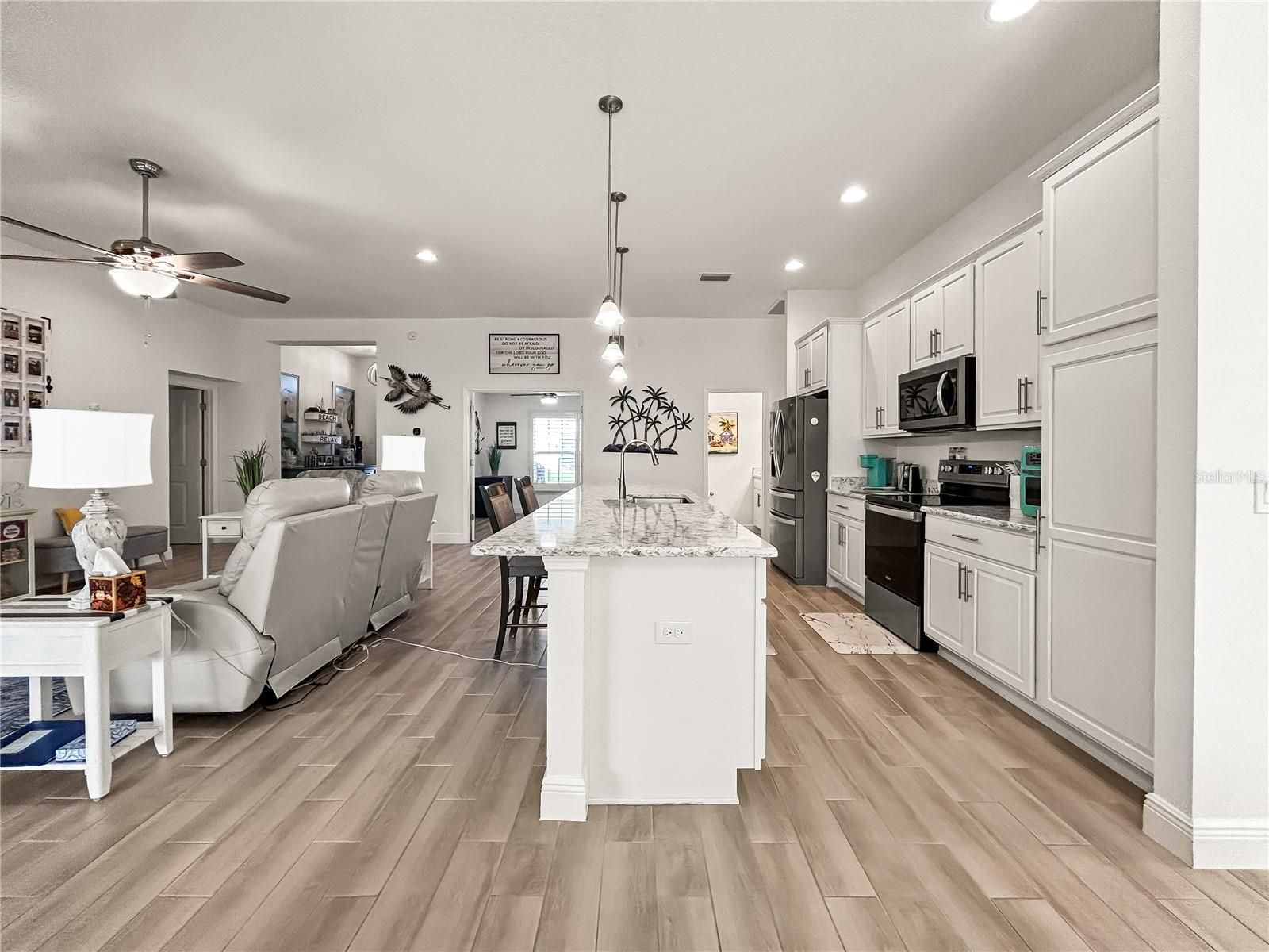 NOTE...PRICE IMPROVEMENT....A MUST SEE....Located in the sought-after Lakeside Landings community, this stunning residence offers the epitome of modern living. Upon entering, you are greeted by an expansive open-concept layout adorned with high ceilings, creating an airy and inviting atmosphere. Modern kitchen is located to the left of the home as you enter through the front door and portrays a generously sized island perfect for entertaining guests or enjoying casual family meals. With four bedrooms and two and a half bathrooms, this residence provides ample space for both relaxation and productivity. Separate your guests by closing off the barn door to the wing and let the guests enjoy their privacy. And YOU too!! The primary bedroom offers ample space, an en suite bathroom with dual sinks, a vanity, a shower stall, and custom-designed walk-in closets. The home has been maintained beautifully and looks brand new. Windows contain Plantation Shutters, flooring is all decorative ceramic tile which has the appearance of wood. Convenient shopping and dining options are nearby. The home provides easy access to the Florida Turnpike, I-75, lakes, and state parks, allowing for various outdoor activities and adventures. Lakeside Landings offers resort-style living including a 13,000 SF clubhouse, two shimmering pools (a large one complete with a cascading waterfall feature and a smaller pool with a hot tub and spa), lighted tennis courts/pickleball courts, putting green, 140’ boat dock, picnic area on Lake Miona, playground area, dog park, card room, craft room, fitness center, library, cabana bar and grill, banquet hall with a dance floor and catering kitchen. Come check out this beautiful home. It could pass as a model home right out of your favorite home decorating store.