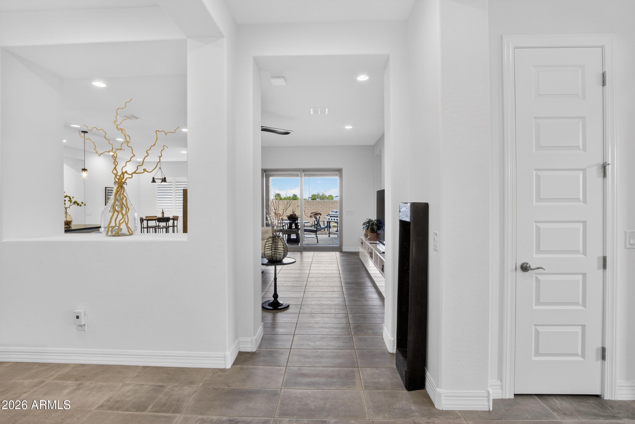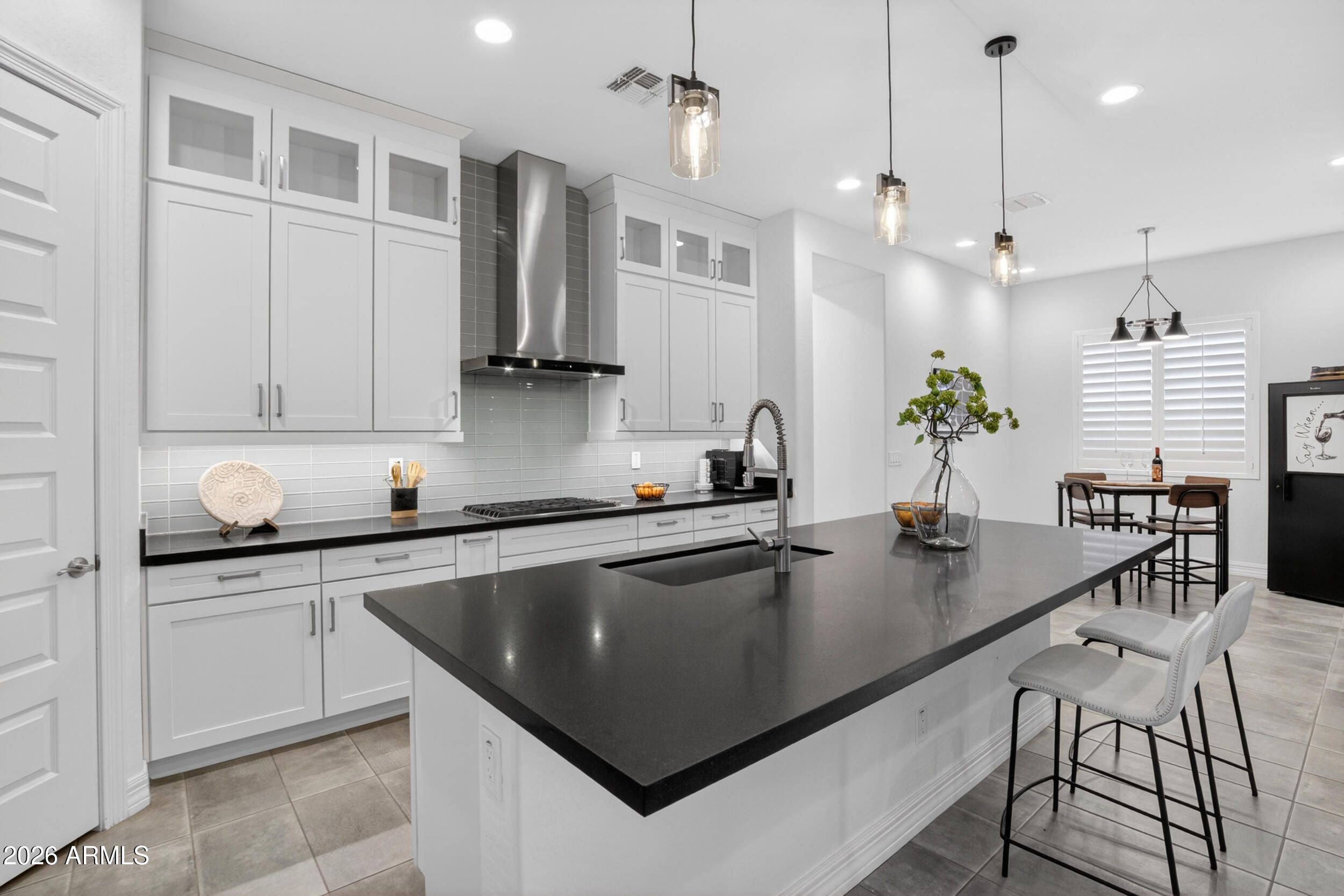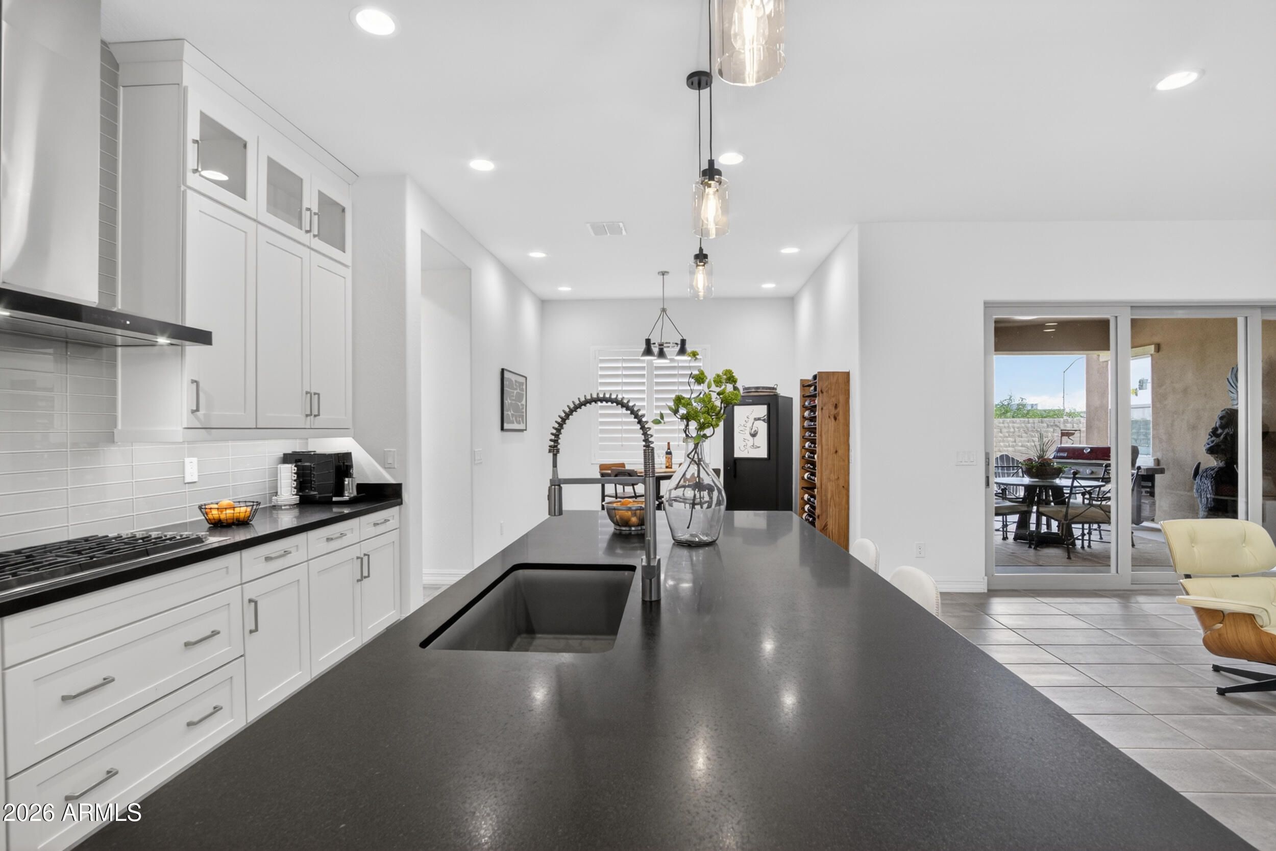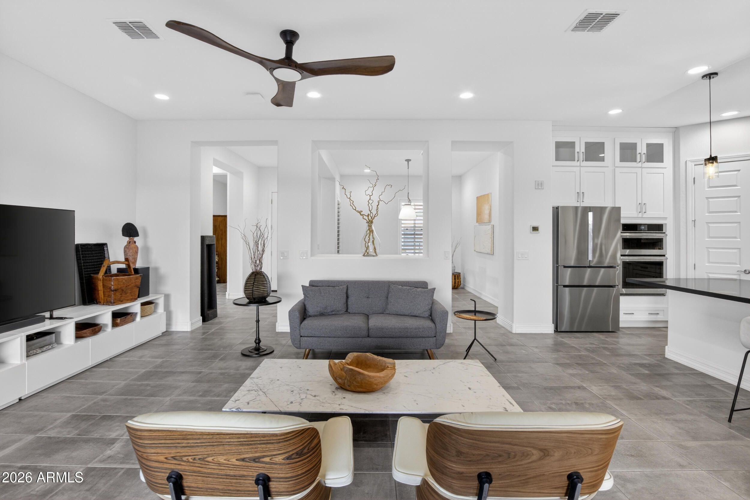 Experience the finest in living in this stunning, upgrade-rich home located in Encore at Eastmark, a premier 55+ community. Imported tile flooring creates a seamless flow throughout. The modern kitchen features dark honed granite countertops, a six burner gas cooktop, stainless steel vent with custom tile surround, and gorgeous cabinets that extend to 10-ft ceilings. A 12-ft sliding glass door fills the spacious great room with natural light and blends indoor-outdoor living. The primary suite offers a spa-like bath with soaking tub, custom tiled shower, and separate water closet. The large, private lot showcases low-maintenance desert landscaping, allowing you to fully enjoy Encore's amenities, including a café, newly redesigned pool, outdoor sports, and many exciting activities.