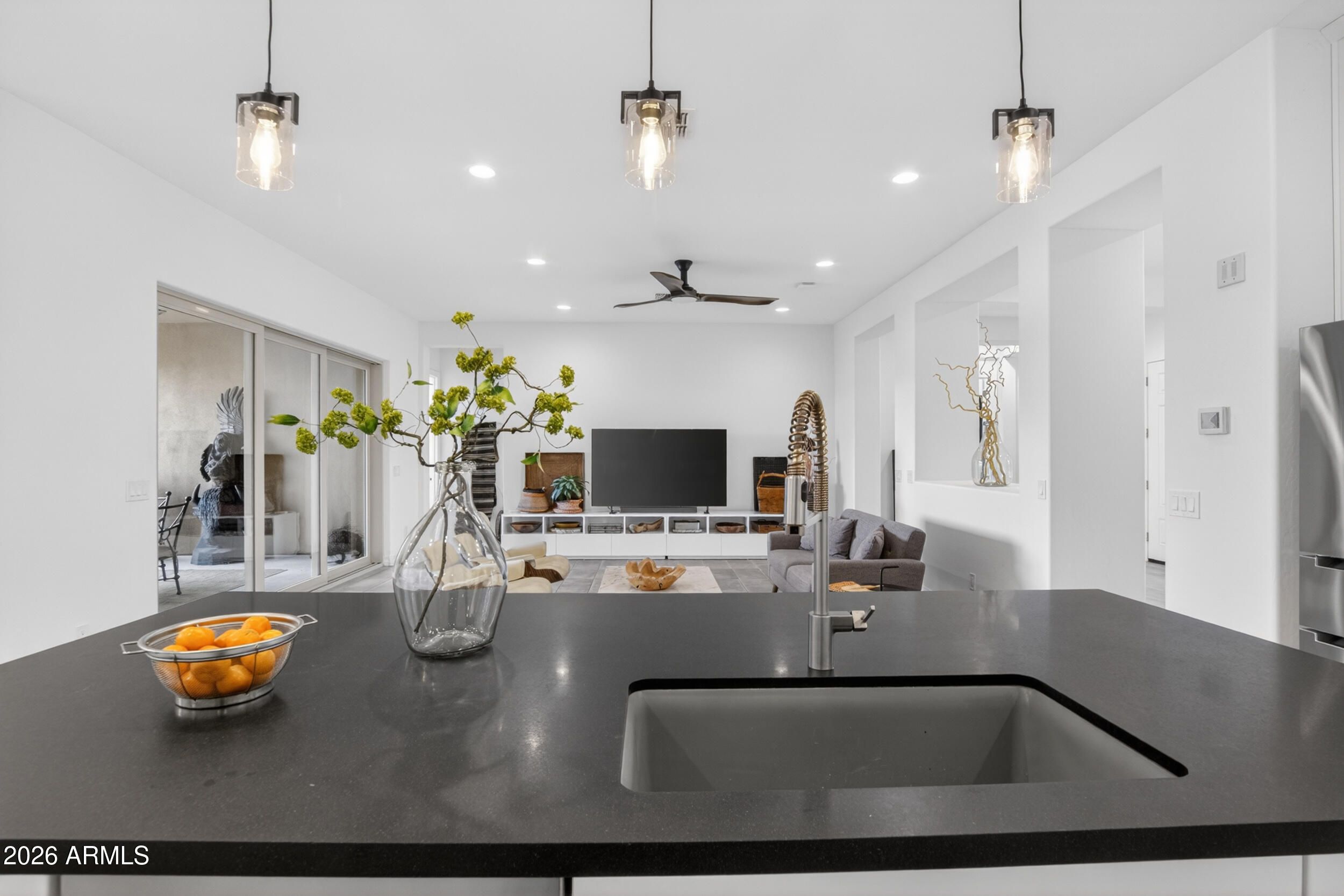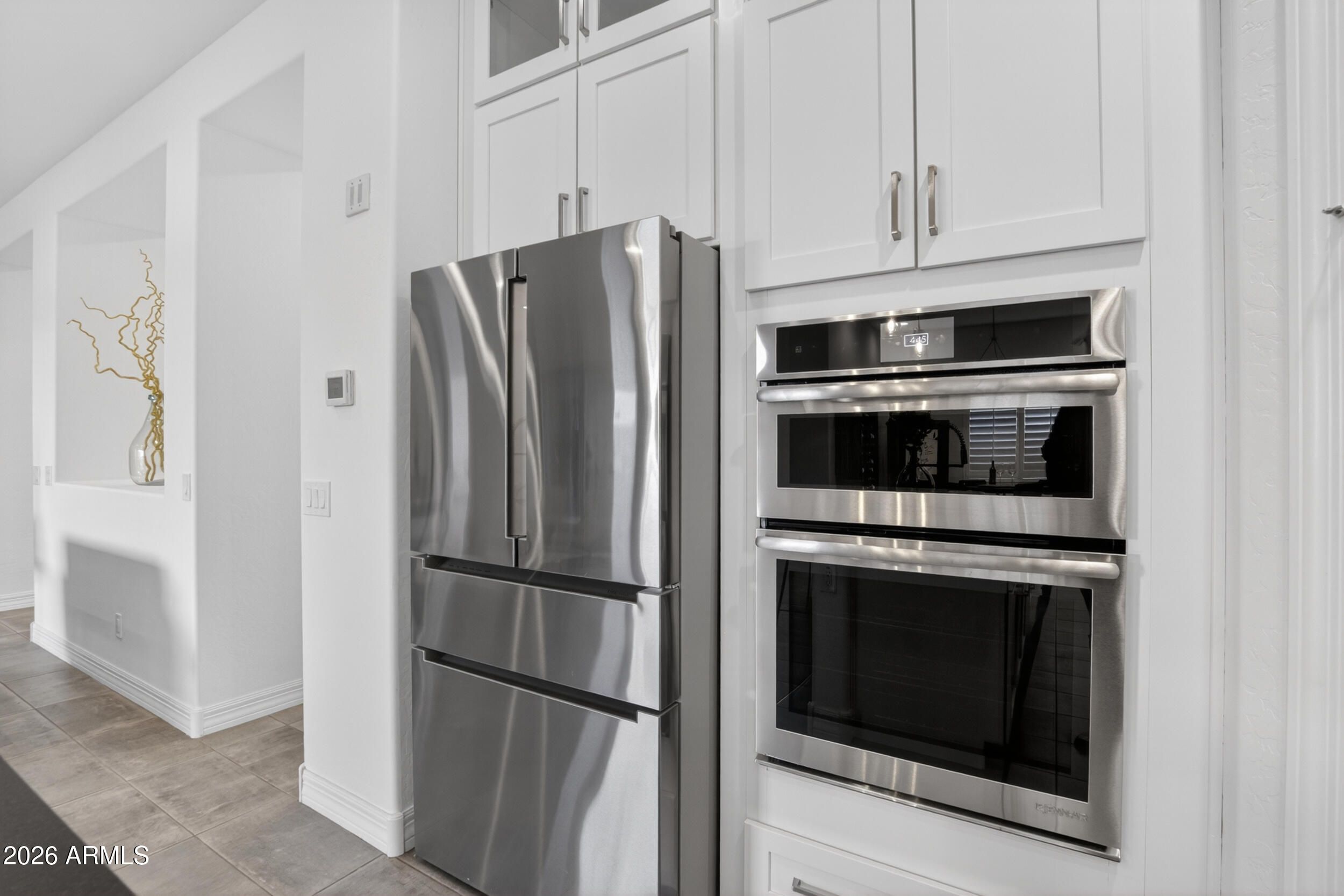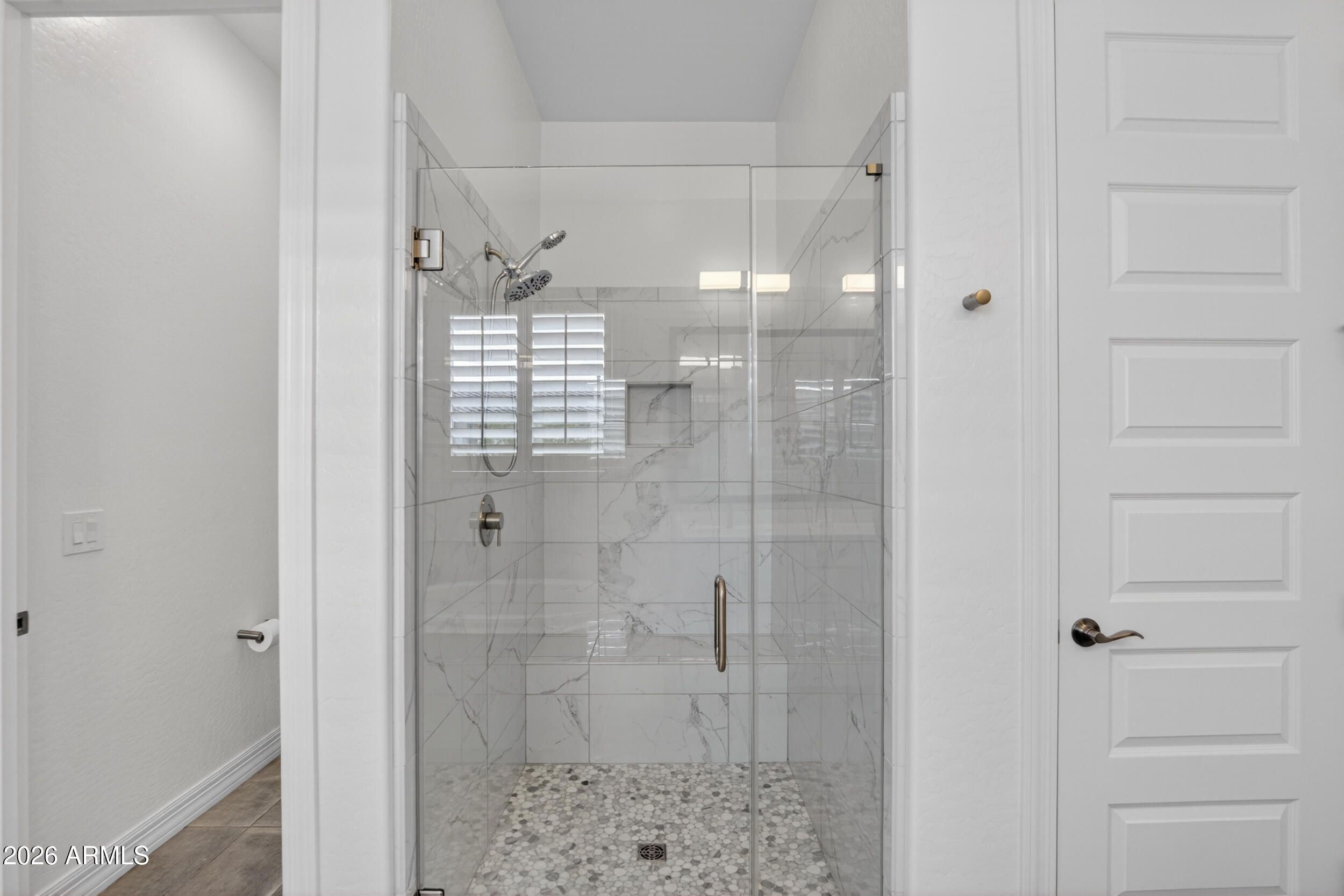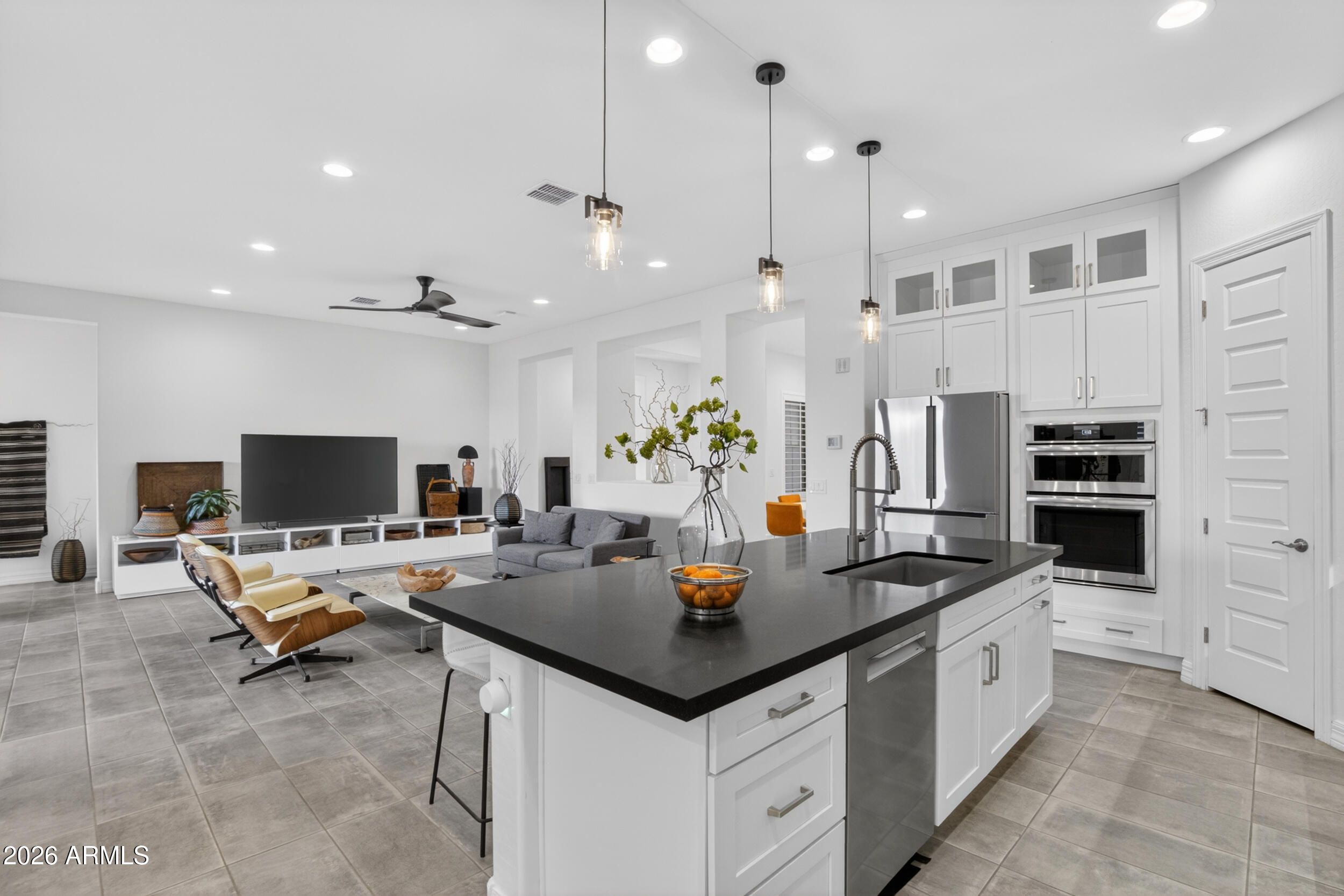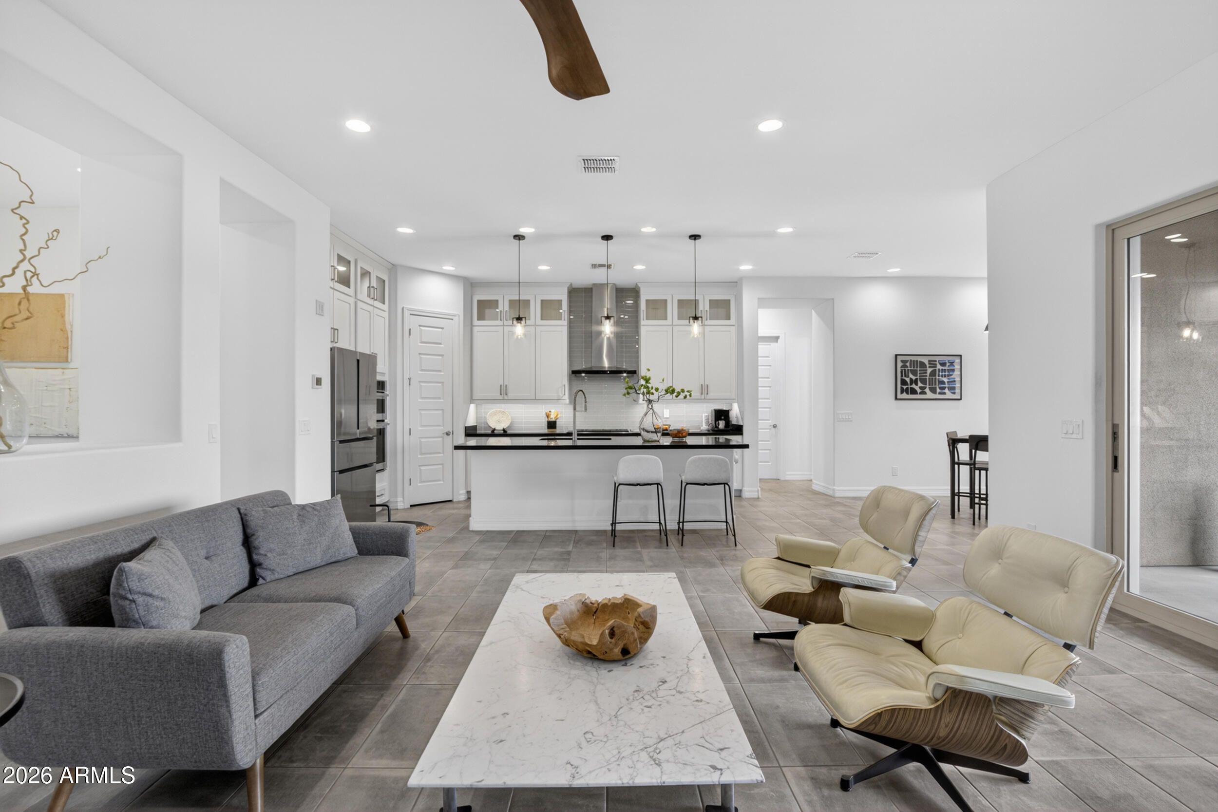 Experience the finest in living in this stunning, upgrade-rich home located in Encore at Eastmark, a premier 55+ community. Imported tile flooring creates a seamless flow throughout. The modern kitchen features dark honed granite countertops, a six burner gas cooktop, stainless steel vent with custom tile surround, and gorgeous cabinets that extend to 10-ft ceilings. A 12-ft sliding glass door fills the spacious great room with natural light and blends indoor-outdoor living. The primary suite offers a spa-like bath with soaking tub, custom tiled shower, and separate water closet. The large, private lot showcases low-maintenance desert landscaping, allowing you to fully enjoy Encore's amenities, including a café, newly redesigned pool, outdoor sports, and many exciting activities.
