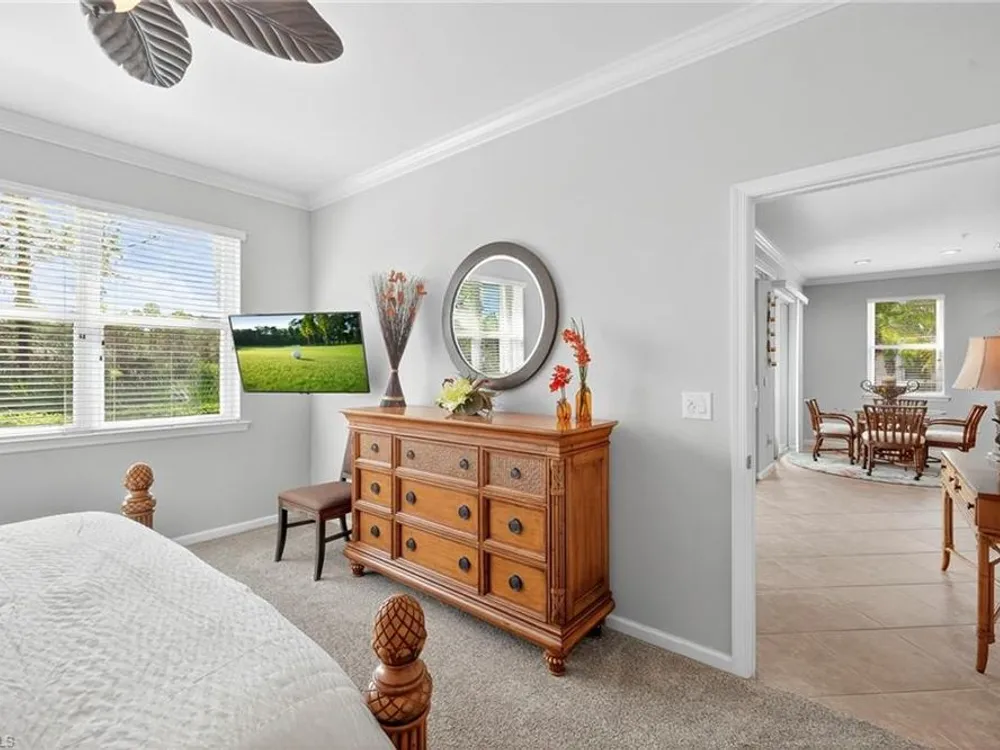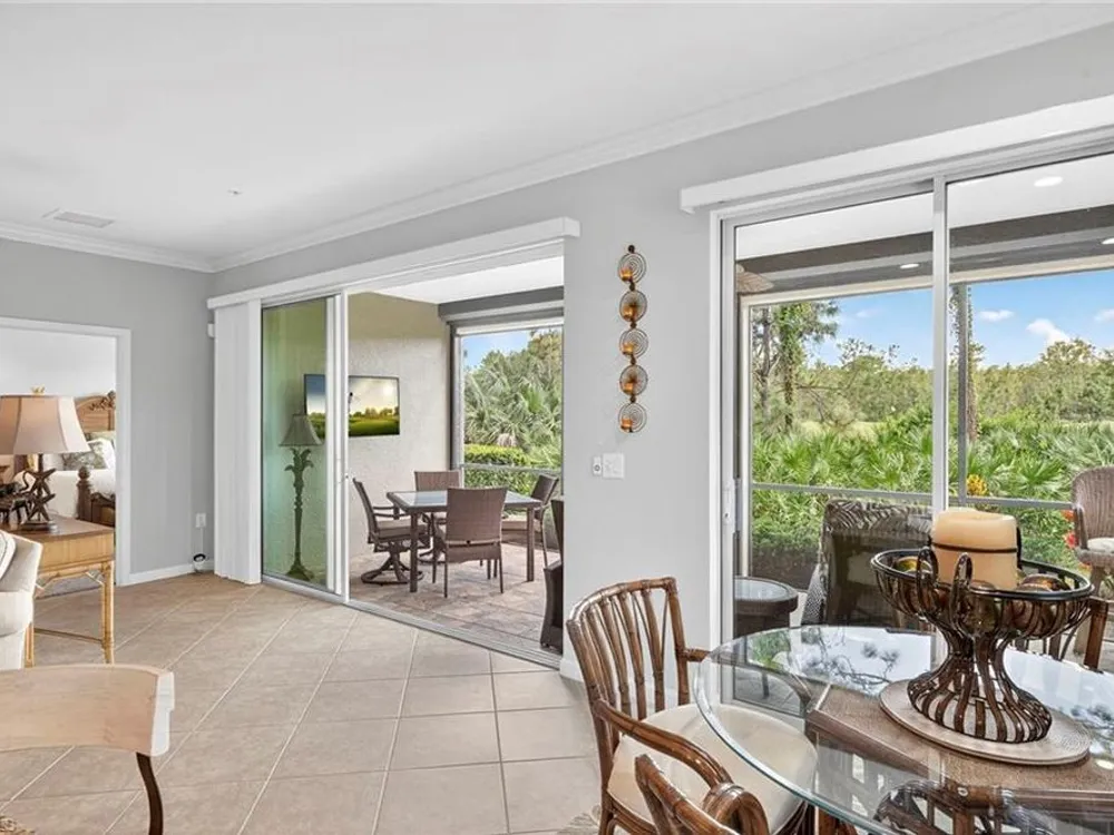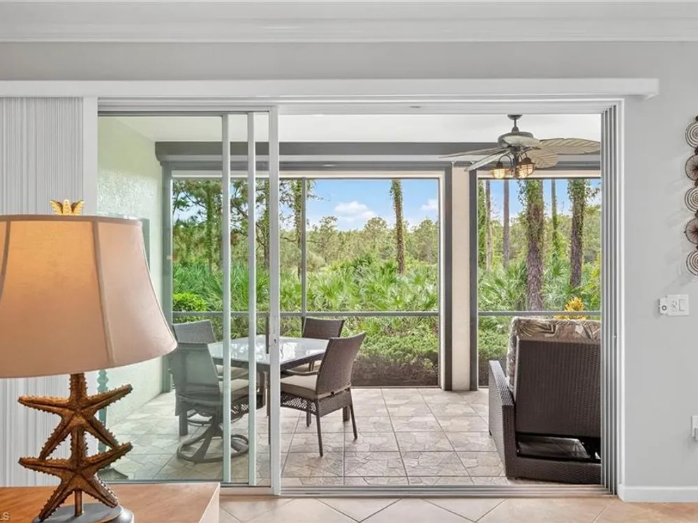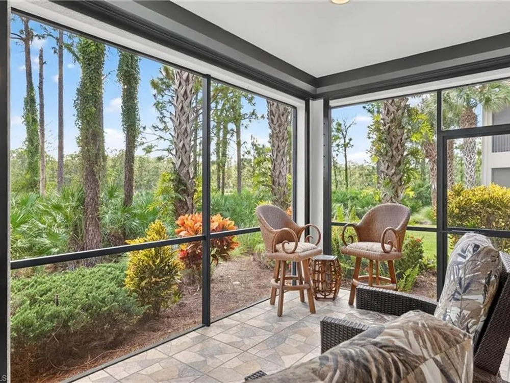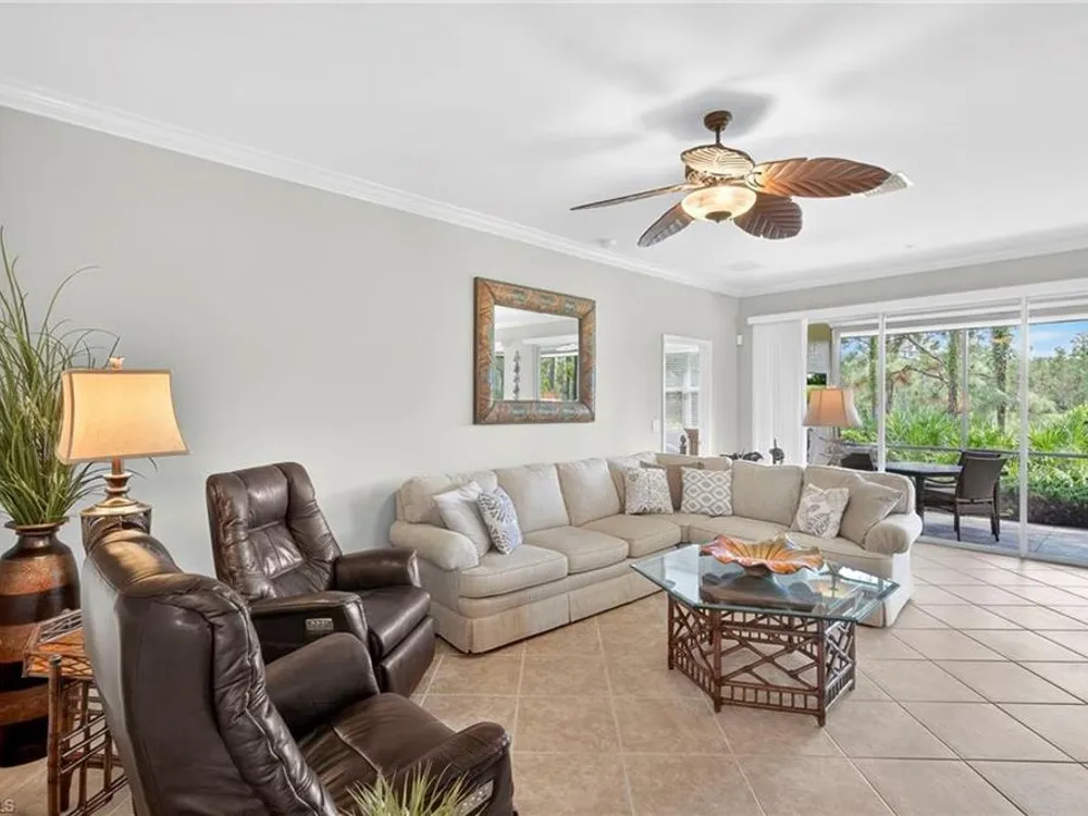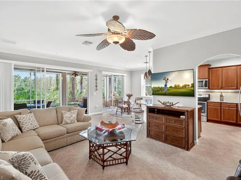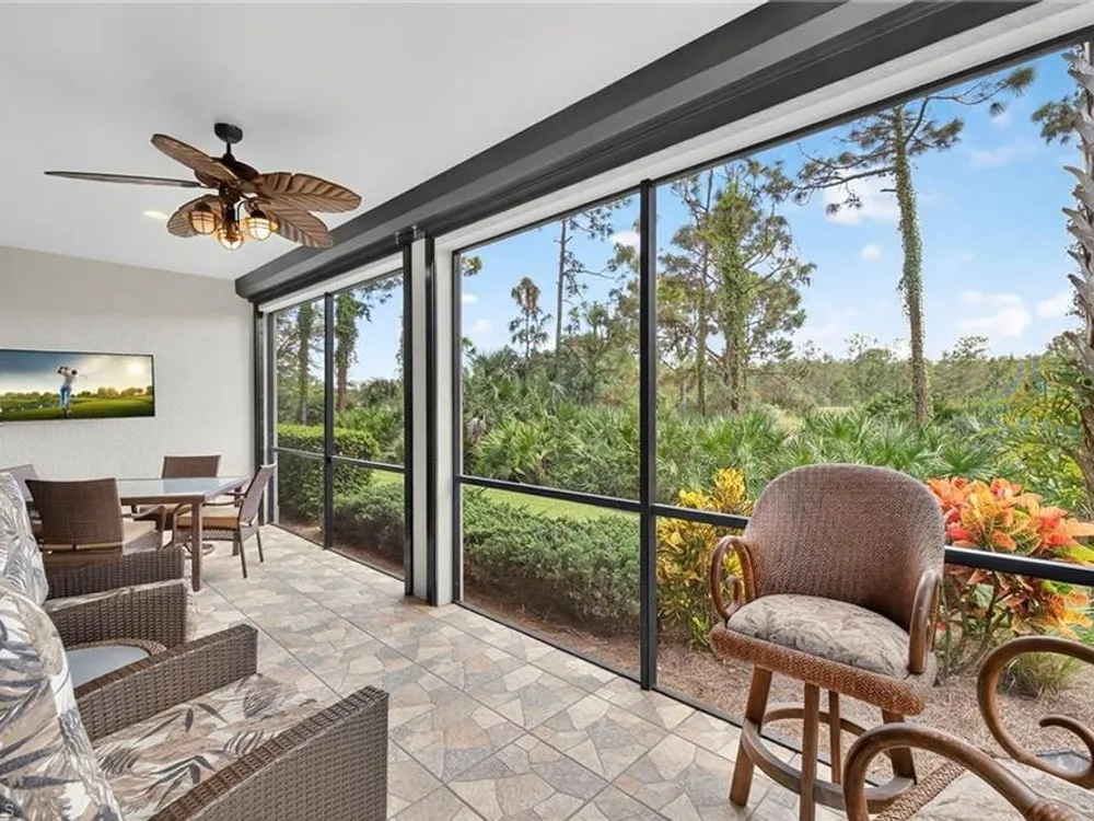 1ST-FLOOR TURNKEY CARRIAGE HOME Golf Views, Hurricane Protection, Upgrades Galore! This immaculate 1st-floor carriage home offers a view of the 8th green and comes fully turnkey furnished (2012) — just bring your suitcase and start enjoying the Florida lifestyle. Featuring 3 bedrooms, 2 baths, and an attached 2-car garage, this home is designed for effortless living and seasonal ease.The open-concept layout includes a spacious great room, breakfast bar, kitchen nook, and two sets of sliders leading to a screened-in lanai with tile flooring and a serene golf course backdrop. Whether you're sipping coffee or unwinding with a book, the patio offers a peaceful retreat in a quiet, well-kept neighborhood.The kitchen is designed with quartz countertops, tile backsplash, and upgraded appliances. The primary suite features a walk-in closet, oversized soaking tub, glass-enclosed walk-in shower, and split vanities. Hurricane protection includes electric roll-down shutters on the lanai, impact glass front door, and accordion shutters on all windows.Upgrades include a new A/C (2020), new hot water heater (2020), freshly painted interior, crown molding, designer glass door inserts, radon reduction system, security system, LED lighting, four mounted TVs for effortless entertaining, custom storage cabinets in the garage and epoxy-coated floor.Best of all, this home is not located in a flood zone. HOA fees cover cable, high-speed internet, lawn care, landscaping, pest control, water, trash, exterior insurance, and maintenance — making seasonal or full-time living truly carefree.Located in Somerset at The Plantation Golf & Country Club, a gated community offering tennis, pickleball, bocce, fitness center, resort-style pool and spa, and a variety of social clubs and activities. The Plantation Golf & Country Club features a Hurdzan-Fry championship 18-hole golf course, clubhouse, and restaurant. Golf and social memberships are optional, giving you the flexibility to enjoy amenities your way.Conveniently located near I-75, shopping, dining, RSW airport, and Gulf beaches. Whether you're escaping the cold or settling into sunshine, this fully furnished, move-in-ready home delivers comfort, connection, and carefree living.