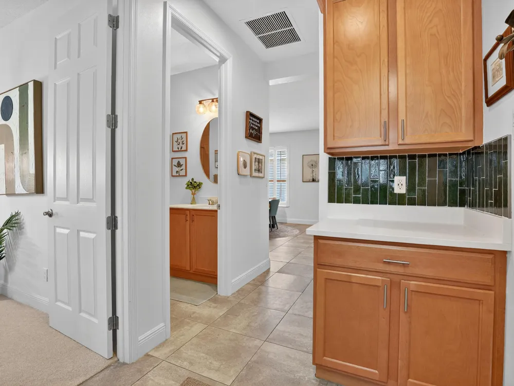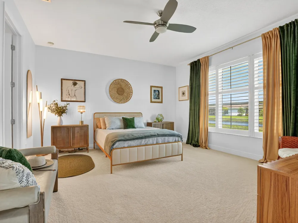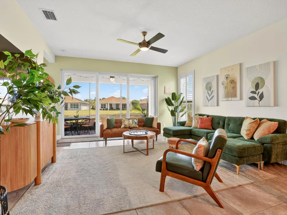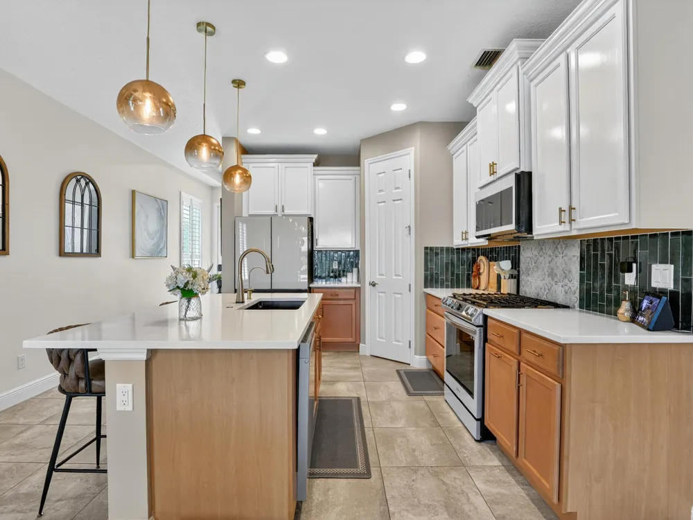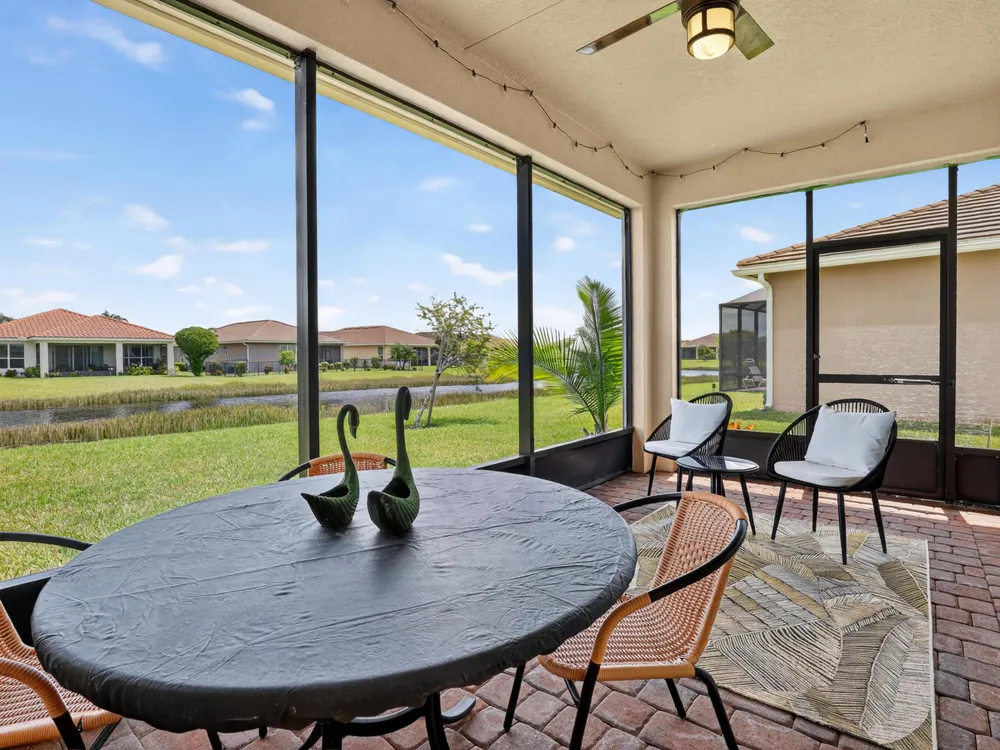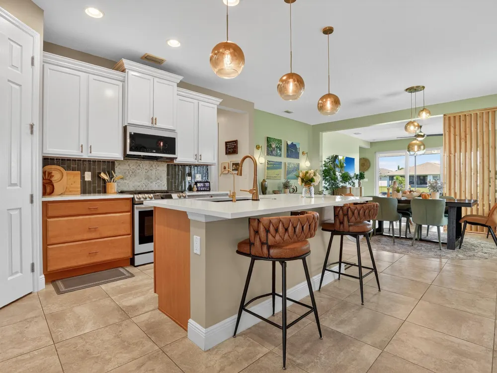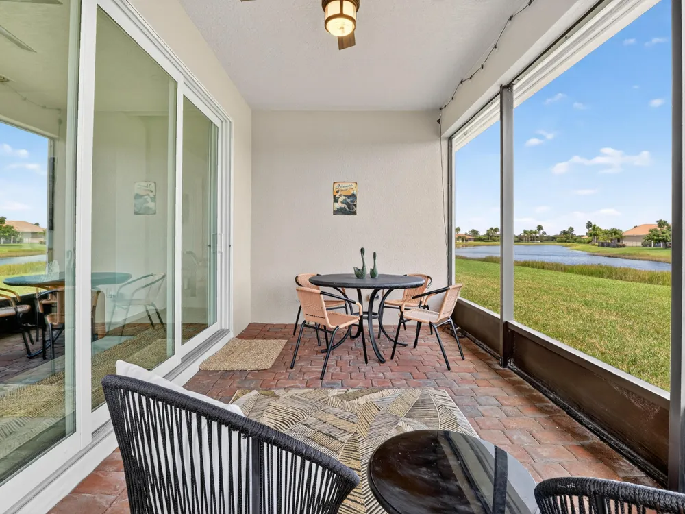 This residence in the amenity rich community of Vitalia combines comfort, functionality, and modern elegance. This home is offered FULLY FURNISHED. The kitchen features upgraded glass-front appliances, quartz countertops, oversized black granite sink, reverse osmosis, and contemporary lighting. A custom pantry with beverage center and wine cooler adds convenience. Dining area with mid-century lighting opens to the living room with serene water views. Primary suite offers new carpet (Aug 2025), remodeled bath with modern tile, and customized walk-in closet with built-ins. Secondary bedroom includes tailored closet system. With warm tones and thoughtful updates, this move-in ready home offers style and tranquility.