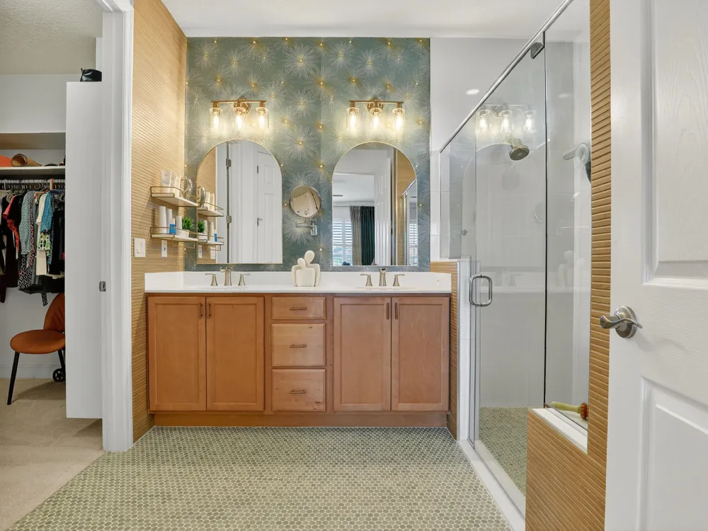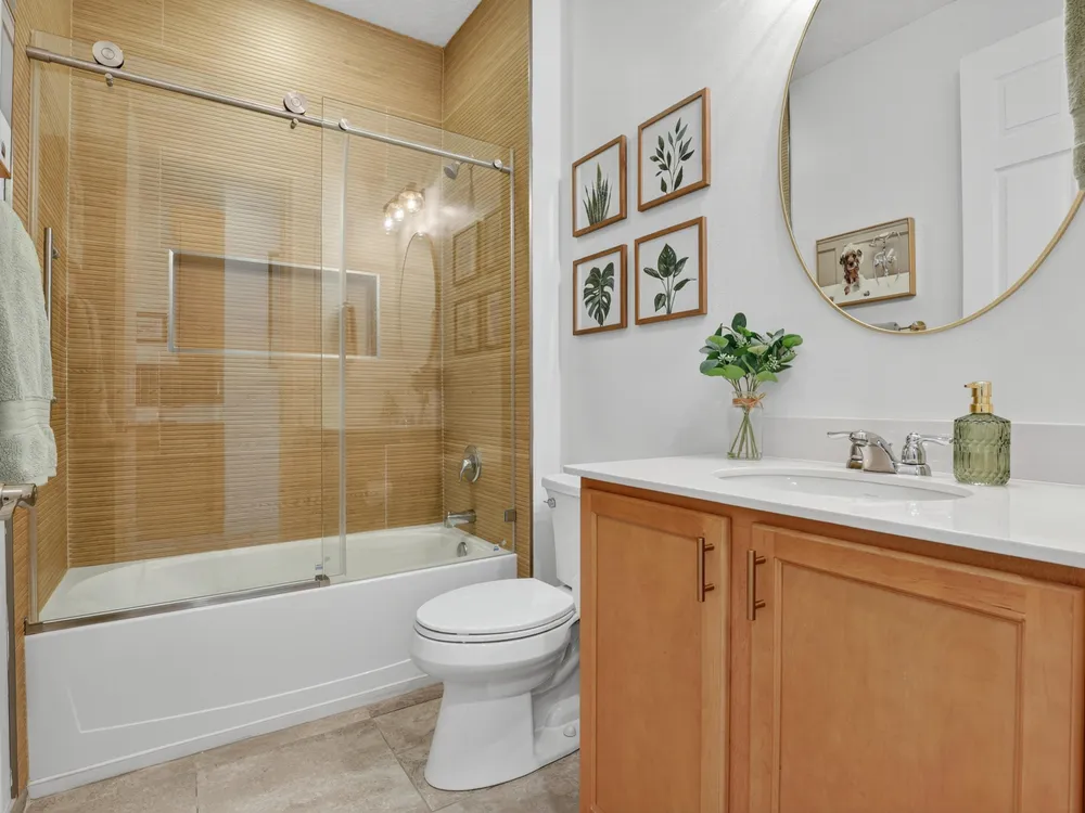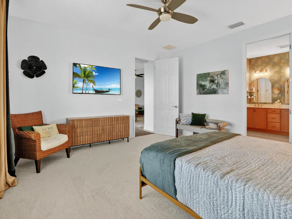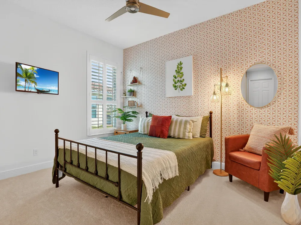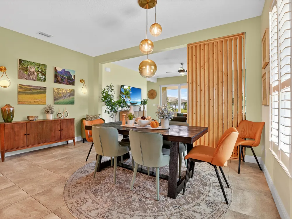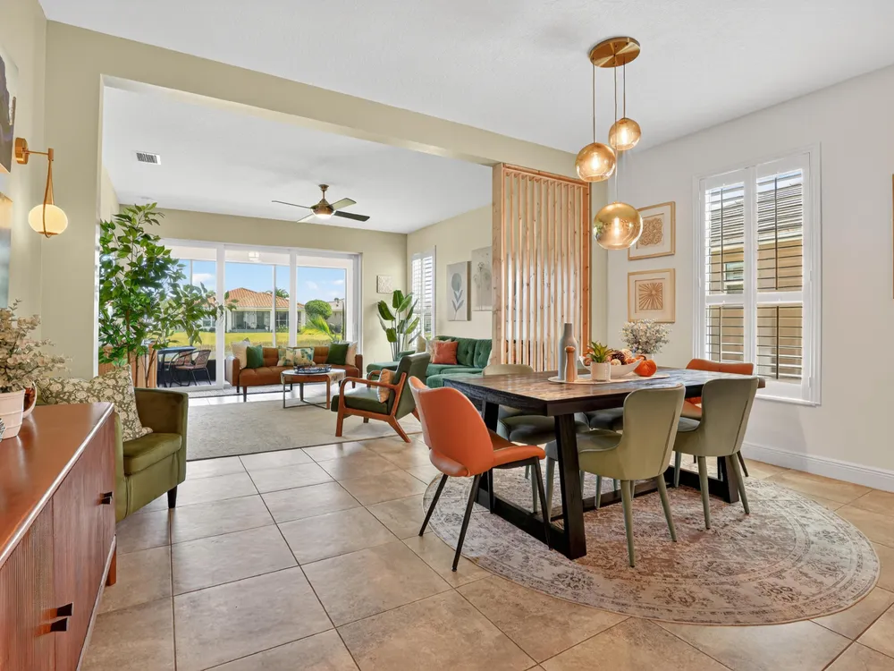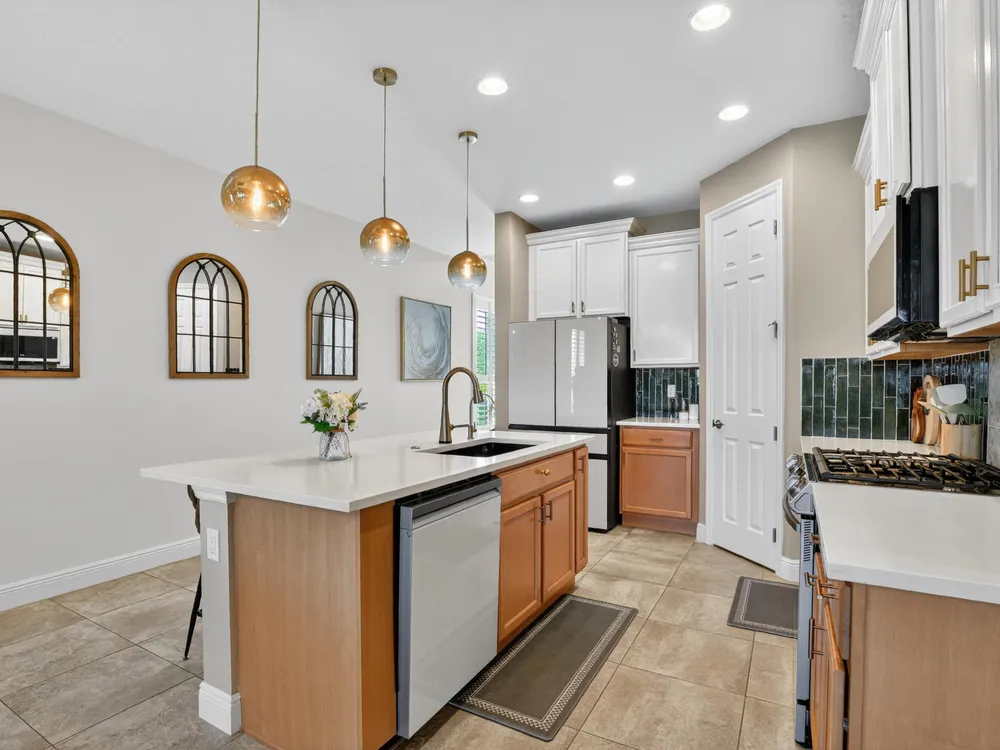 This residence in the amenity rich community of Vitalia combines comfort, functionality, and modern elegance. This home is offered FULLY FURNISHED. The kitchen features upgraded glass-front appliances, quartz countertops, oversized black granite sink, reverse osmosis, and contemporary lighting. A custom pantry with beverage center and wine cooler adds convenience. Dining area with mid-century lighting opens to the living room with serene water views. Primary suite offers new carpet (Aug 2025), remodeled bath with modern tile, and customized walk-in closet with built-ins. Secondary bedroom includes tailored closet system. With warm tones and thoughtful updates, this move-in ready home offers style and tranquility.