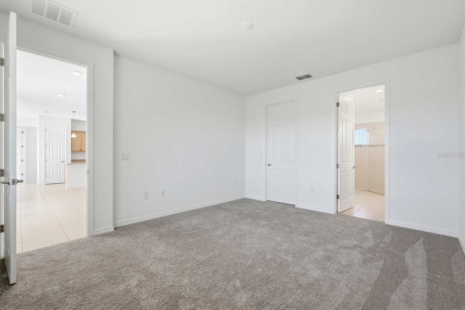 - Ceiling Fan(s), Eat-in Kitchen, High Ceilings, Living/Dining Room, Open Floorplan, Main Level Primary, Solid Surface Counters, Solid-Wood Cabinets, Split Bedrooms, Thermostat, Walk-In Closet(s)